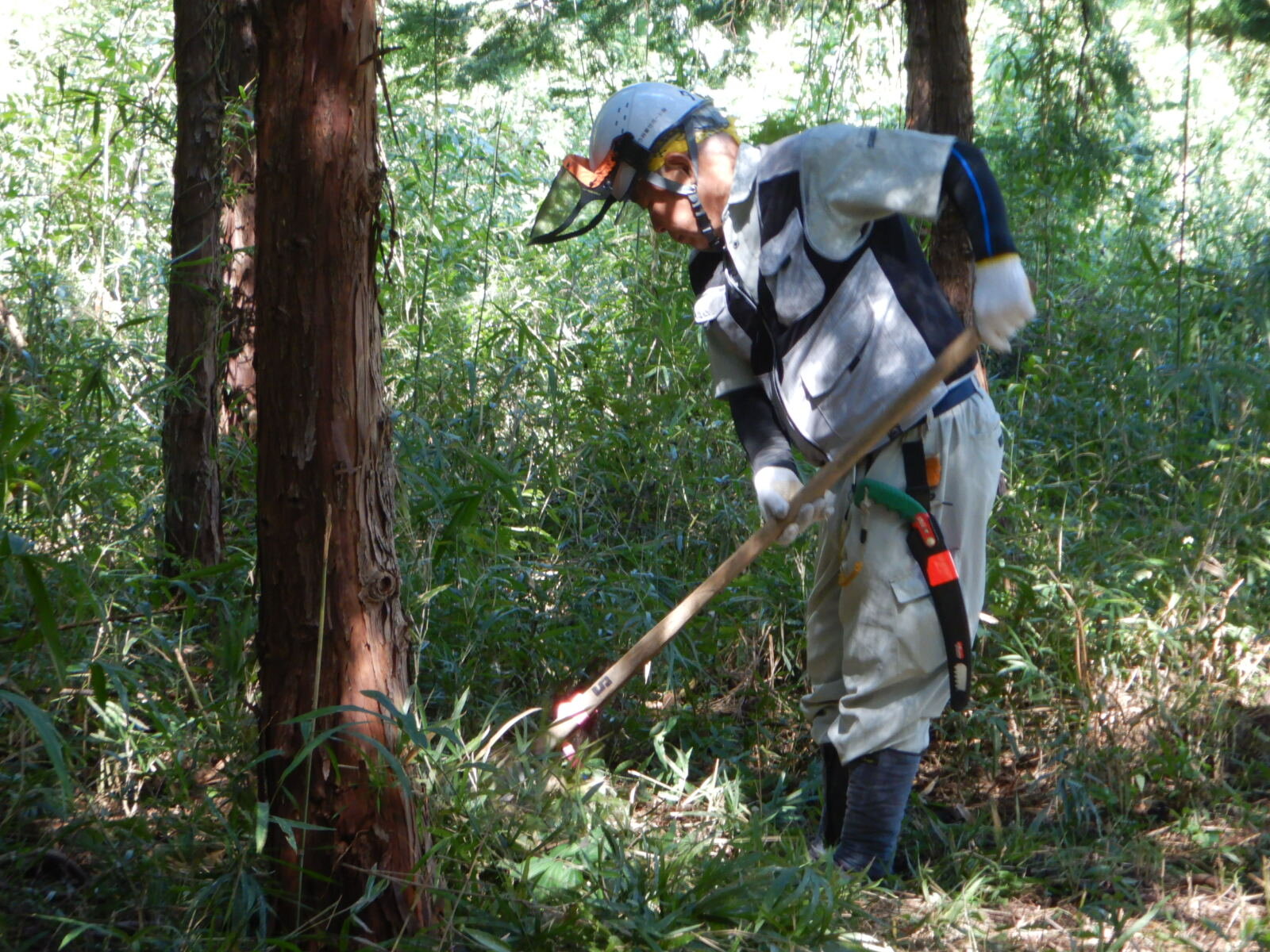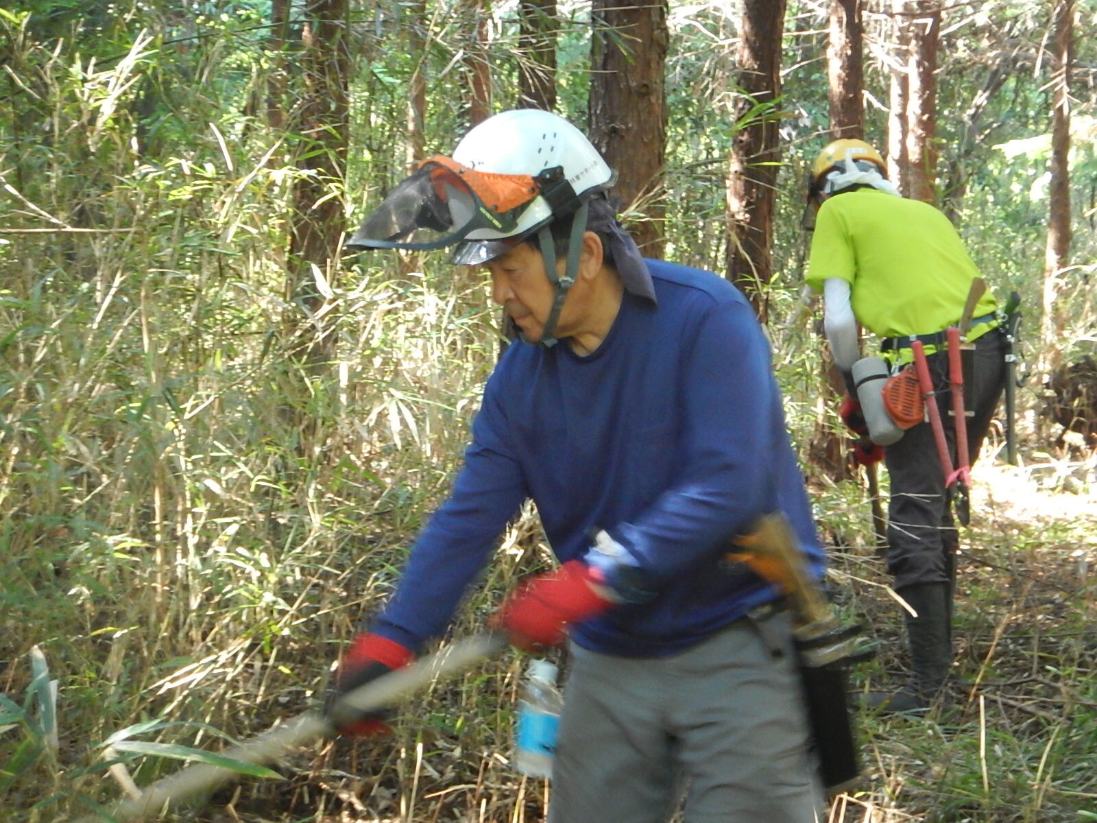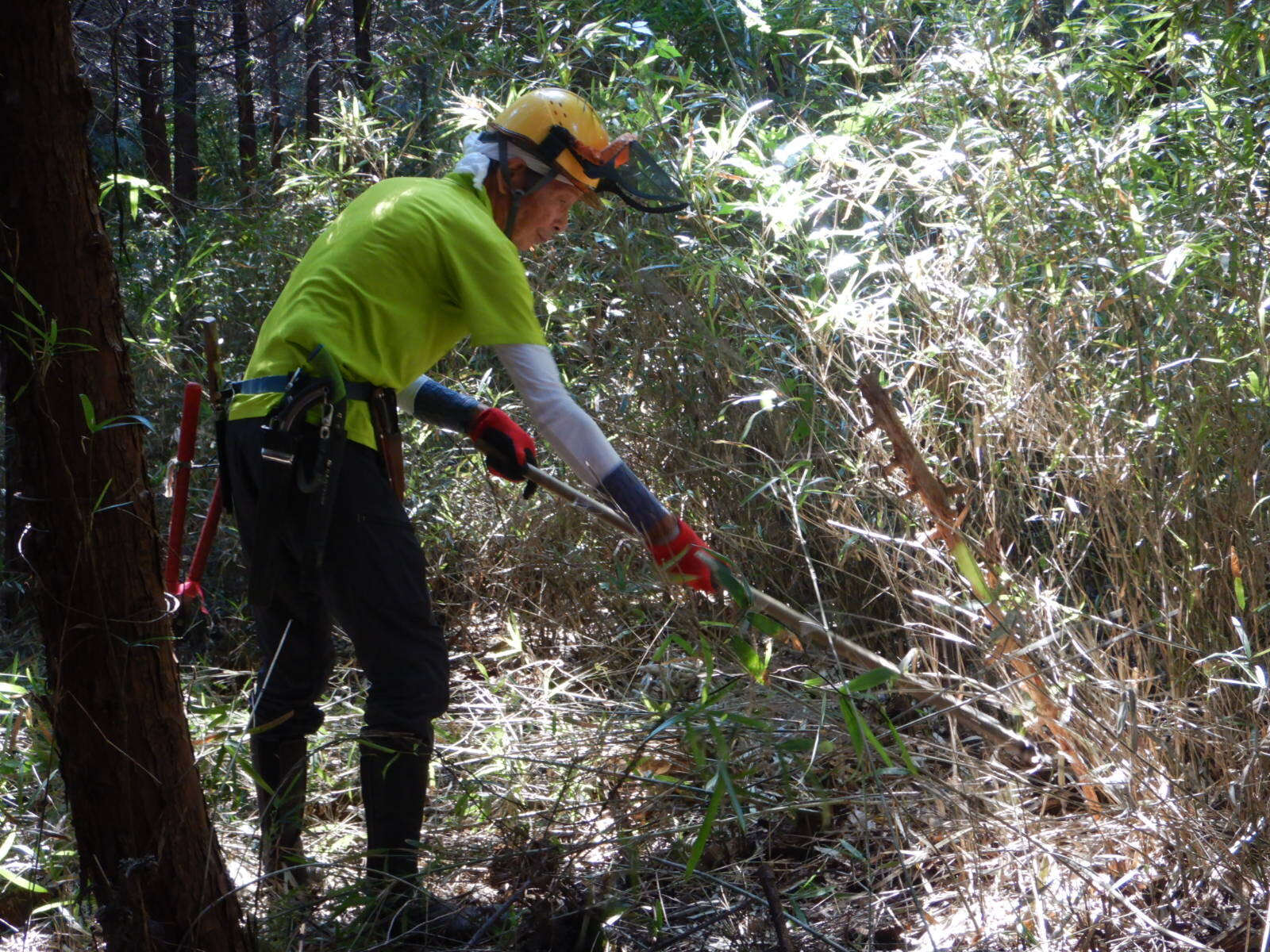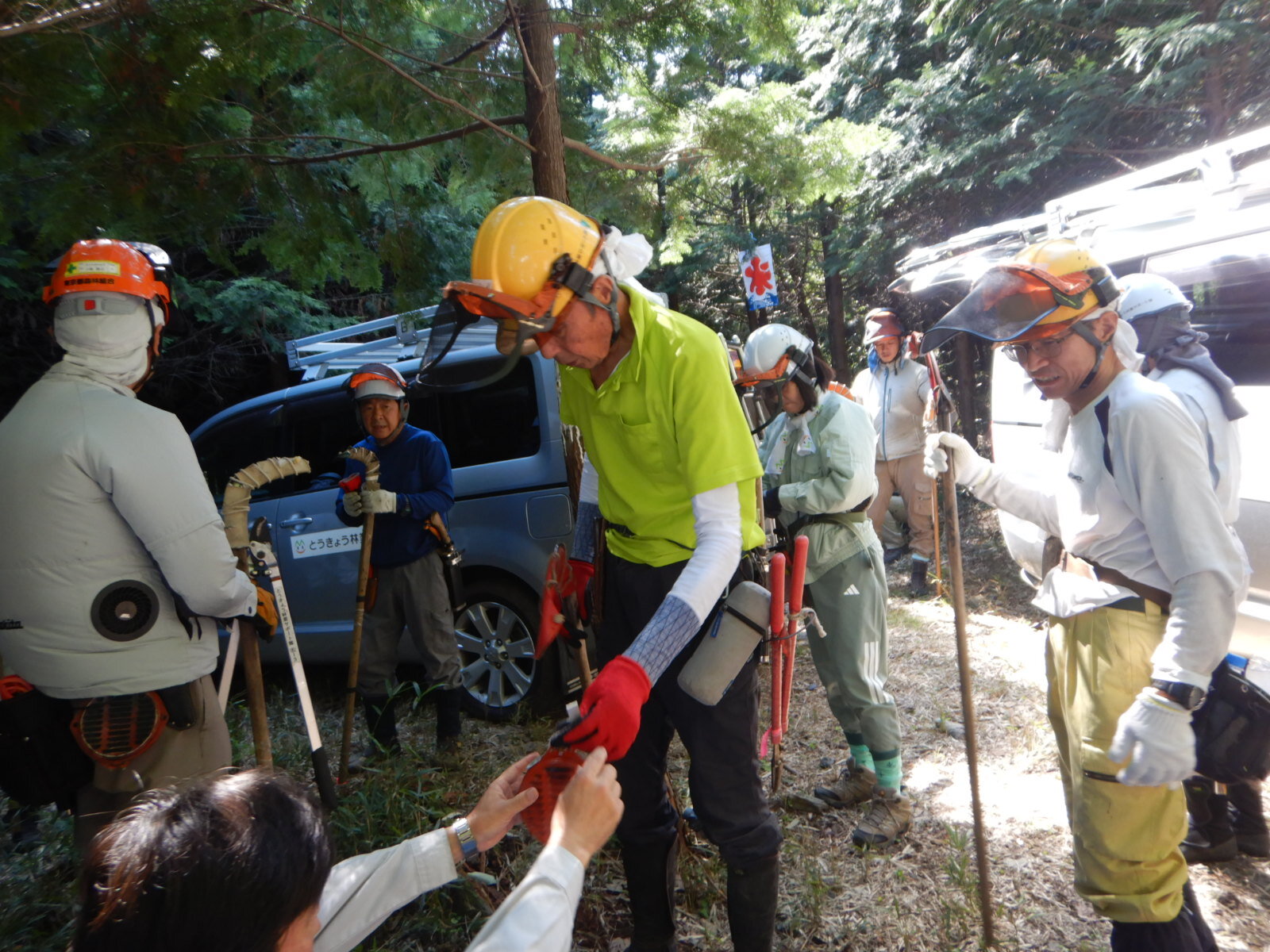 今日の作業では、使用工具として二丁差し・太枝切り鋏・剪定鋏・大鎌などを使います。防虫対策として森林香をメンバーの方に貸し出しています。