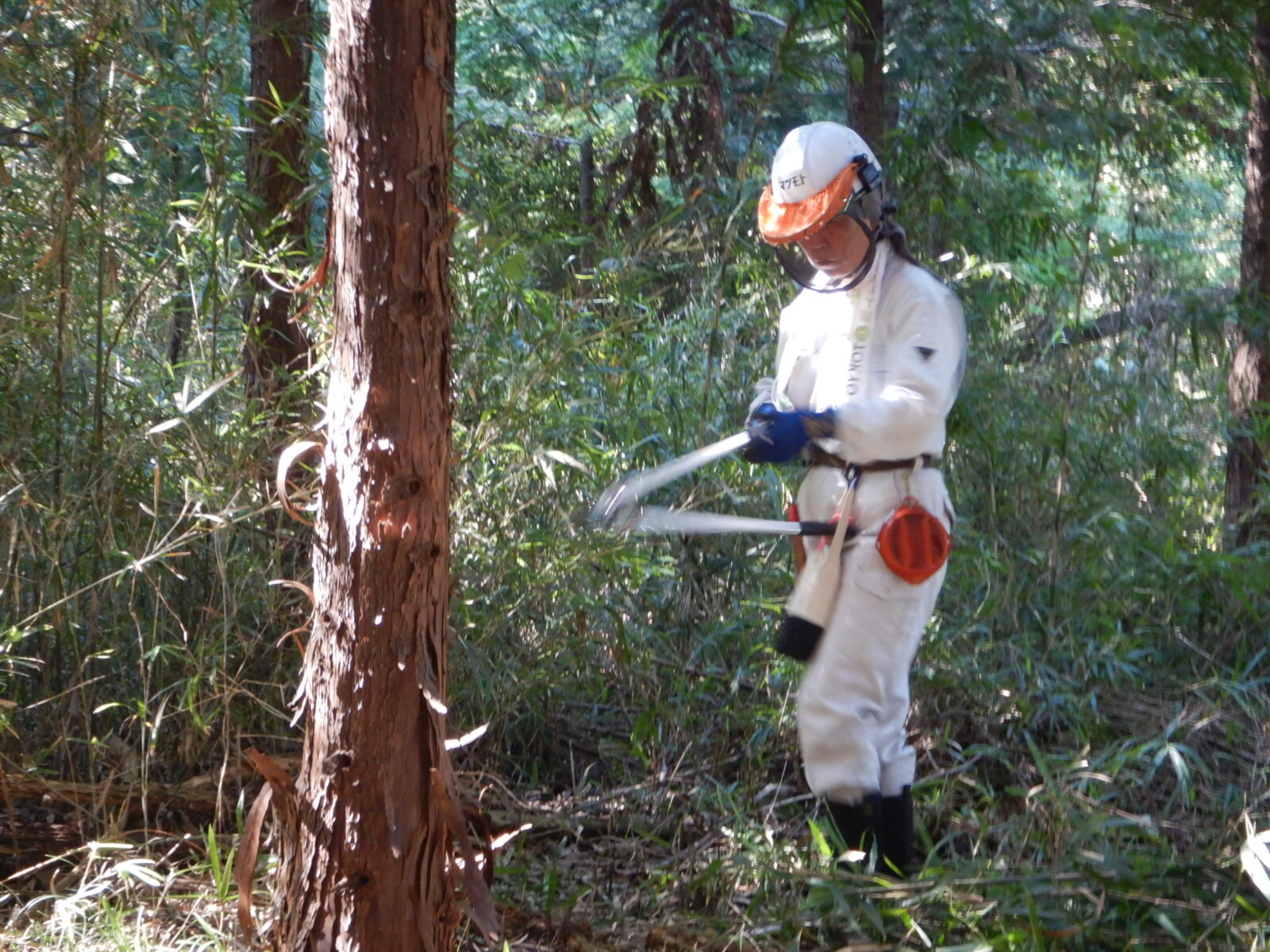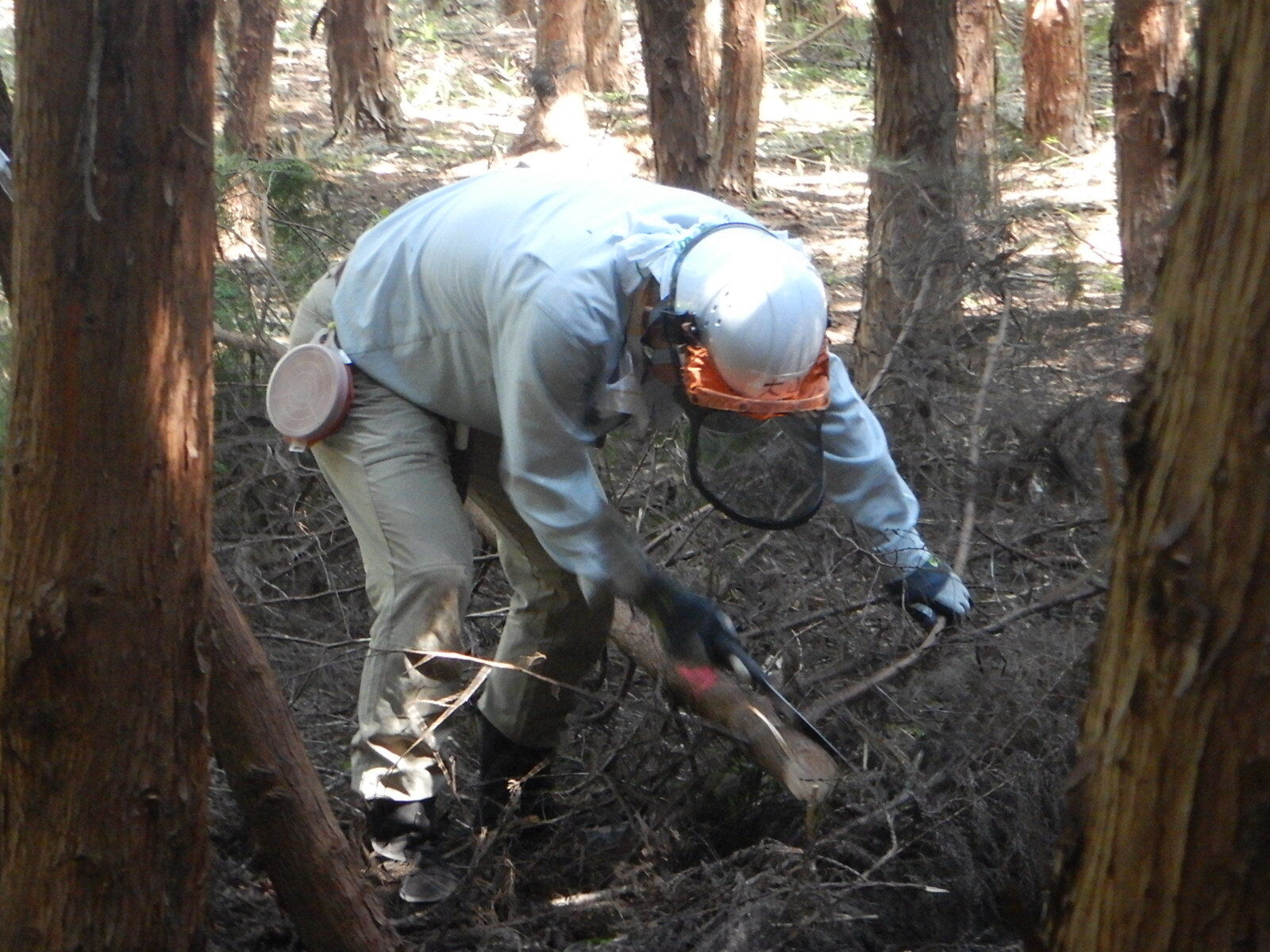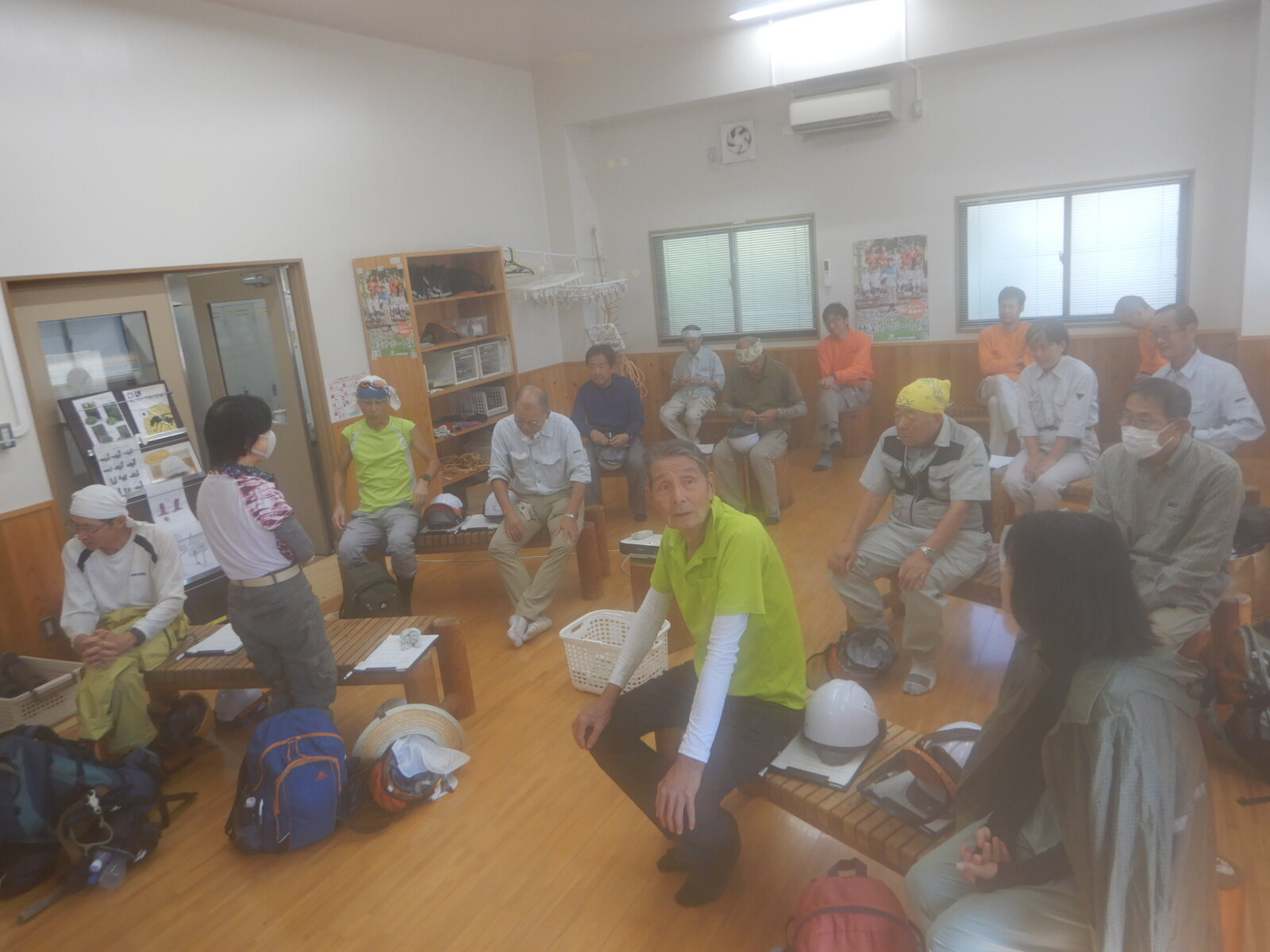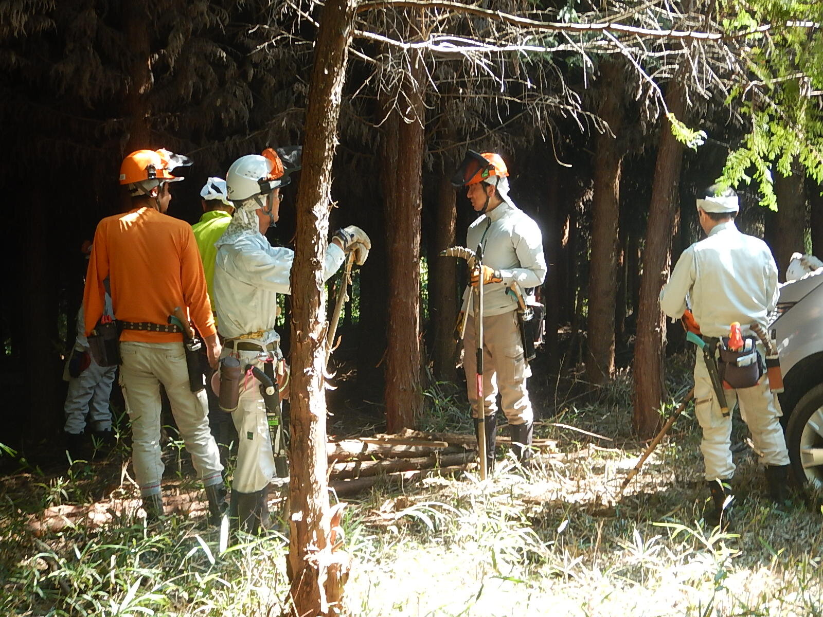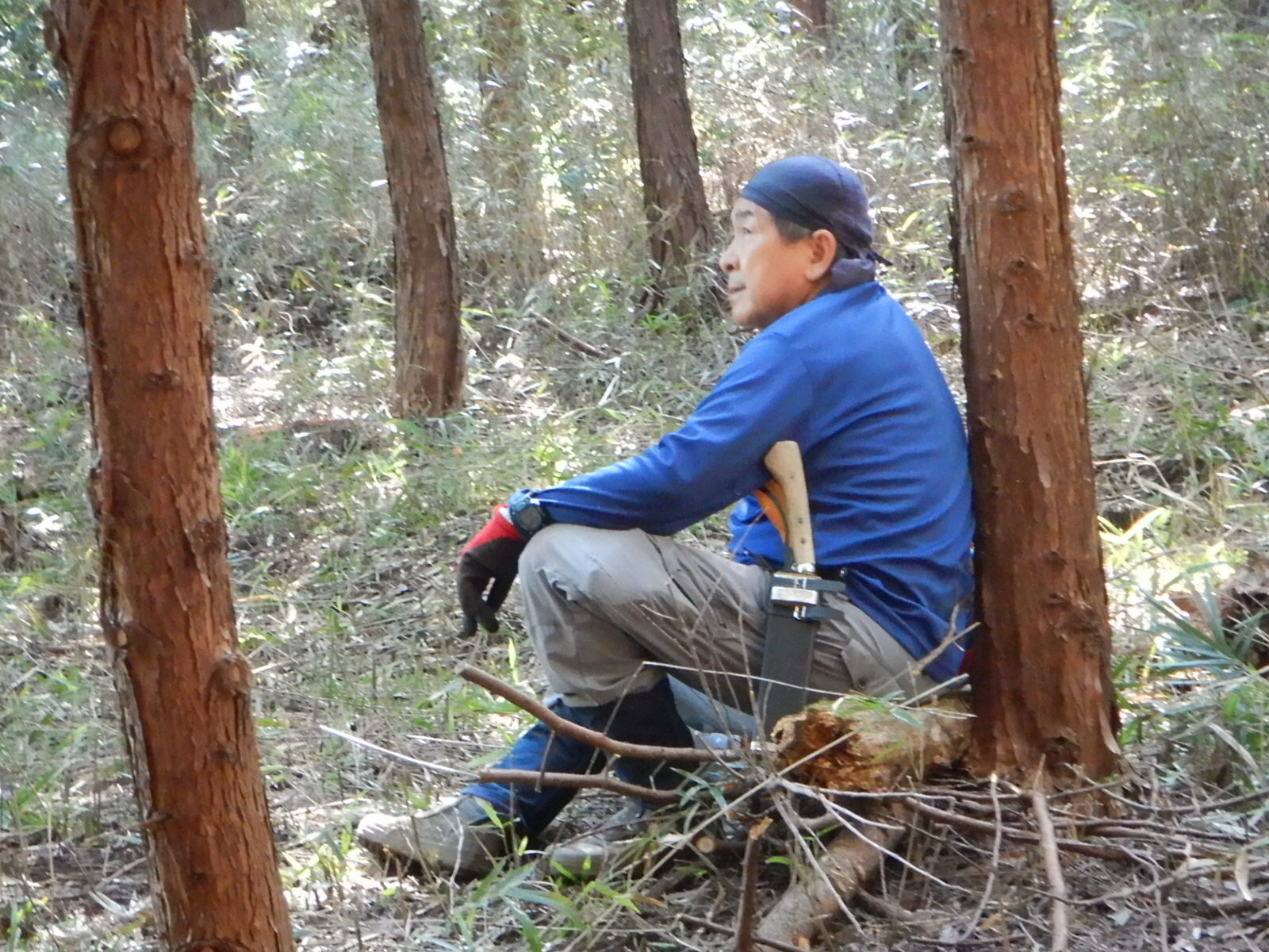 今日の作業では、使用工具として二丁差し・太枝切り鋏・剪定鋏・大鎌などを使います。防虫対策として森林香をメンバーの方に貸し出しています。