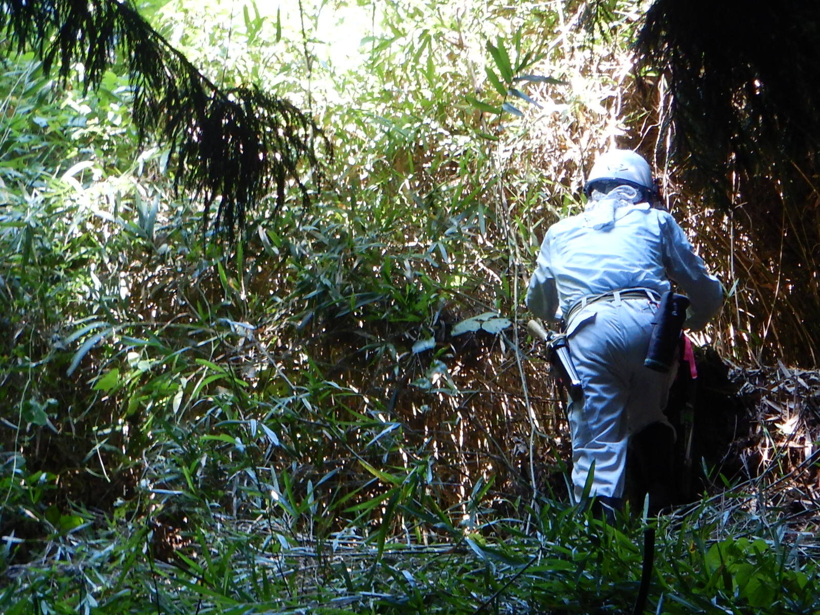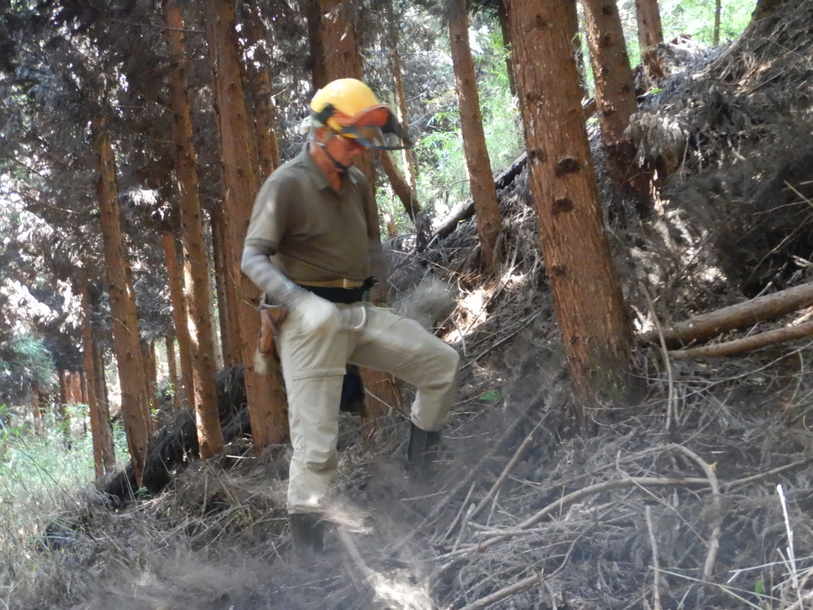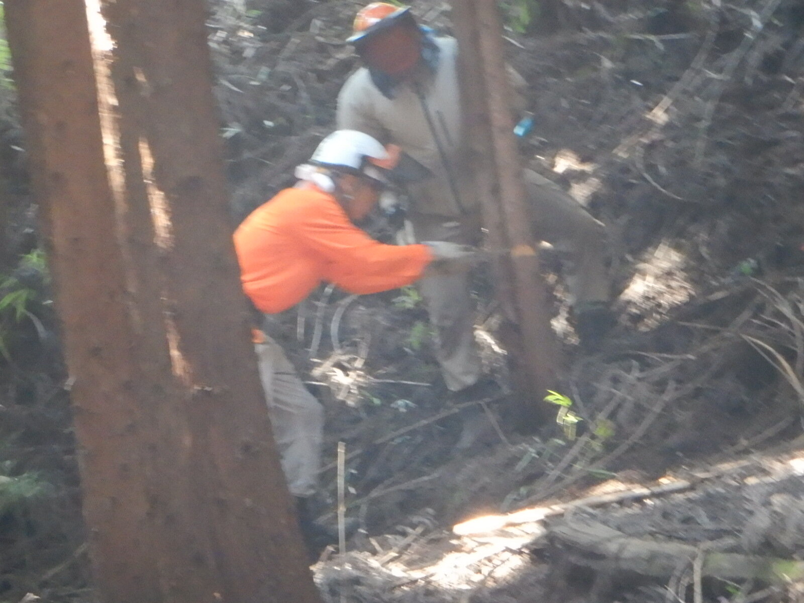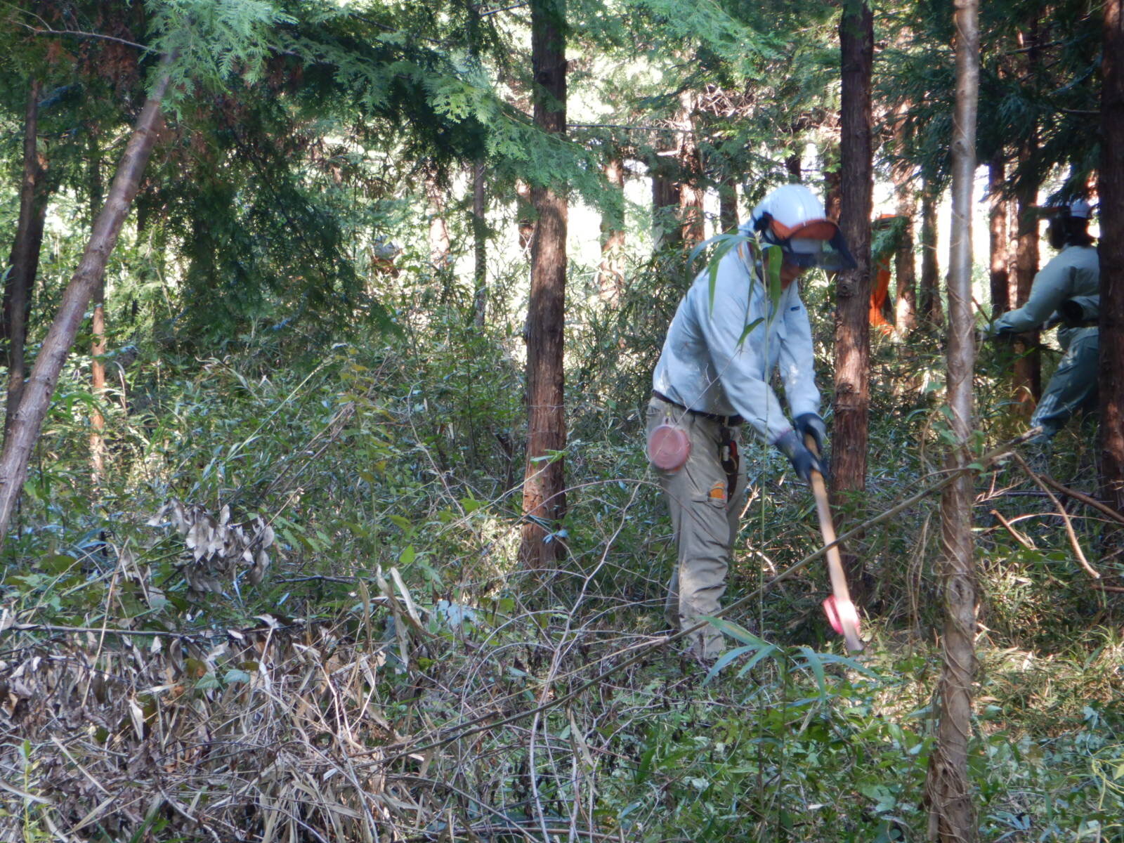 今日の作業では、使用工具として二丁差し・太枝切り鋏・剪定鋏・大鎌などを使います。防虫対策として森林香をメンバーの方に貸し出しています。