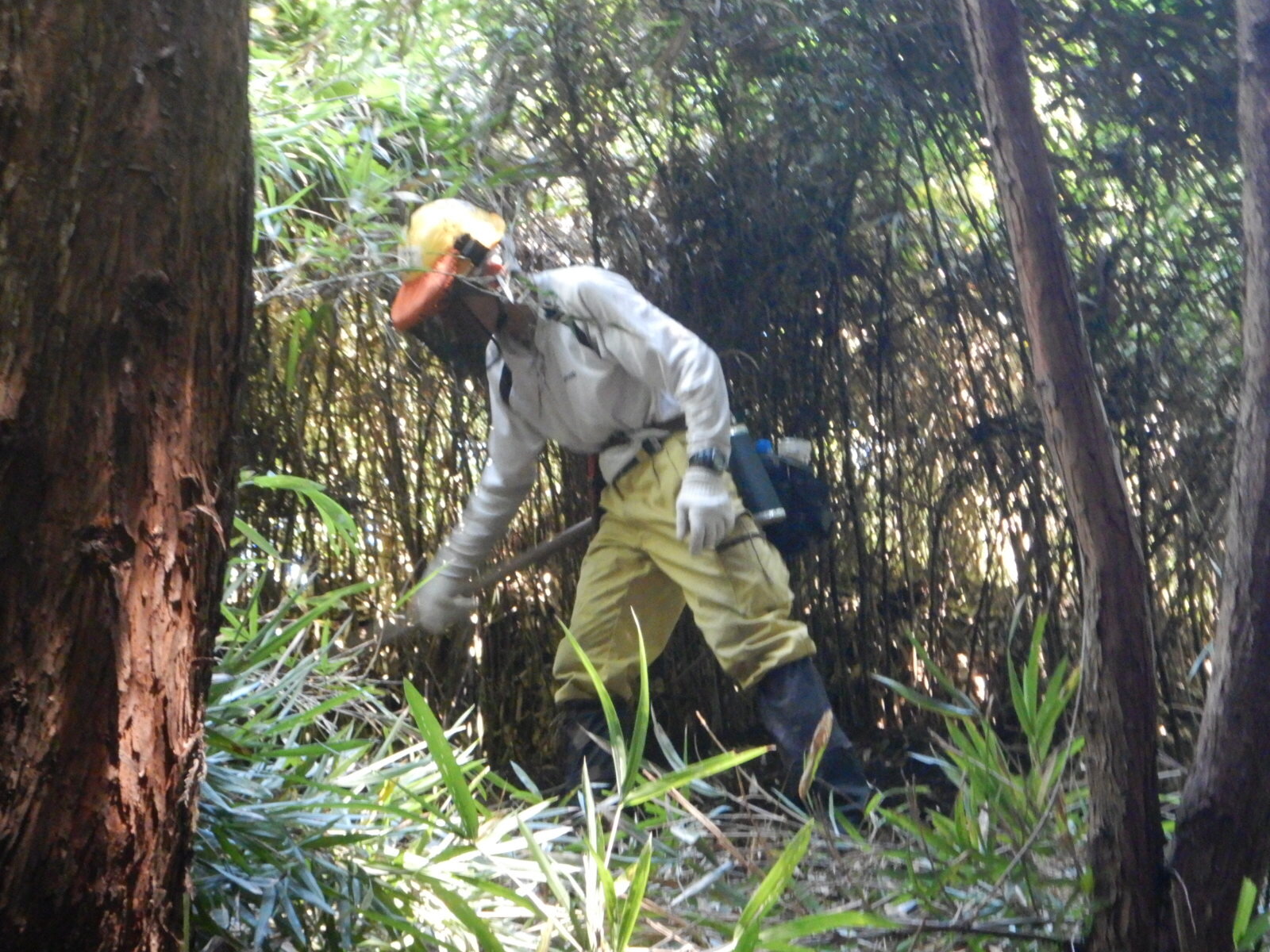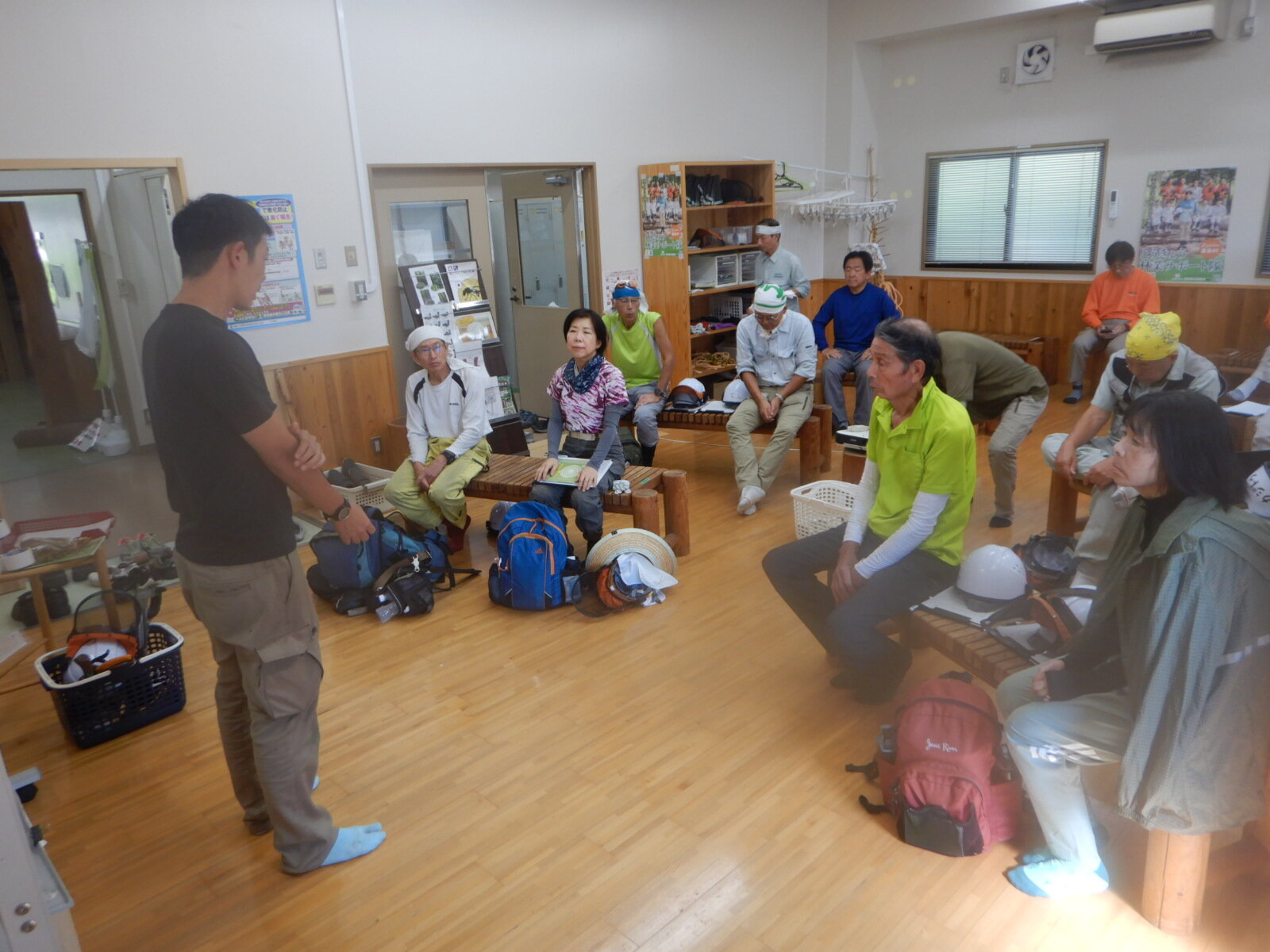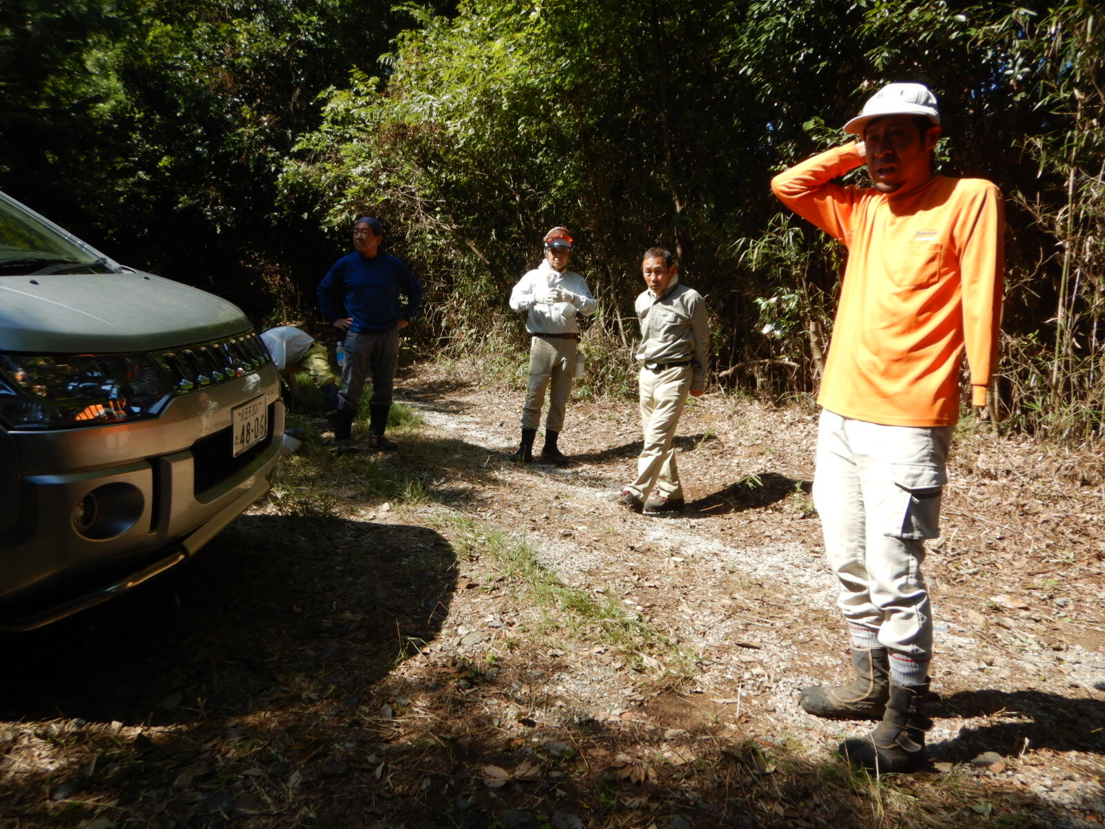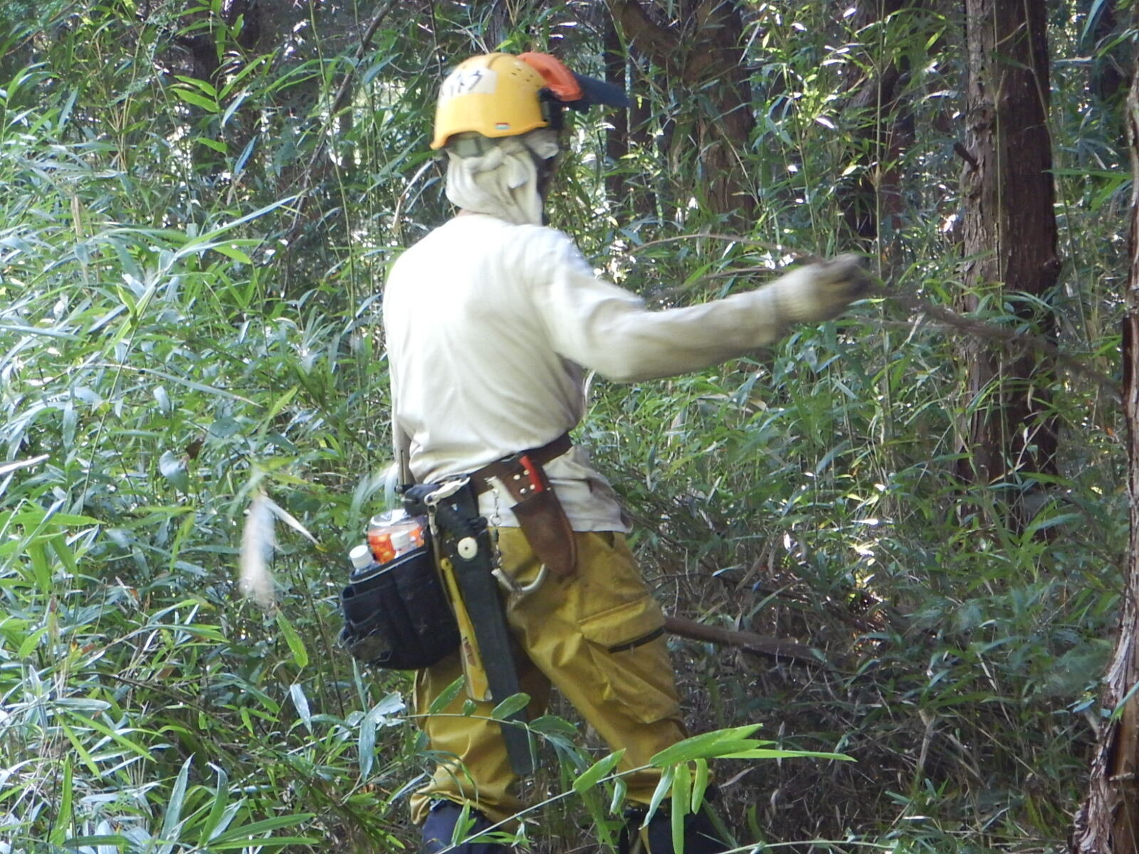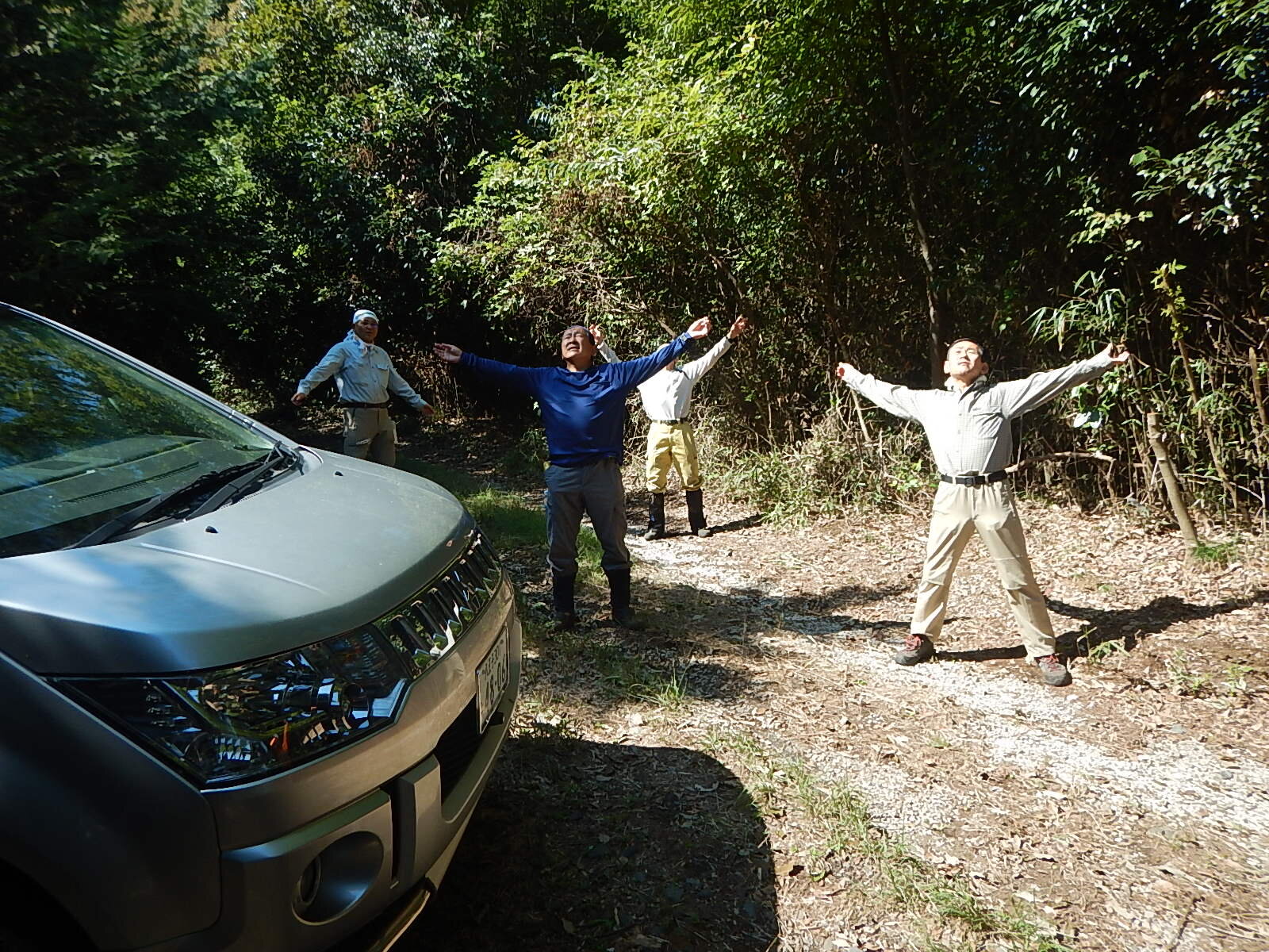 今日の作業では、使用工具として二丁差し・太枝切り鋏・剪定鋏・大鎌などを使います。防虫対策として森林香をメンバーの方に貸し出しています。