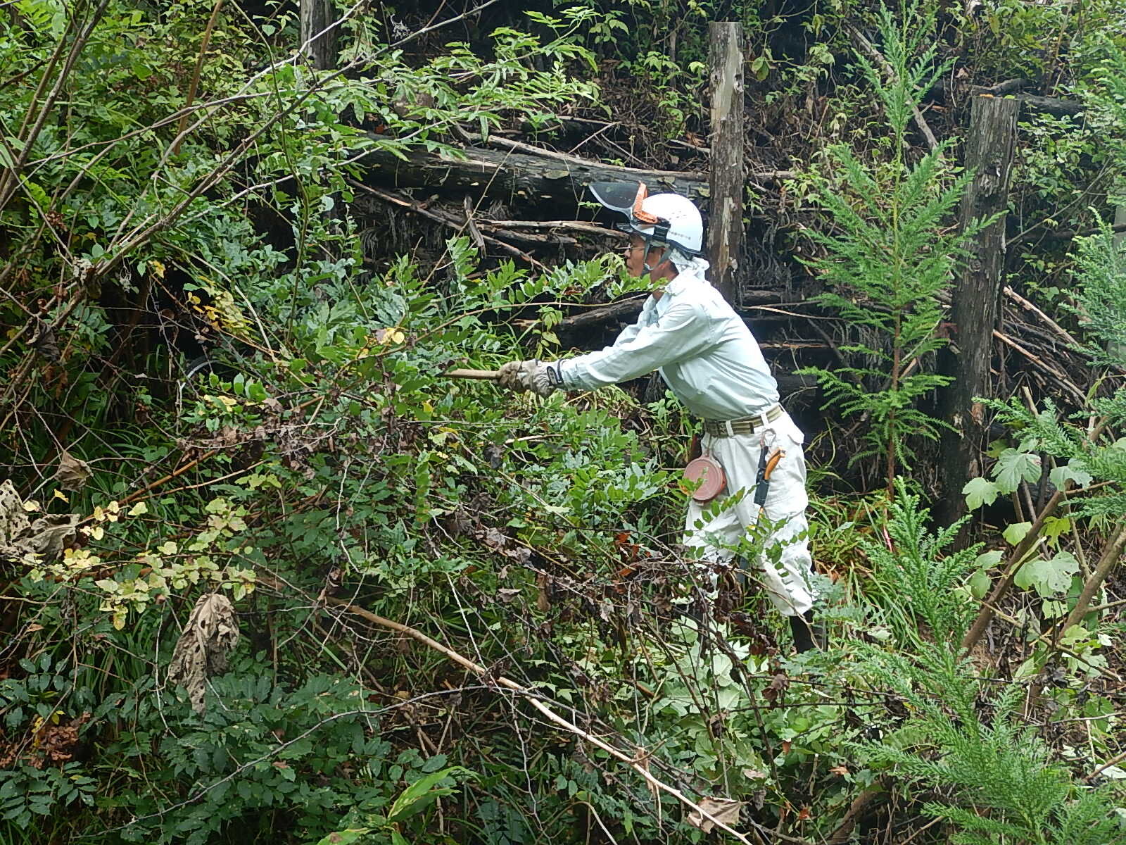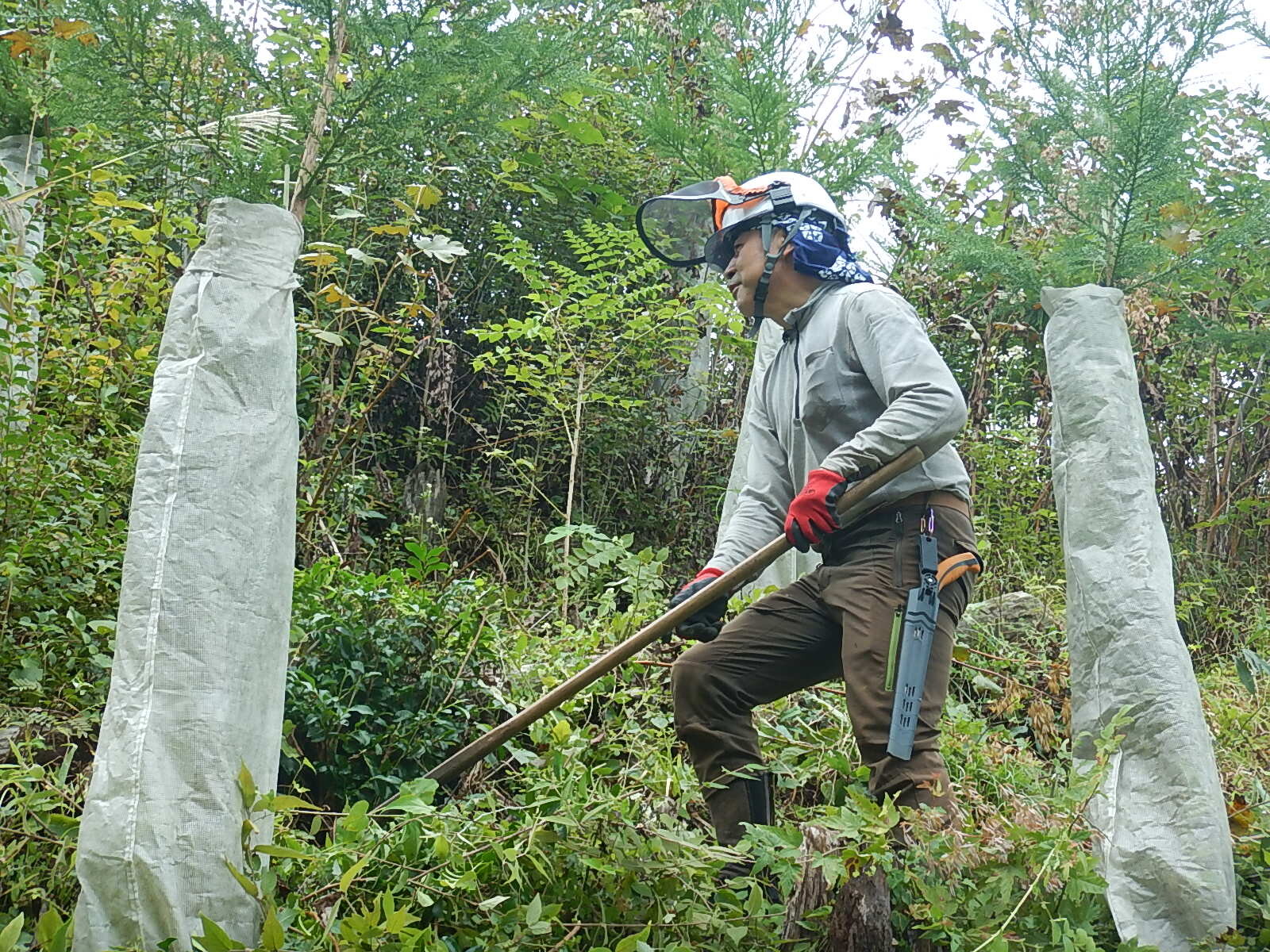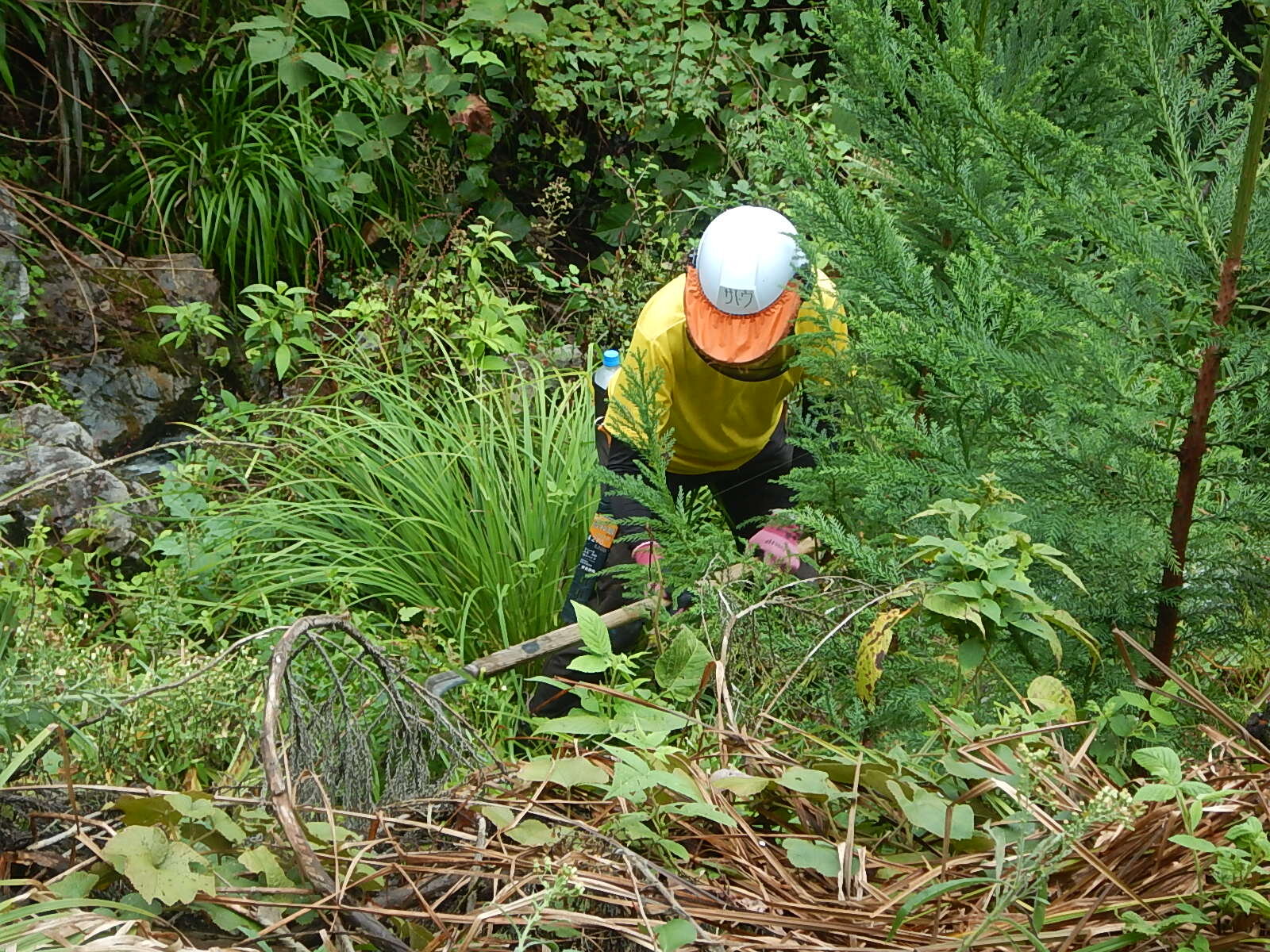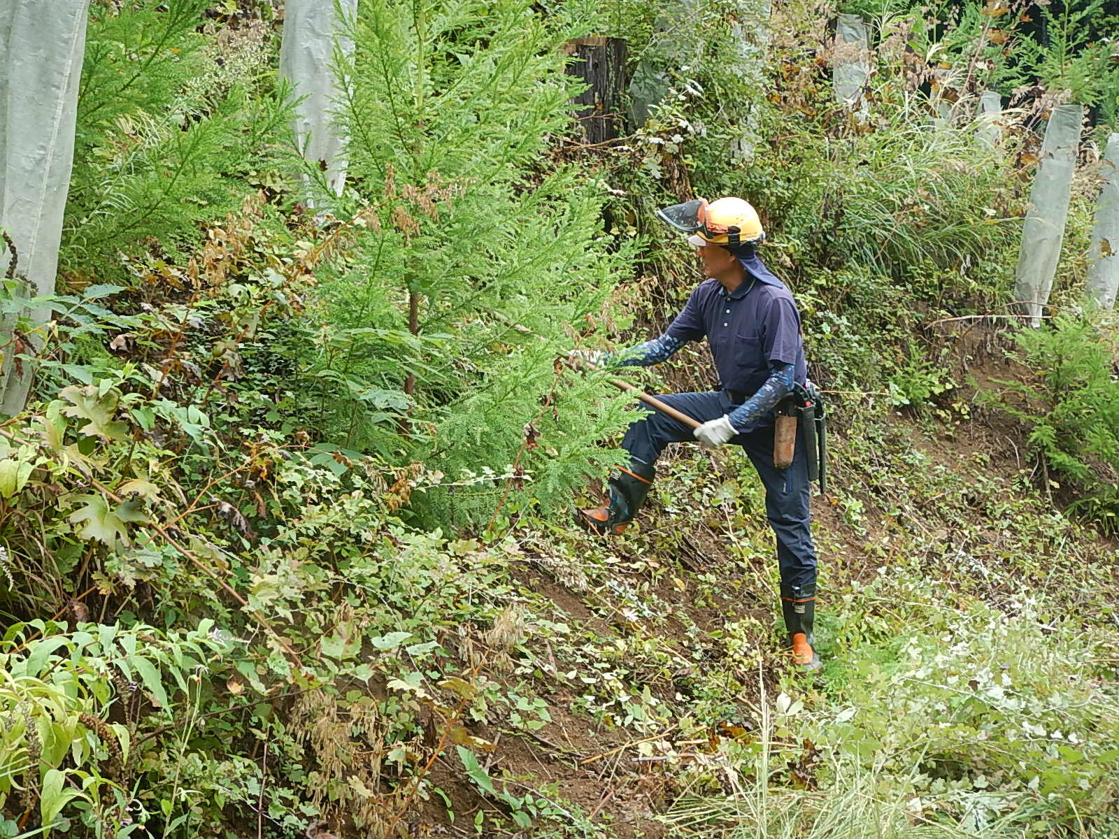 急斜面の多い場所で、足元をしっかり確保してから作業を行います。