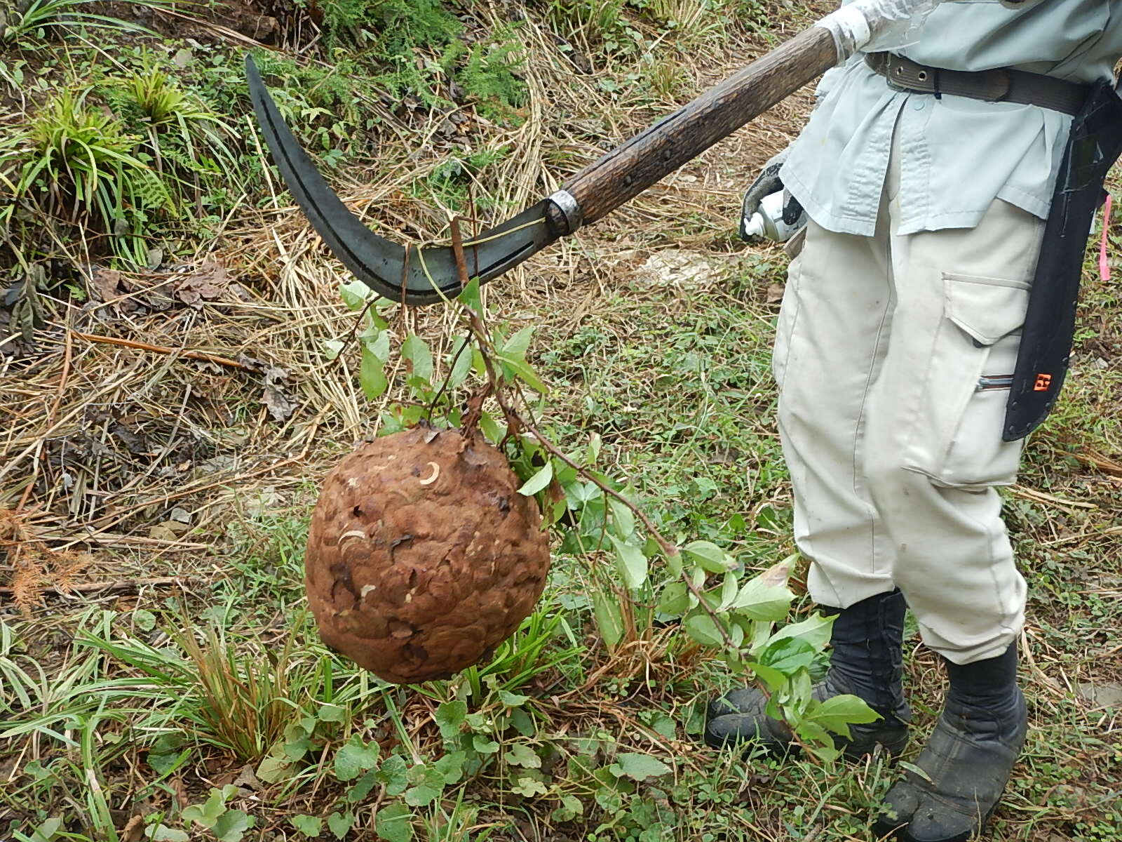 作業開始してすぐにハチと遭遇です。スズメバチの一種と思われます。巣は直径25cmくらいありました。
