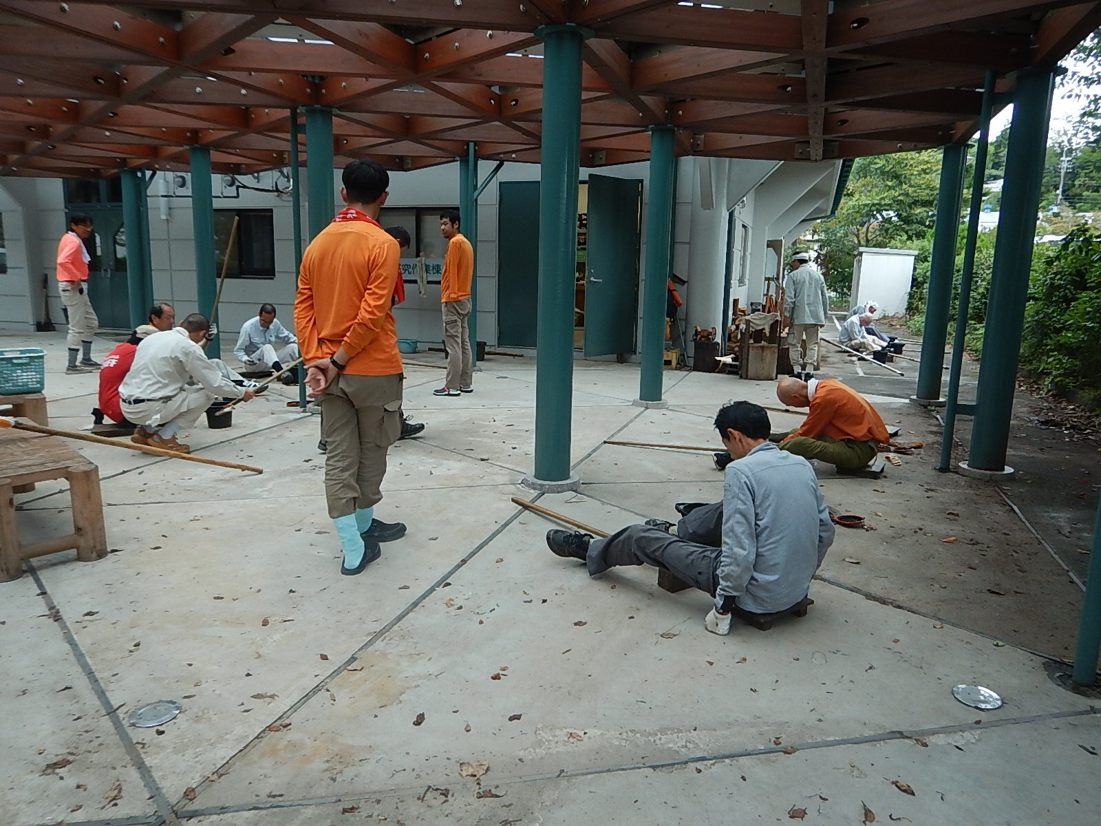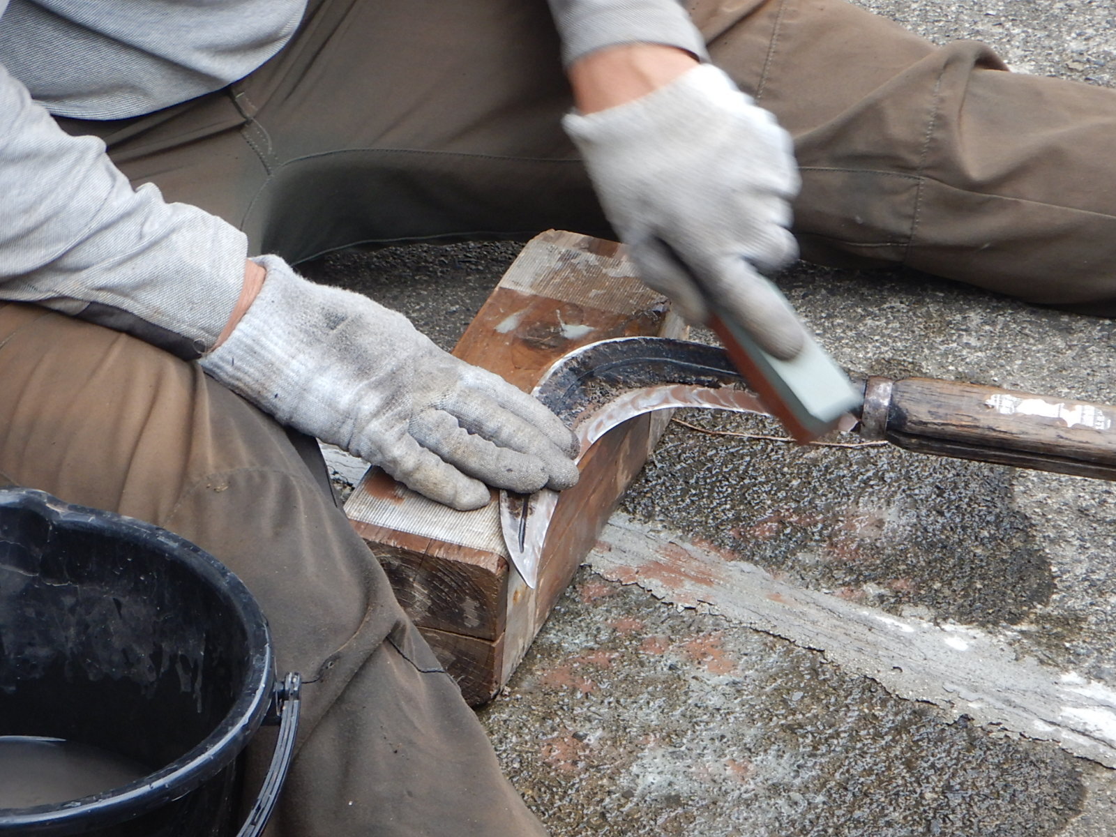 鎌研ぎでは必ず耐切創手袋をつけます。メンバーの方々が下刈りで使用した大鎌を研いで指導員に確認してもらいます。