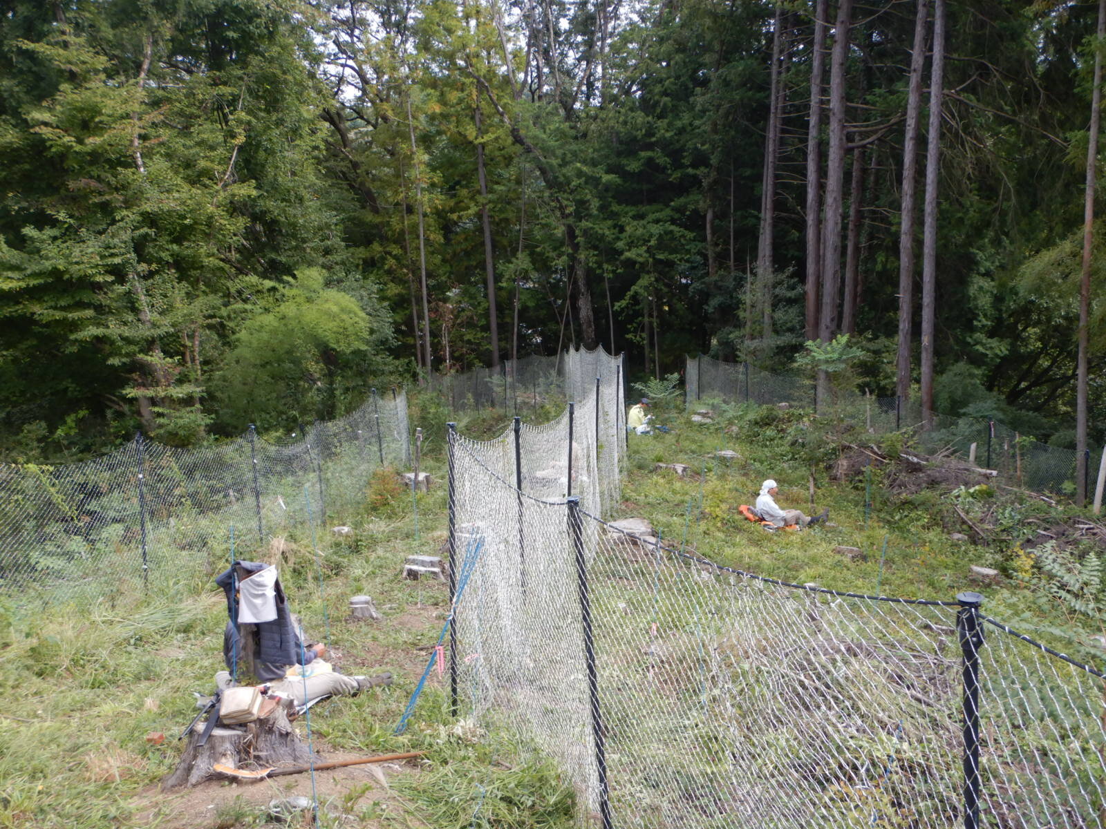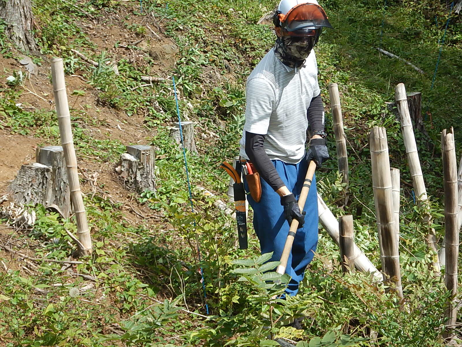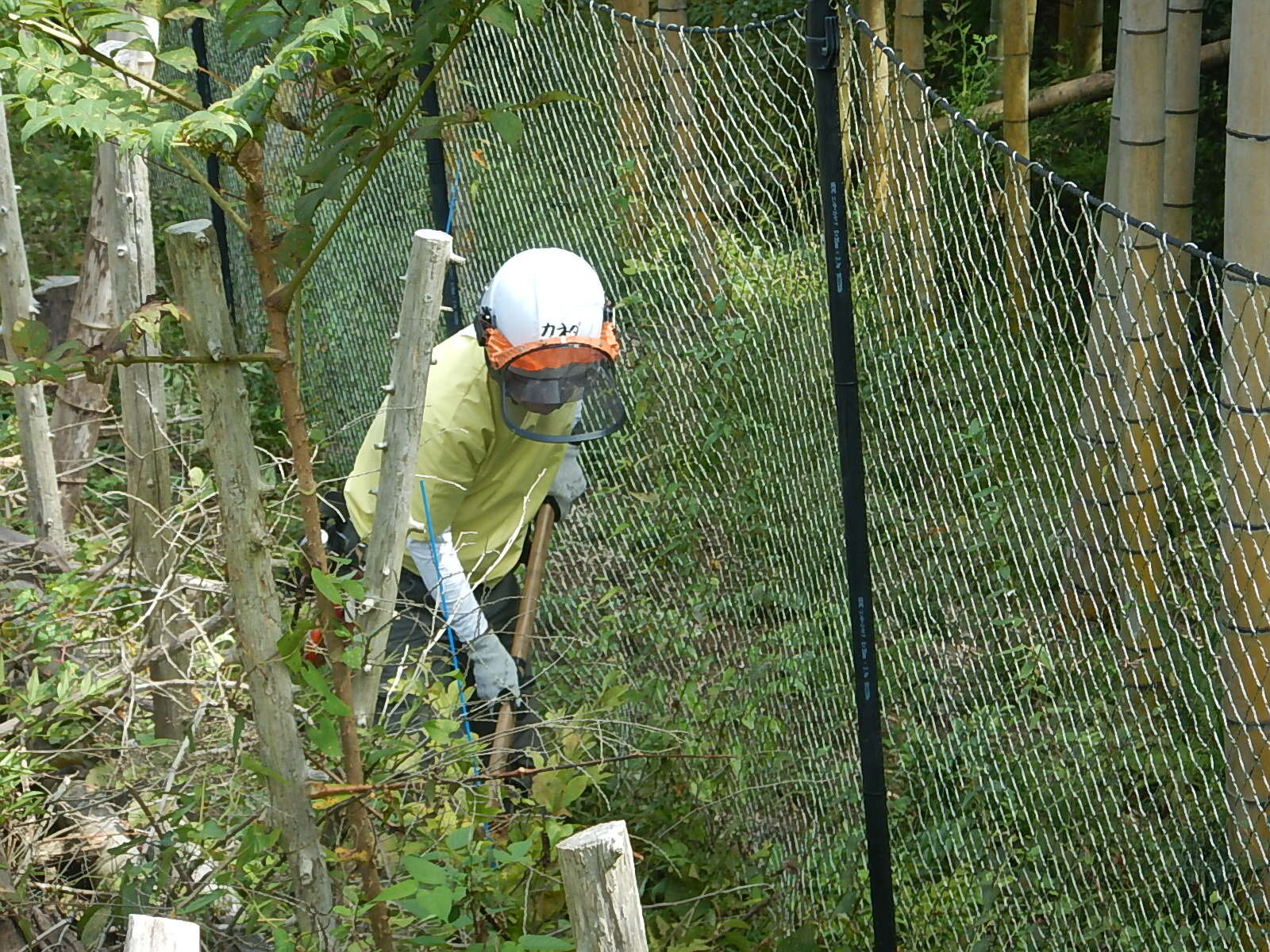 鹿柵ネットを切らないように注意して刈ります。下から上に作業していきます。