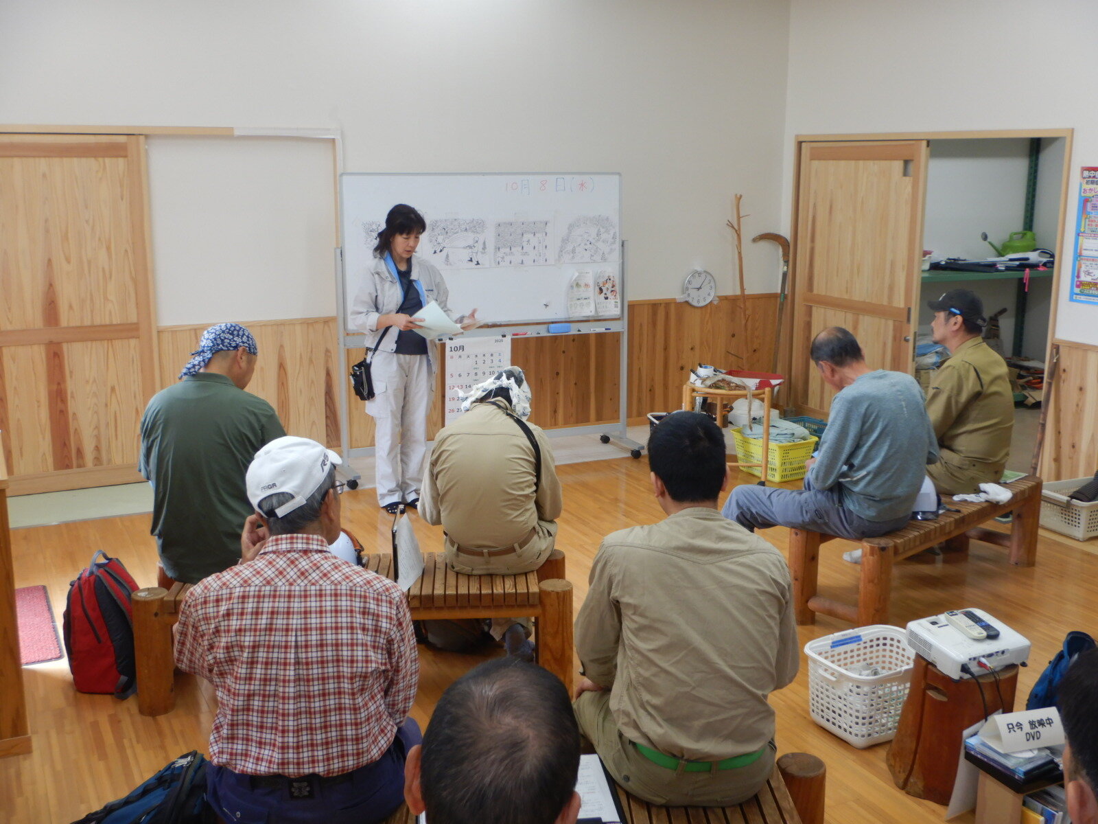 次に指導員による『安全講習』です。今日使う道具の説明、今日は下刈り作業の為大鎌を使用します。姿勢が大切!前かがみにならないように注意点を説明しました。
