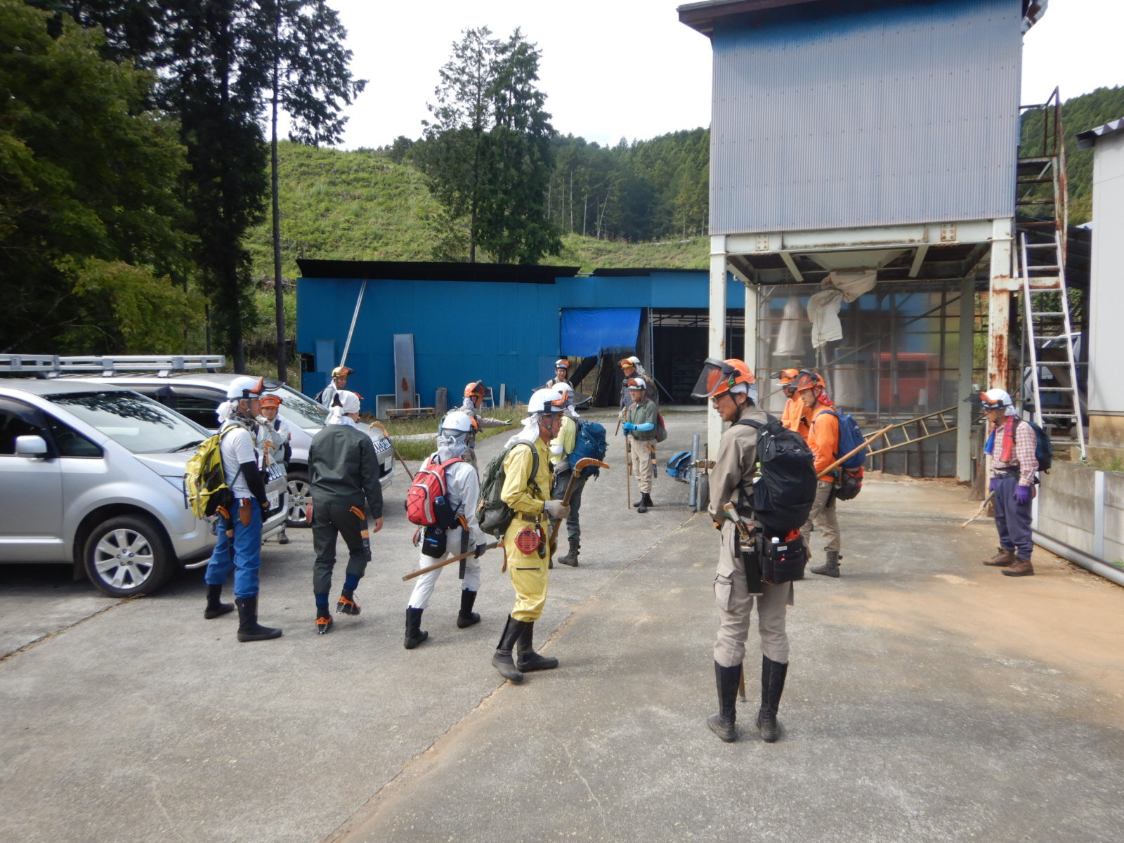 準備体操で体をほぐし、道具を準備して作業地へ班ごとに向かいます。
