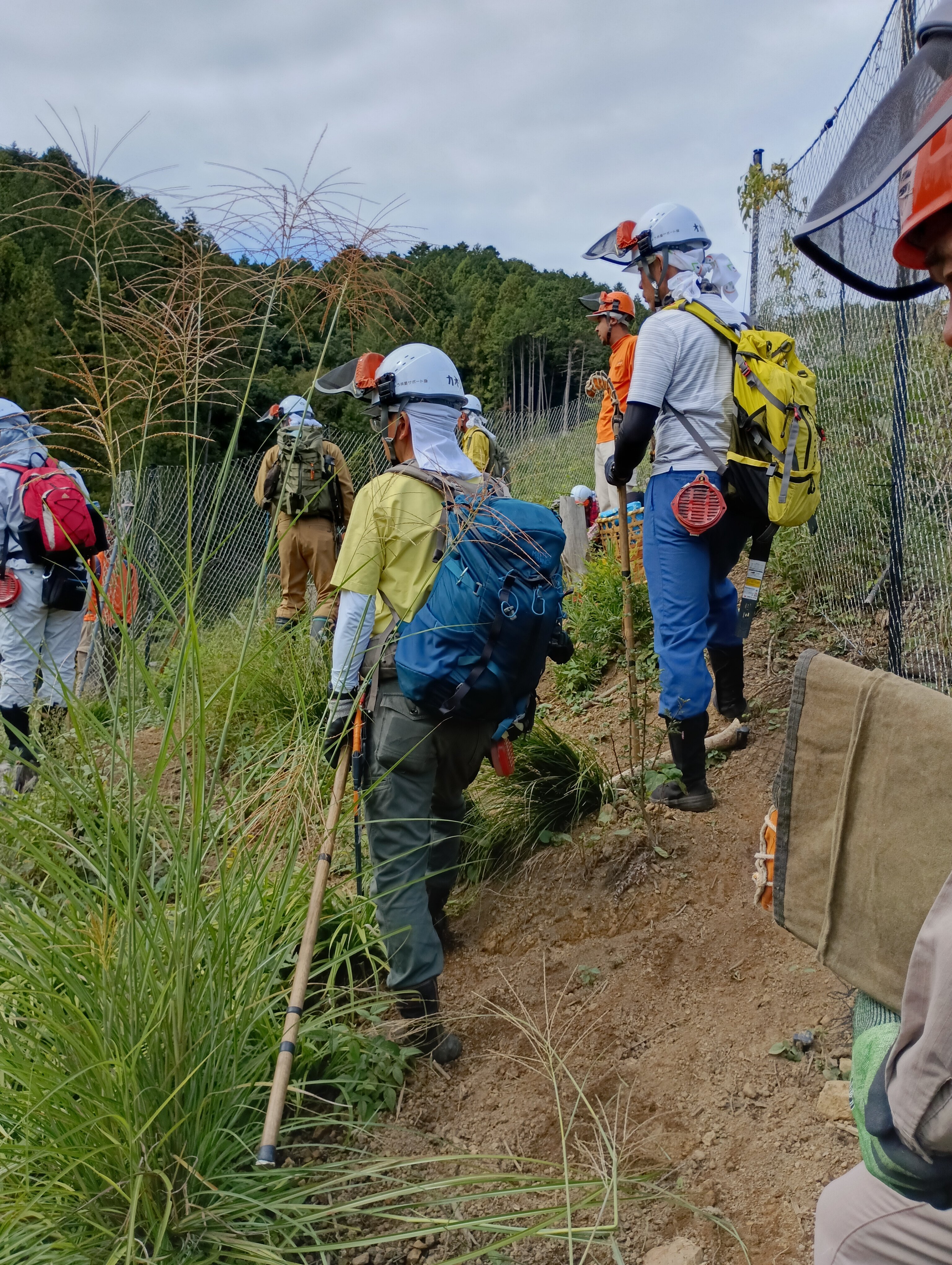 実際の活動現場で危険予知活動を行いました。夏の初めに一度下刈りを行いましたが、沢山の雑草でおおわれています。