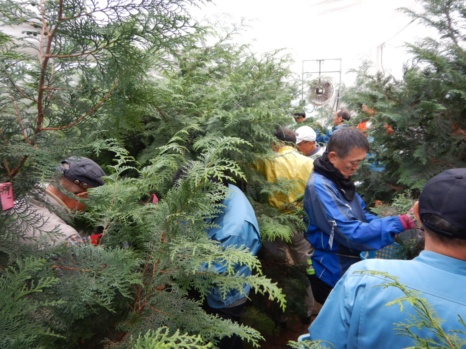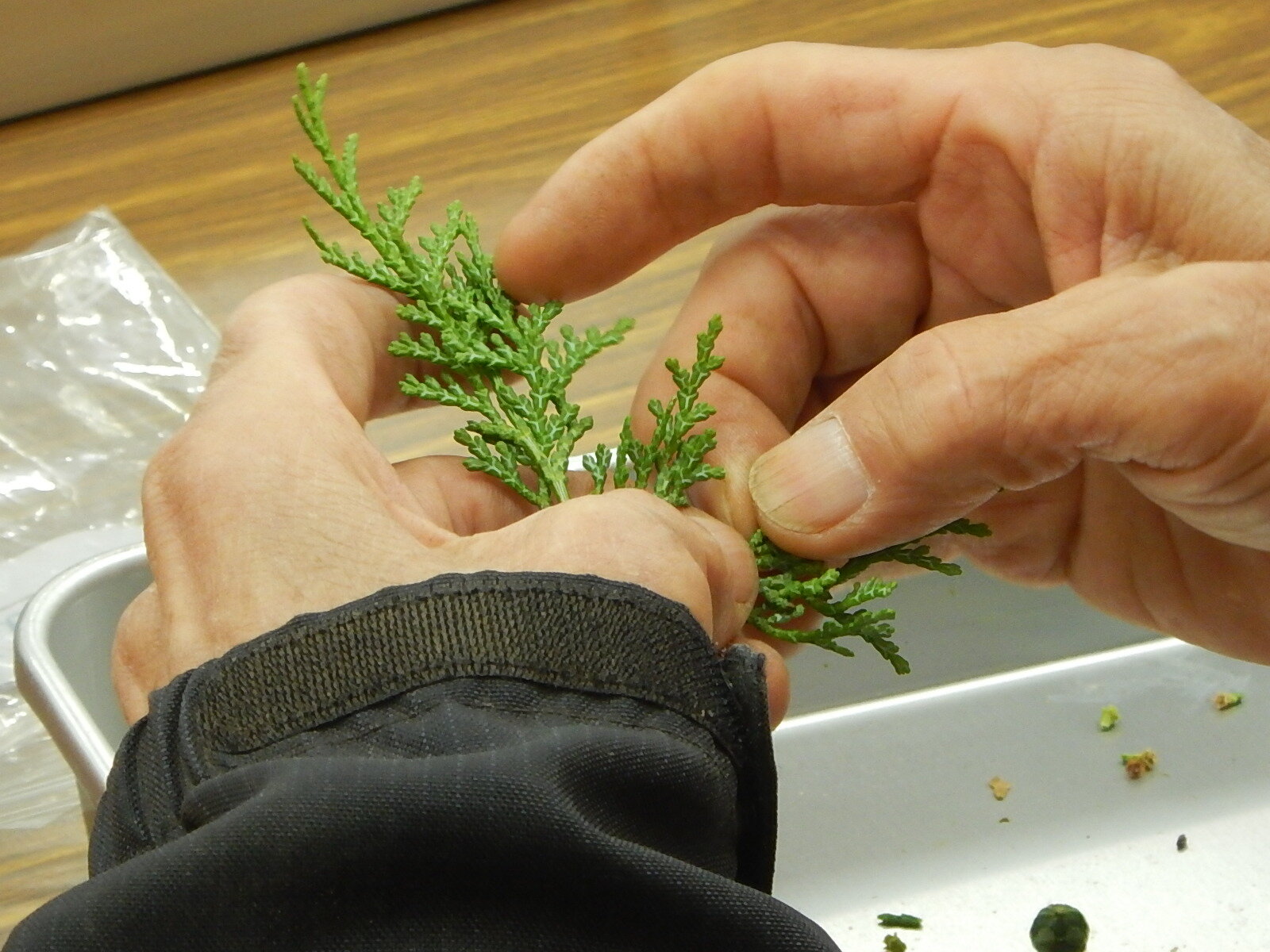 班ごとに、少花粉スギの球果のついた枝を採取しています。