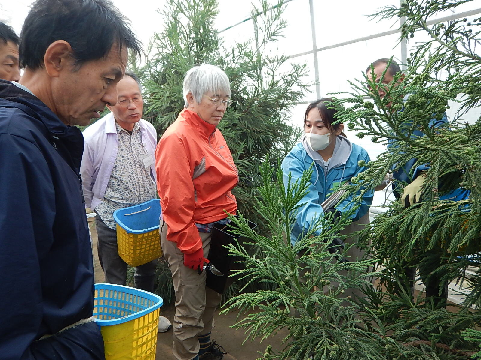 今回も前回同様、森林整備活動においていちばんの起点となる、少花粉スギ・少花粉ヒノキの種子を採取する作業を行います。