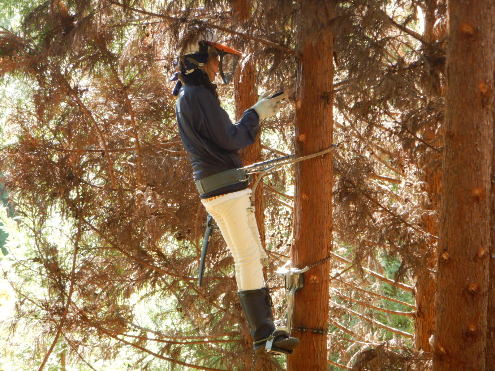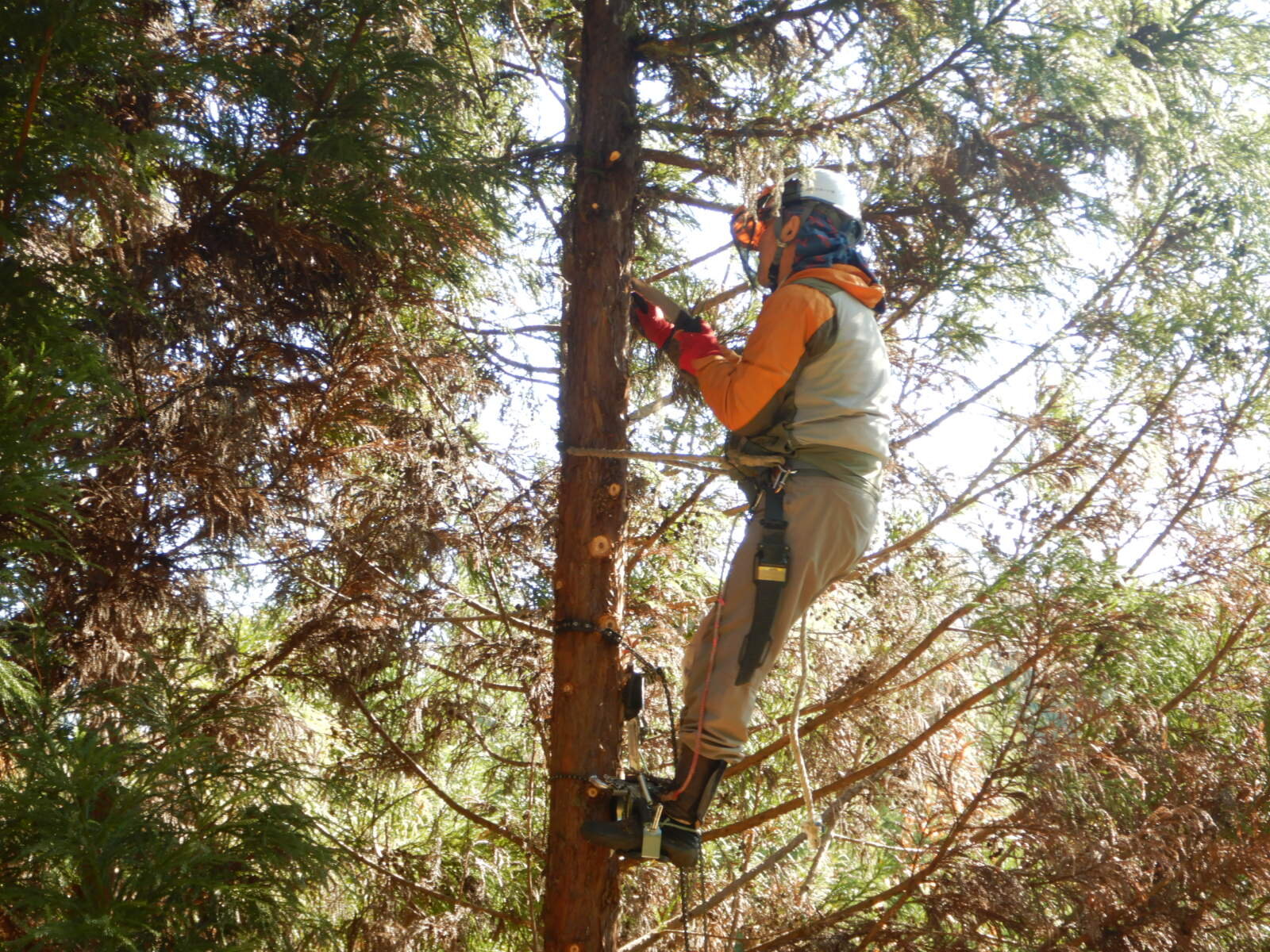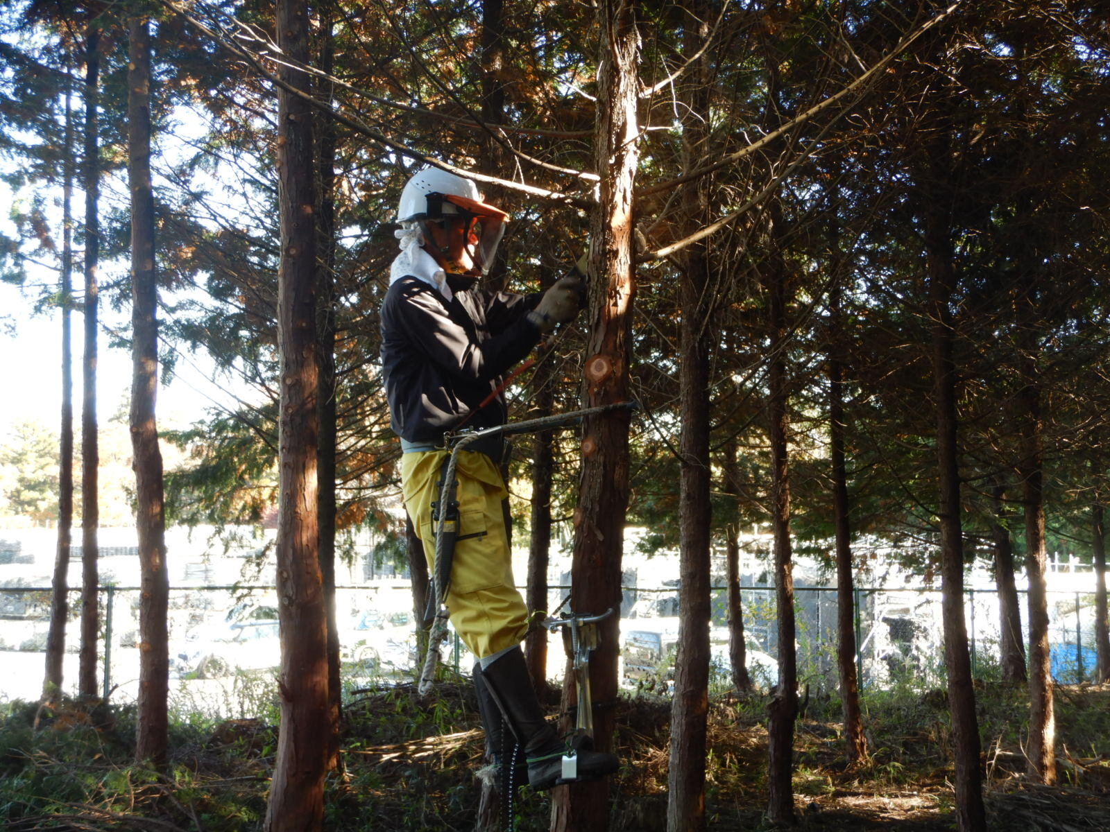 安全講習では、ヘルメットの正しい装着方法から鋸の使い方、登降機・安全帯の使い方を説明します。