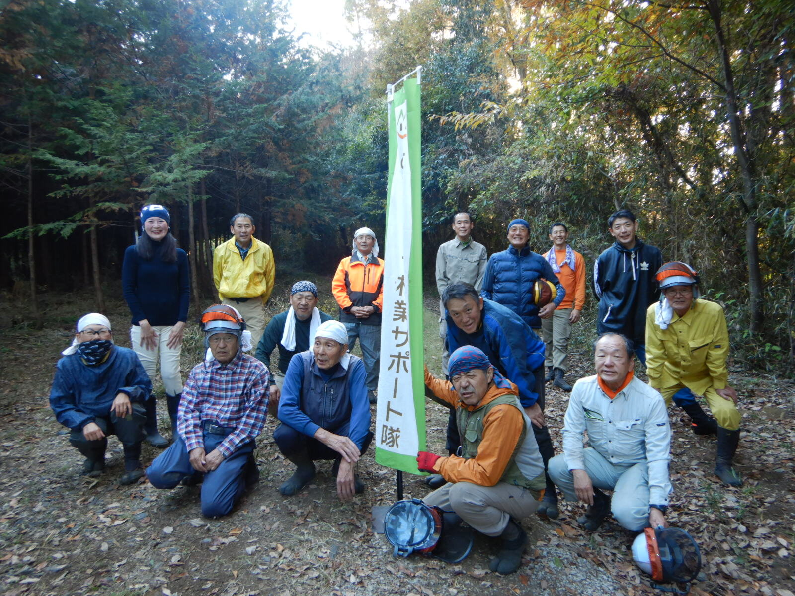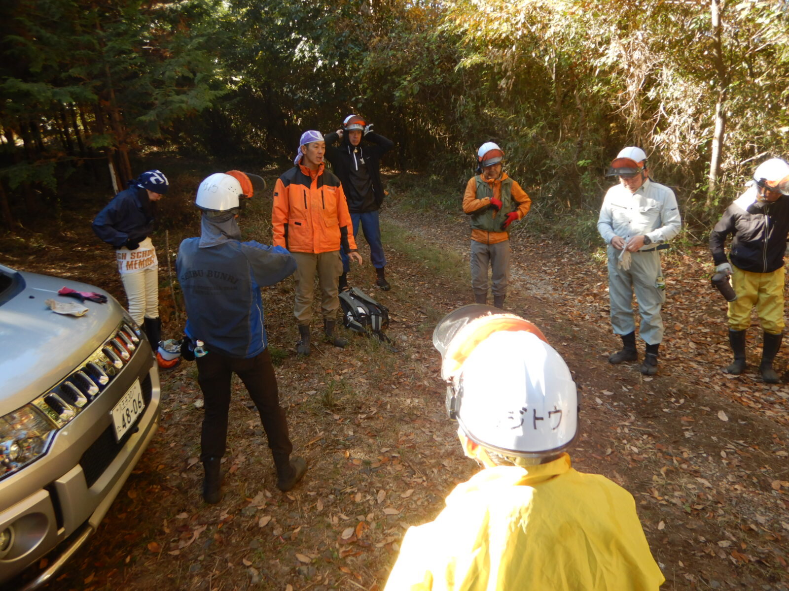 現地に到着したら準備体操を行います。その後、危険予知活動を行って活動地に入る前の注意点を確認します。各自、鋸や森林香など必要なものを持って班ごとに活動場所に向かいます。