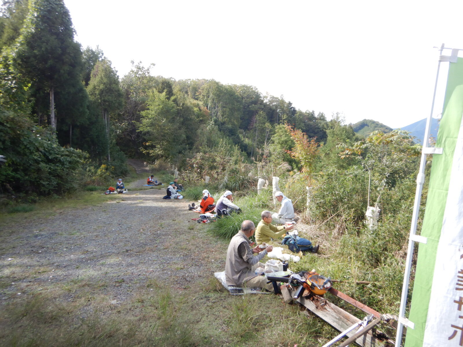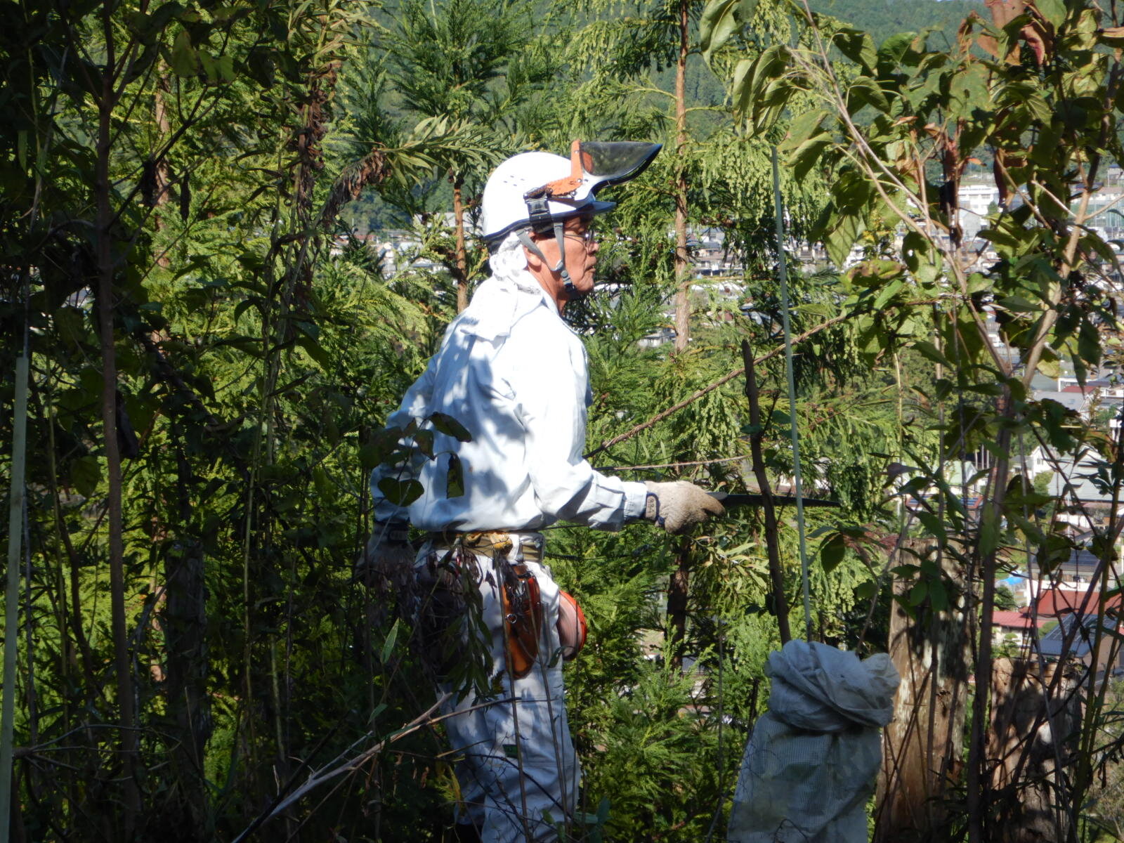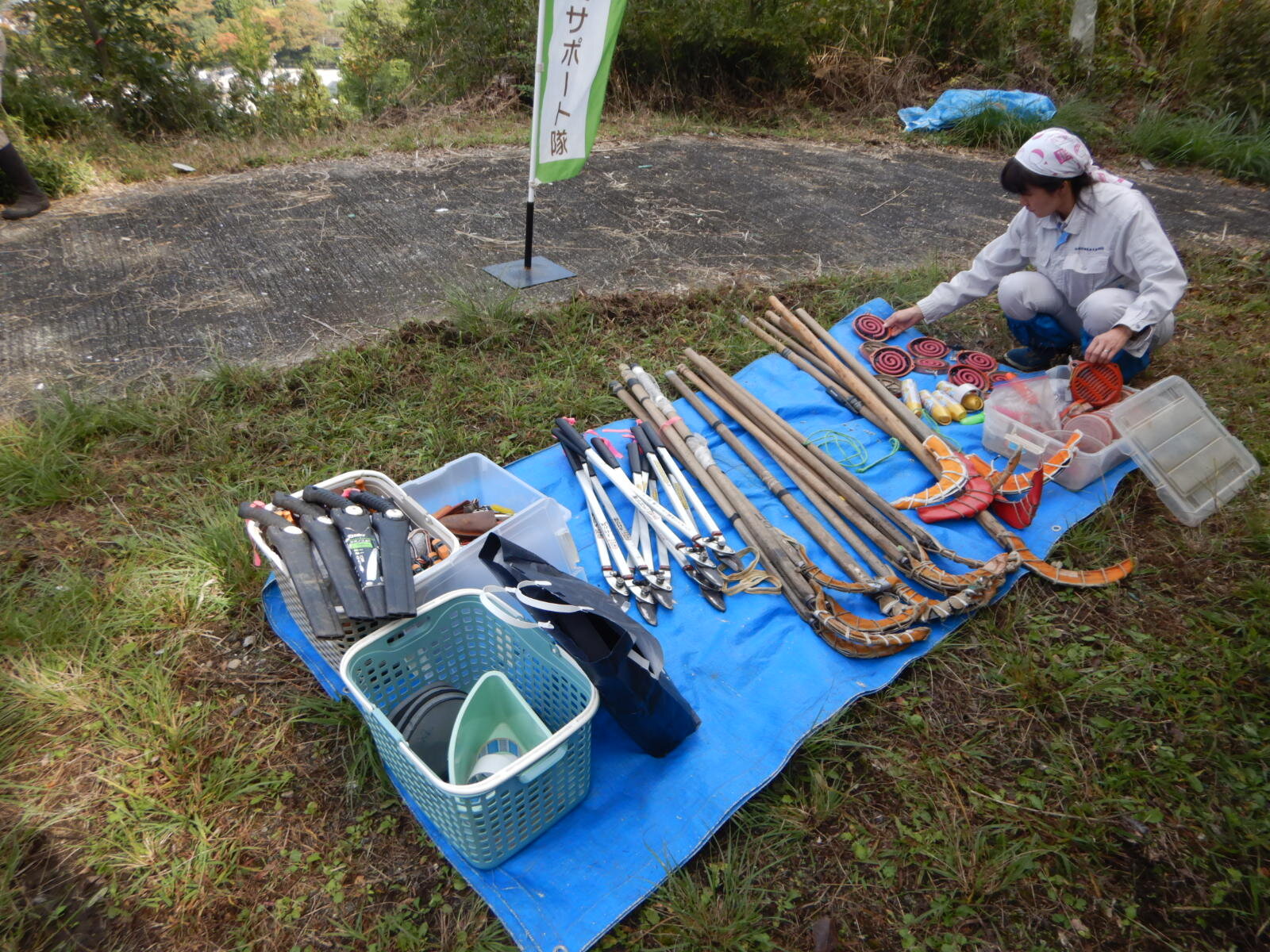 使用する道具は、大鎌・鋸・太枝切鋏・剪定鋏です。10月でもハチなどの虫が出ていますので、希望者には森林香も渡します。