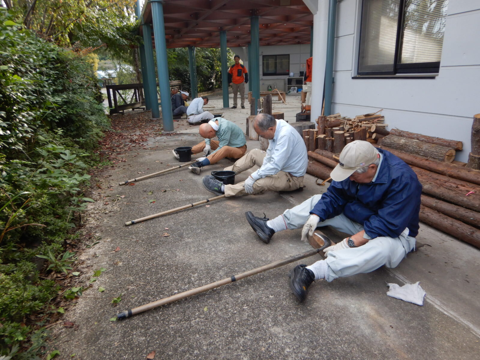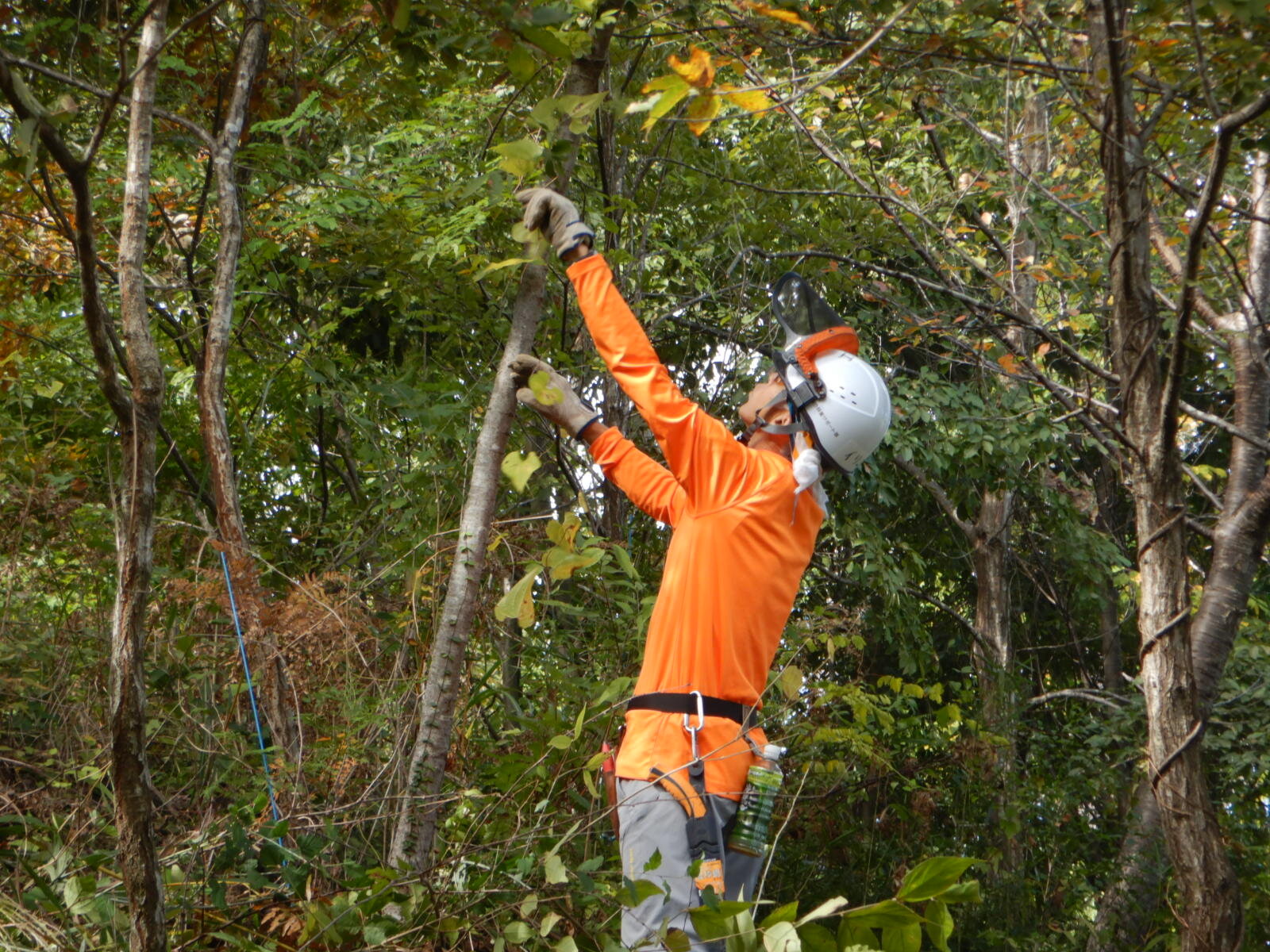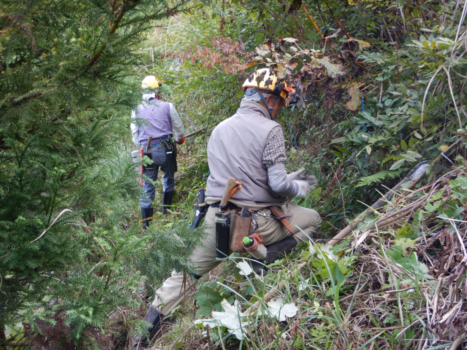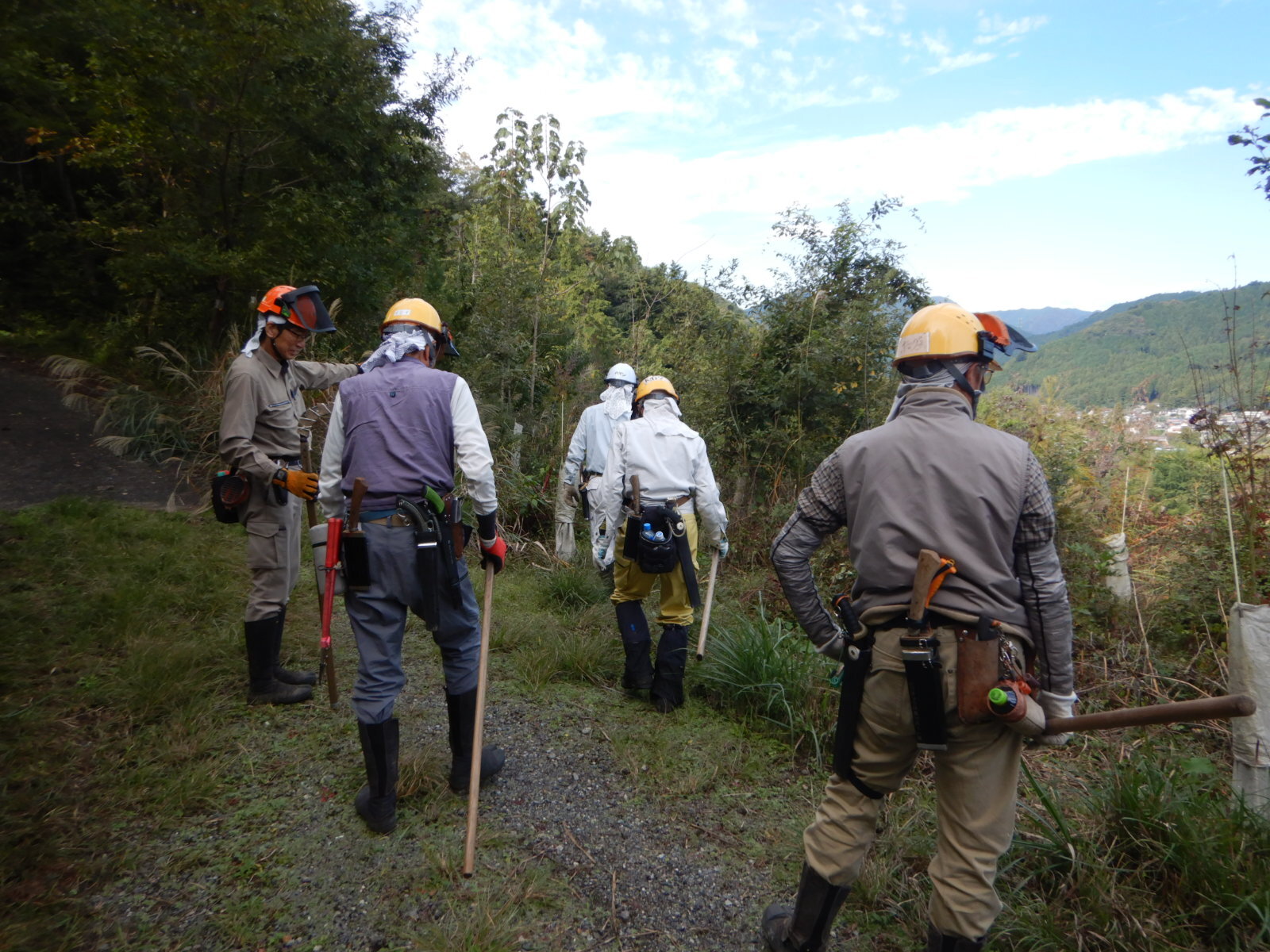 使用する道具は、大鎌・鋸・太枝切鋏・剪定鋏です。10月でもハチなどの虫が出ていますので、希望者には森林香も渡します。