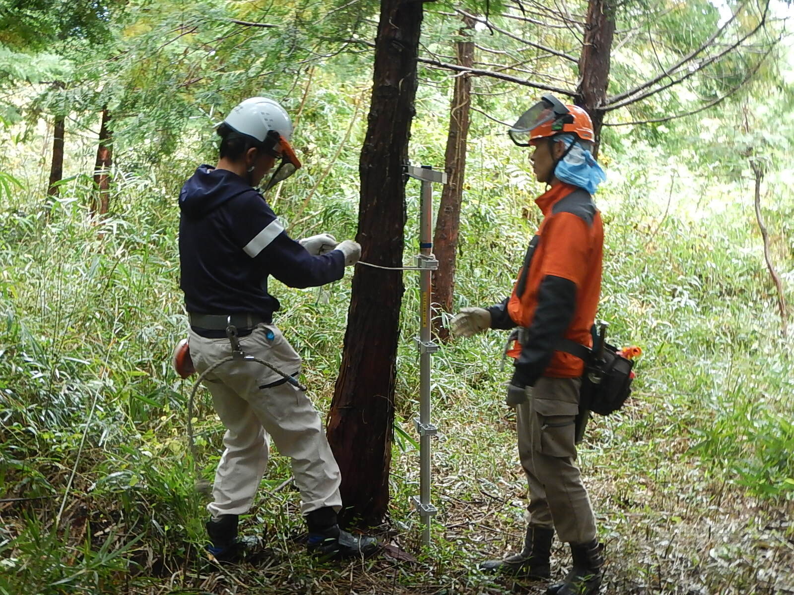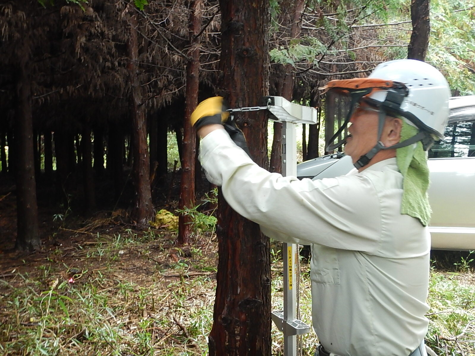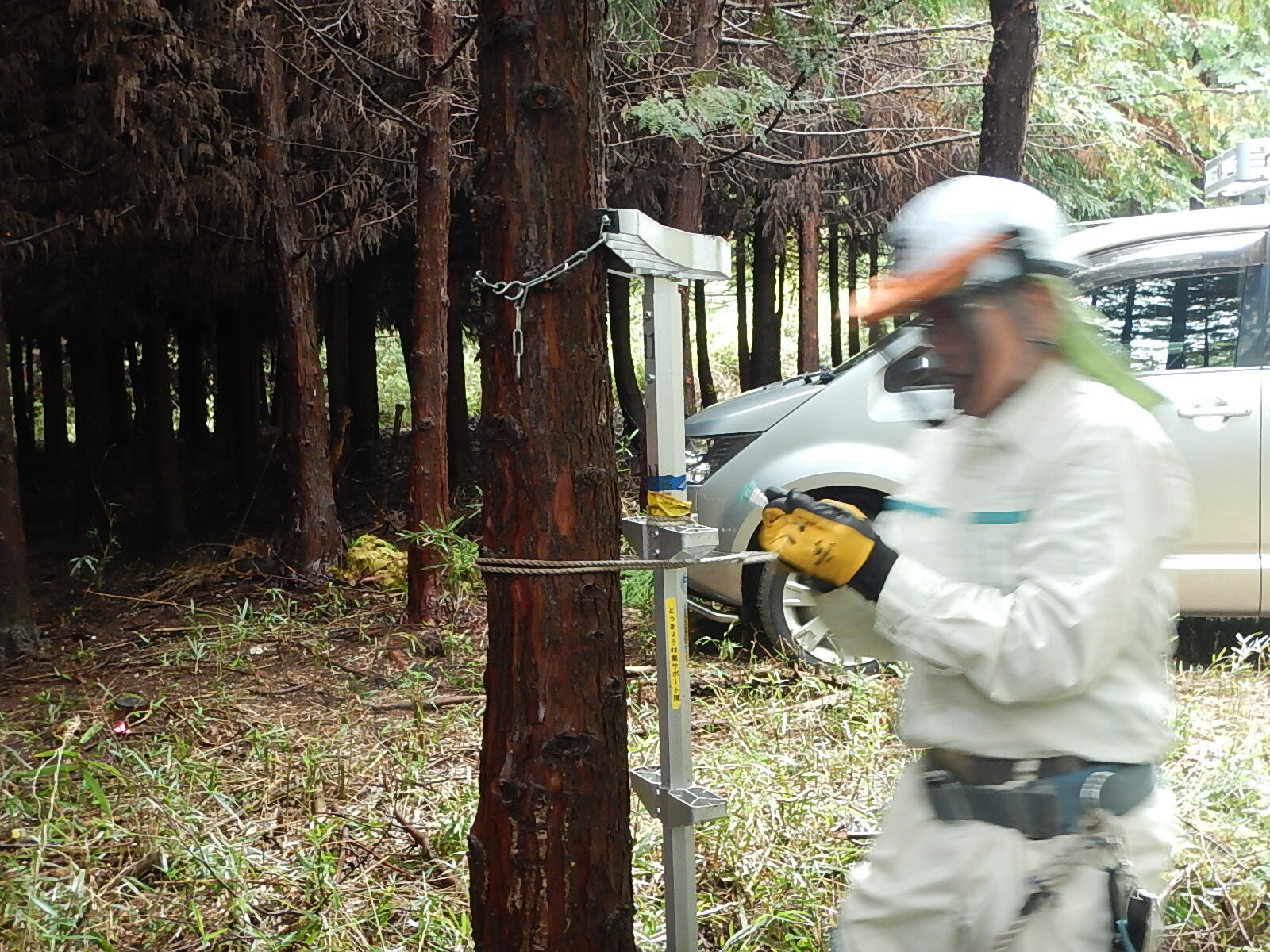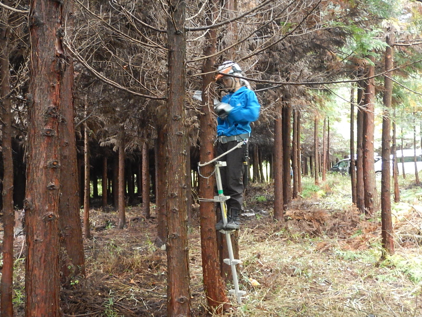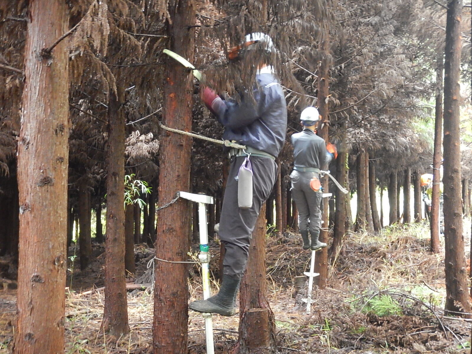 今日は明け方までの雨の影響で木の幹が濡れていたため、登降機ではなくはしごを使って枝打ちを行います。