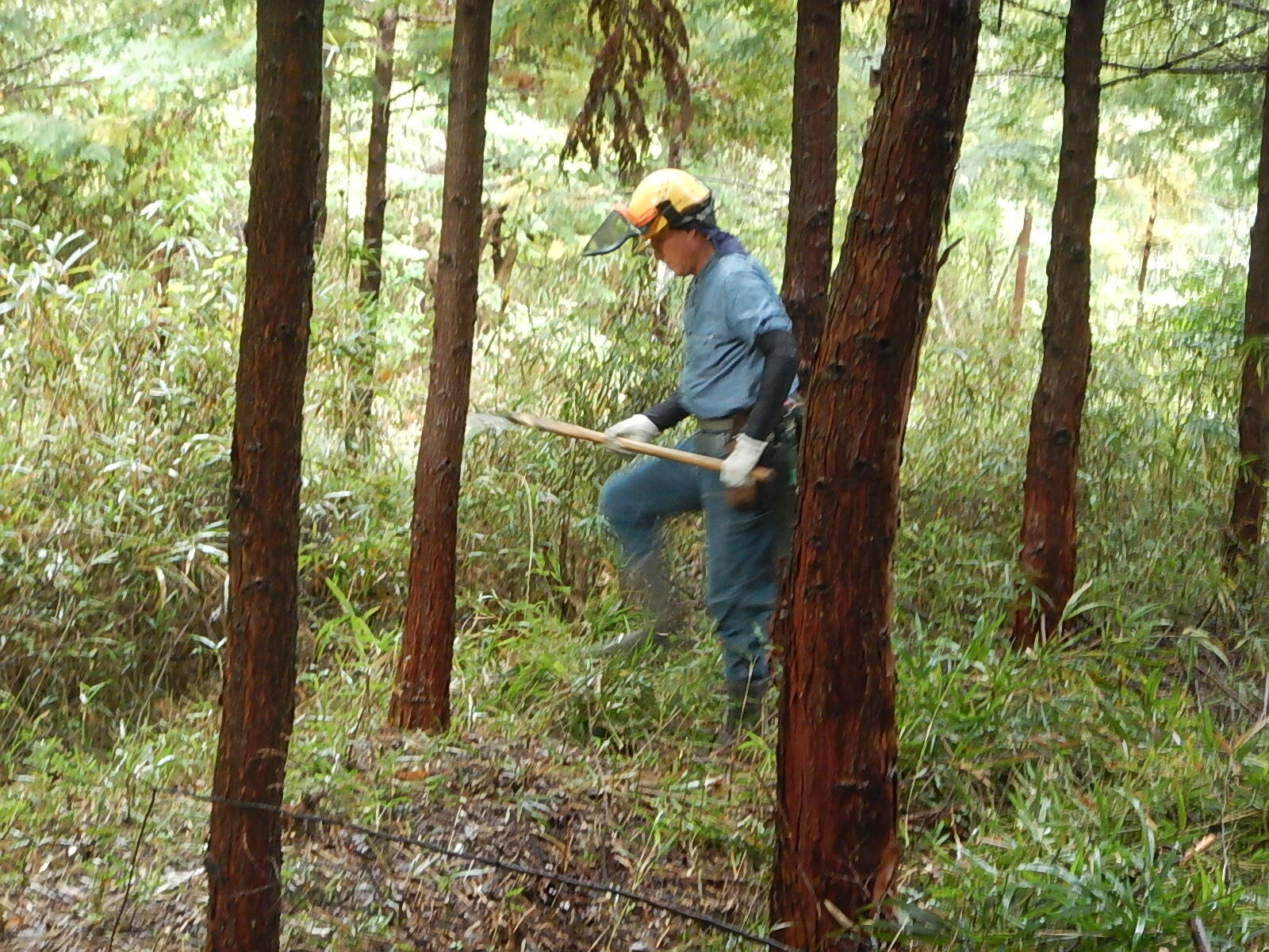こちらは、まず周辺を大鎌で刈ってから枝打ちに取りかかるようです。
