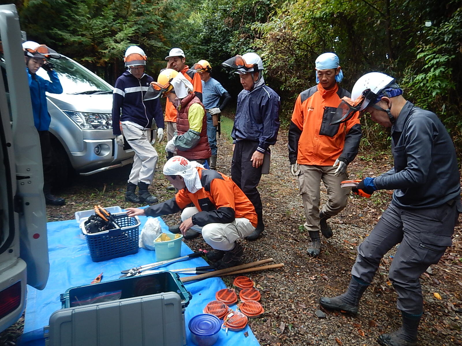 各自必要な道具を身に着けて、枝打ちに向かいます。