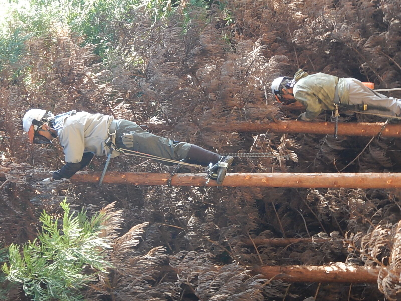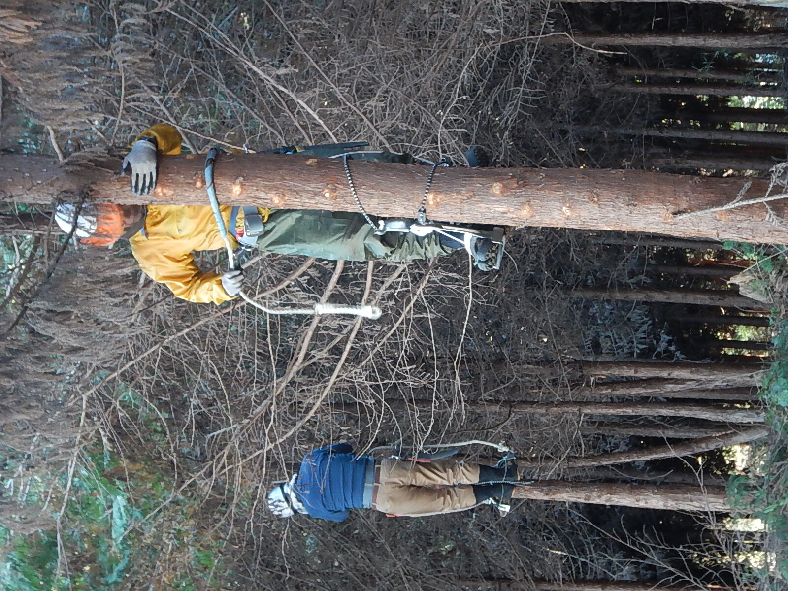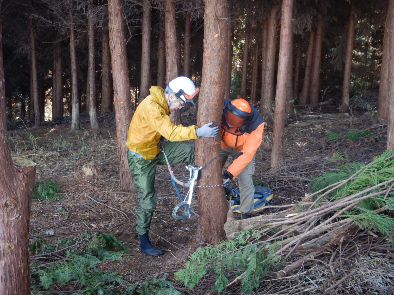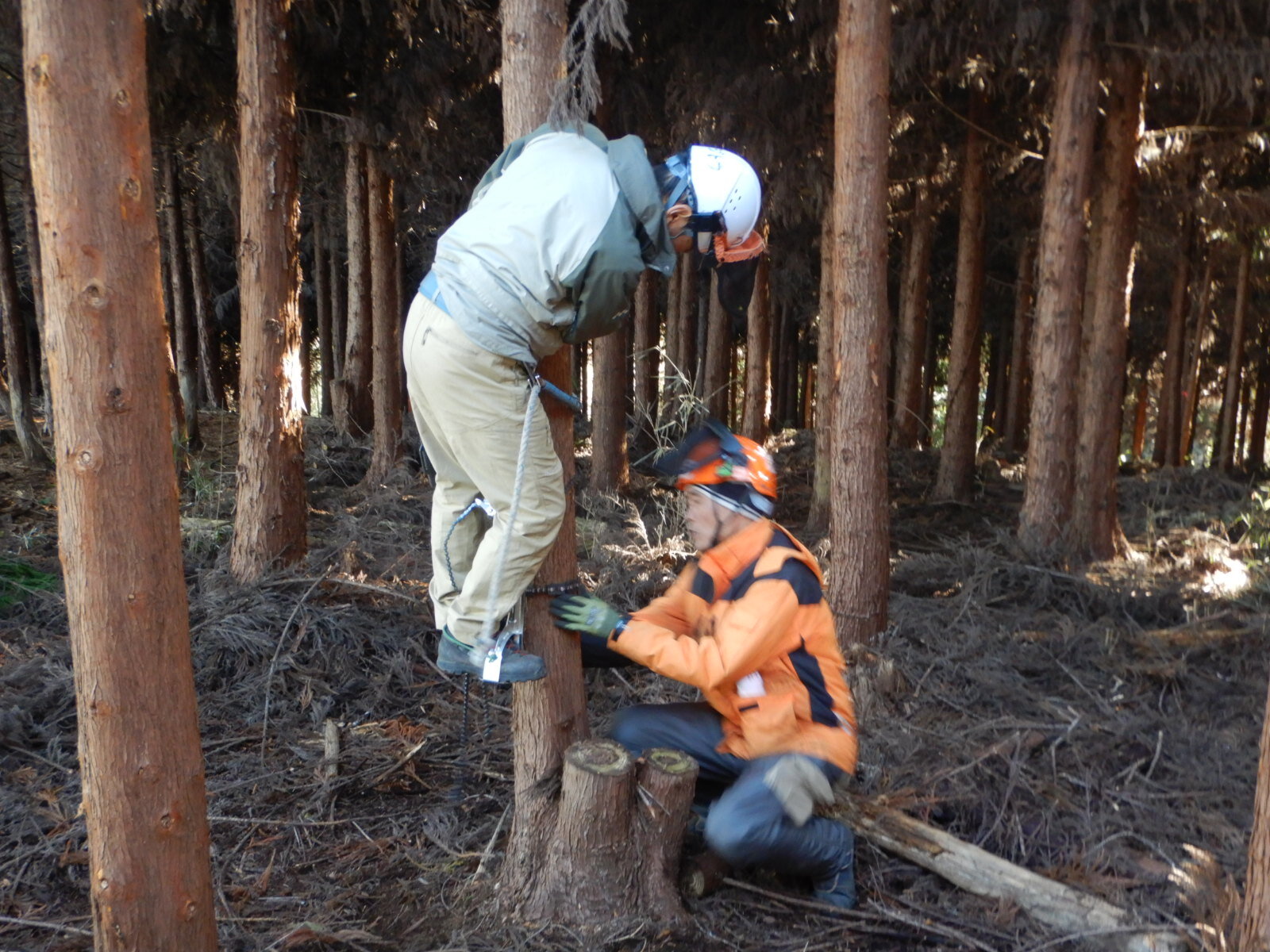 枝打ち経験の浅いメンバーに登降機の扱い方や鋸の正しい使い方を丁寧に説明しています。