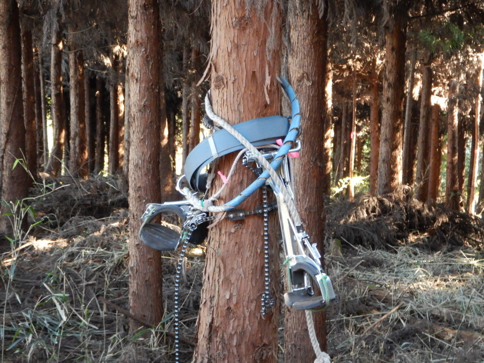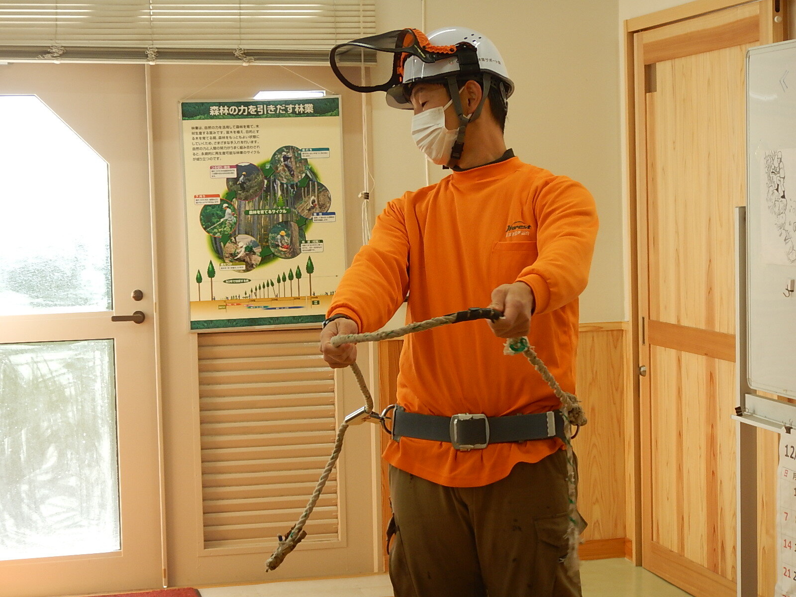 メンバーの自己紹介の後、安全講習を行いました。登降機や鋸の扱い方、そして体を支える胴縄の安全な使い方を説明しました。