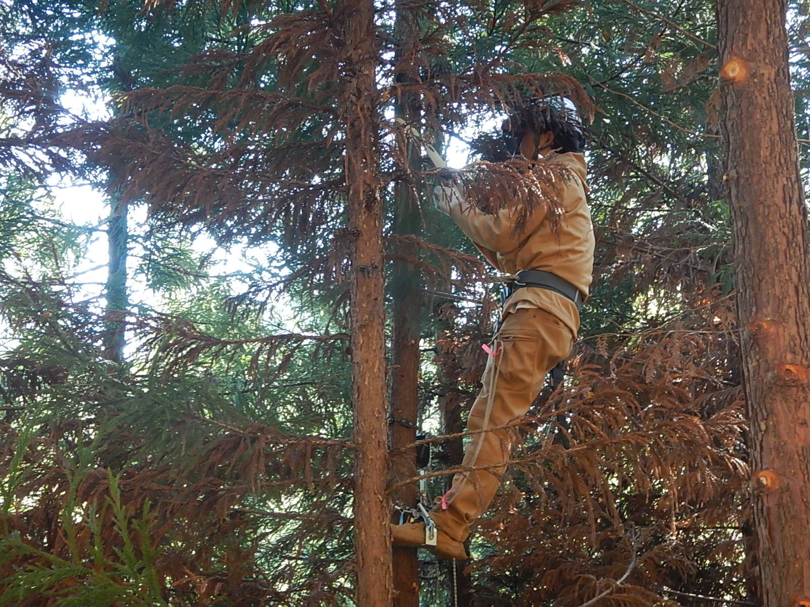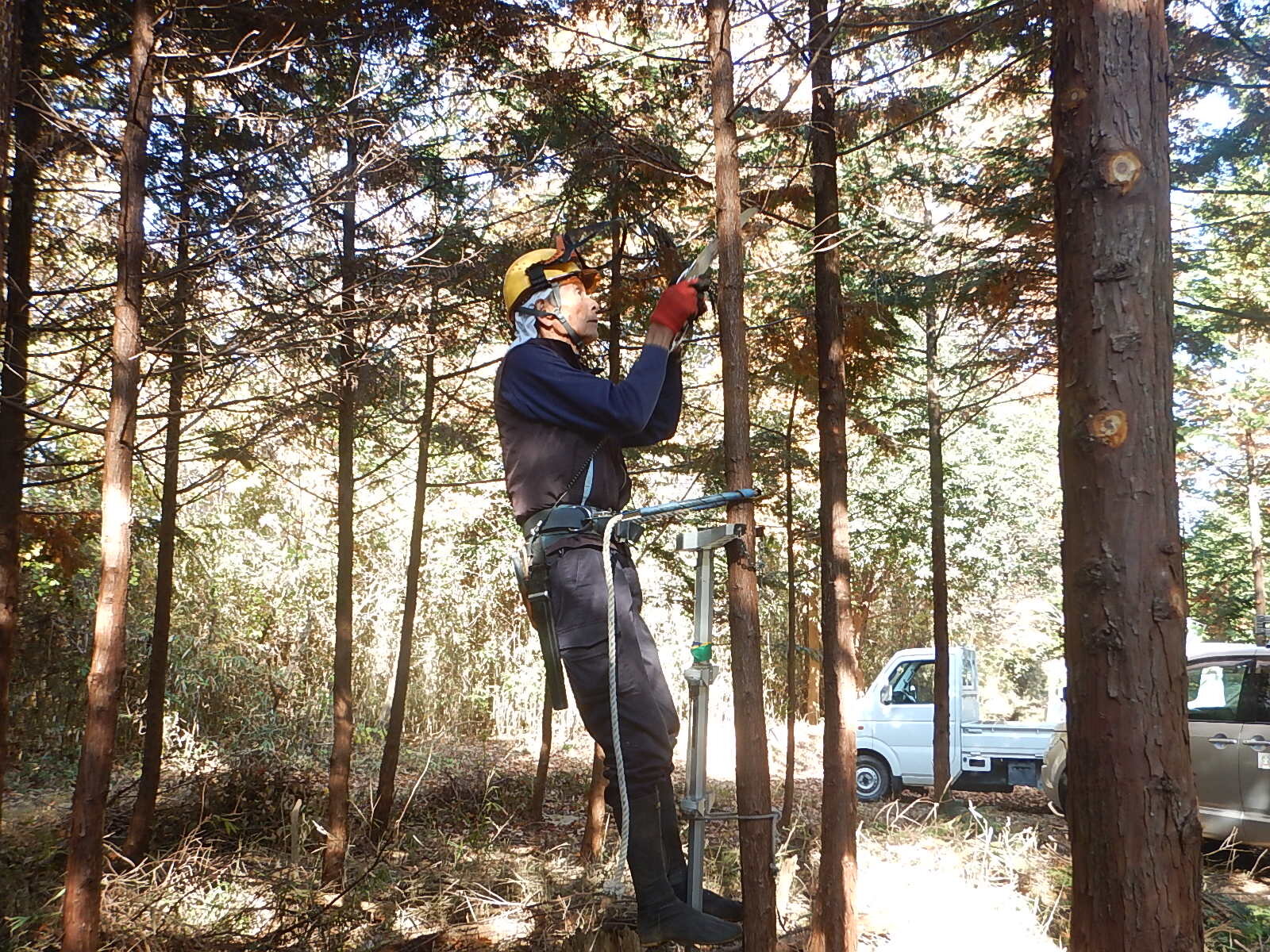 枝打ちする木によっては、枝打ち梯子を使って枝打ちを行います。