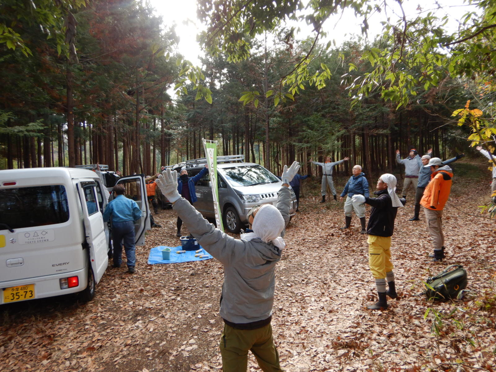 現地に着いたらすぐに準備体操を行います。危険予知活動では安全講習での内容の繰り返しも含めて注意事項を確認して活動場所に向かいます。