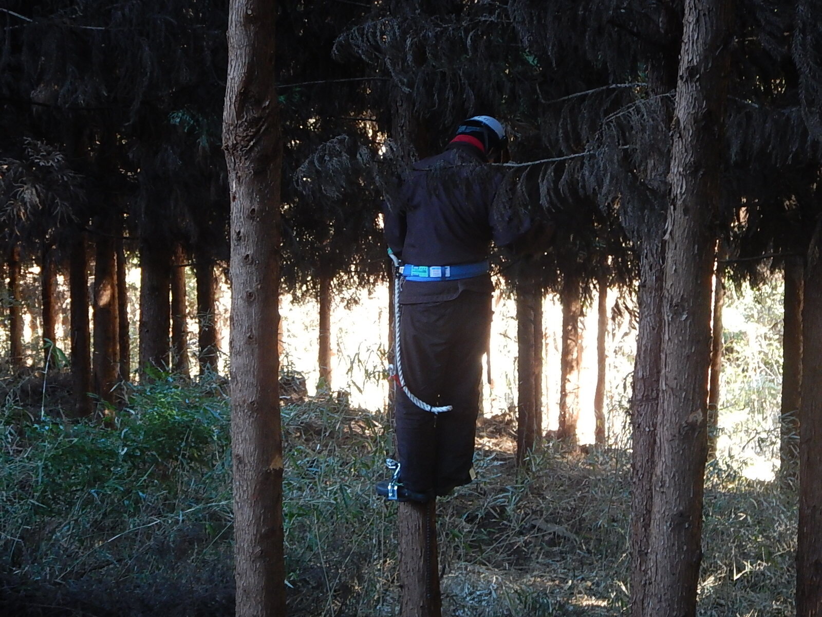 枝打ちに慣れているベテランのメンバーは指導員と相談しながら木に登り、枝打ちを進めていきます。