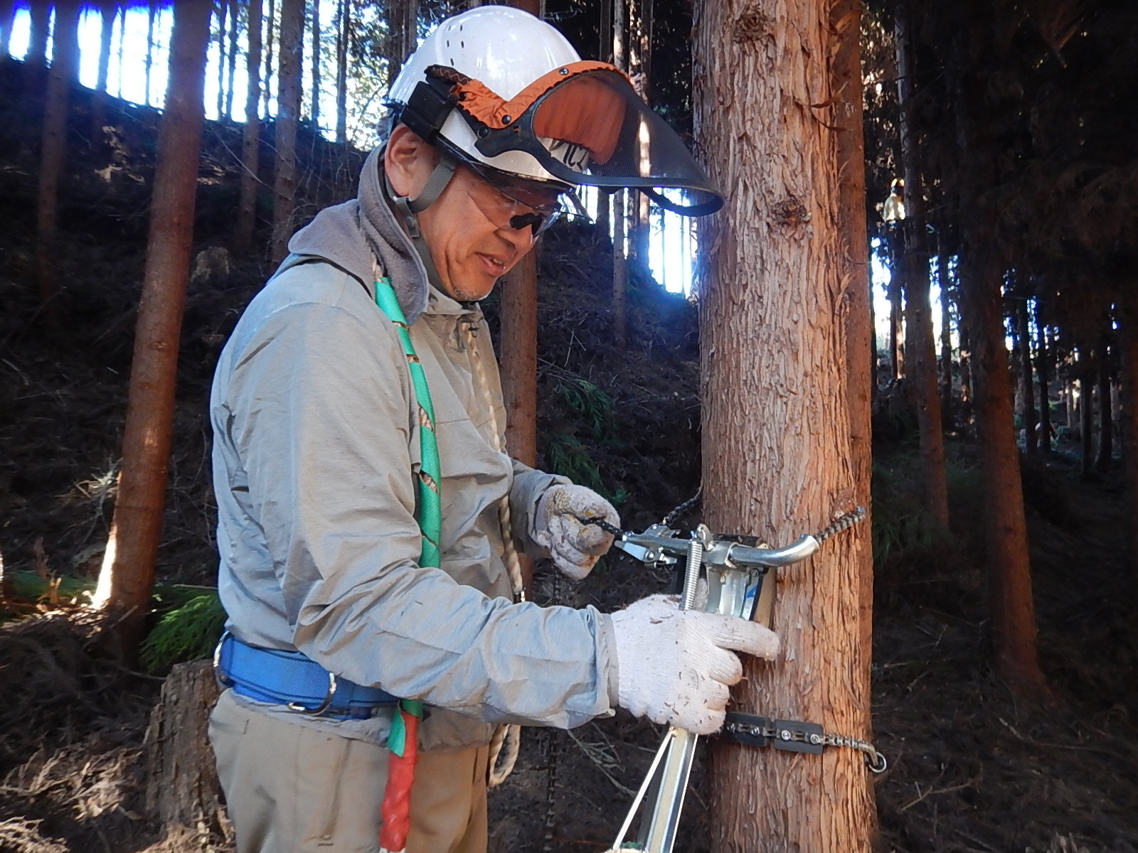 慣れている方に、登降機を木に取り付けるところを見せてもらいました。素早い!