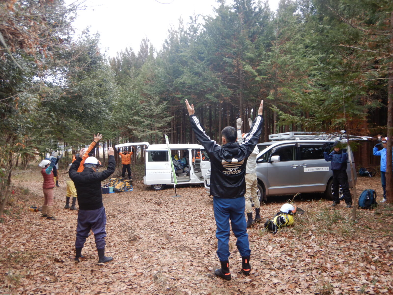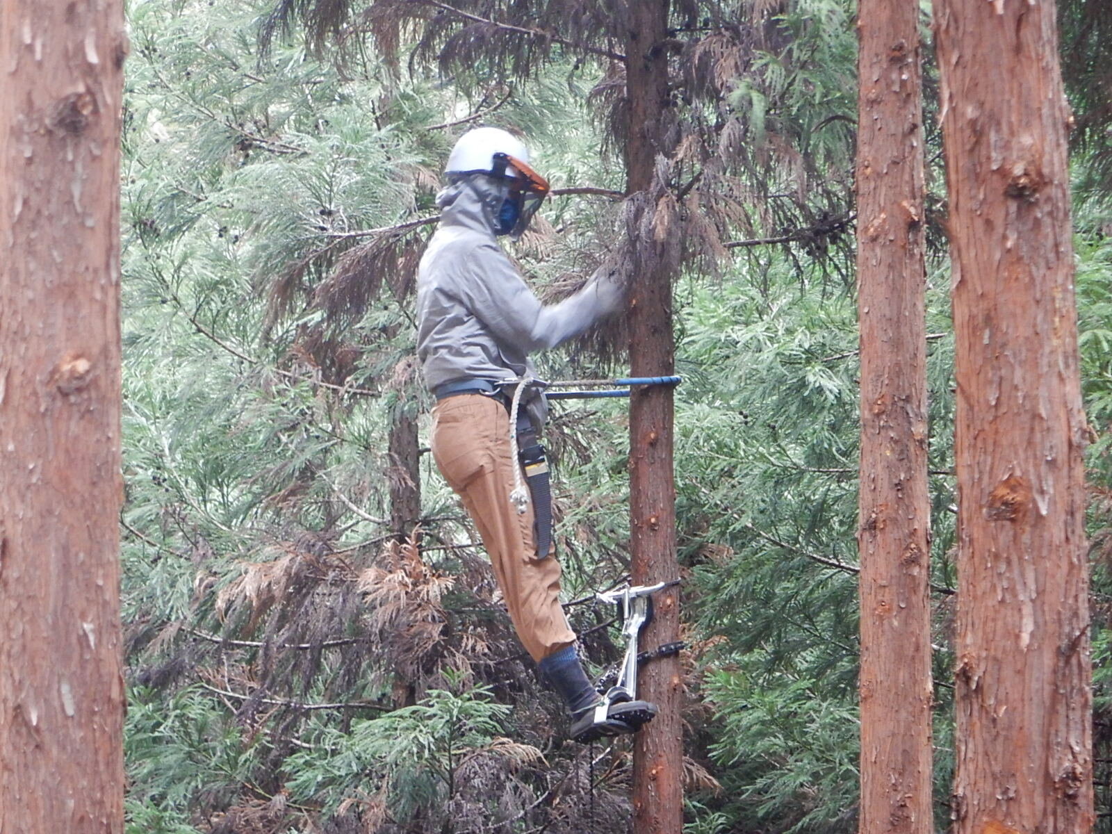 枯れ枝がとても多いので作業着はスギとヒノキの枯れ葉だらけになります。服は生地がなめらかな化学繊維のものがおすすめです。