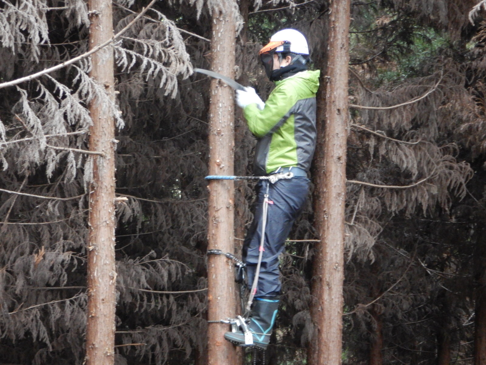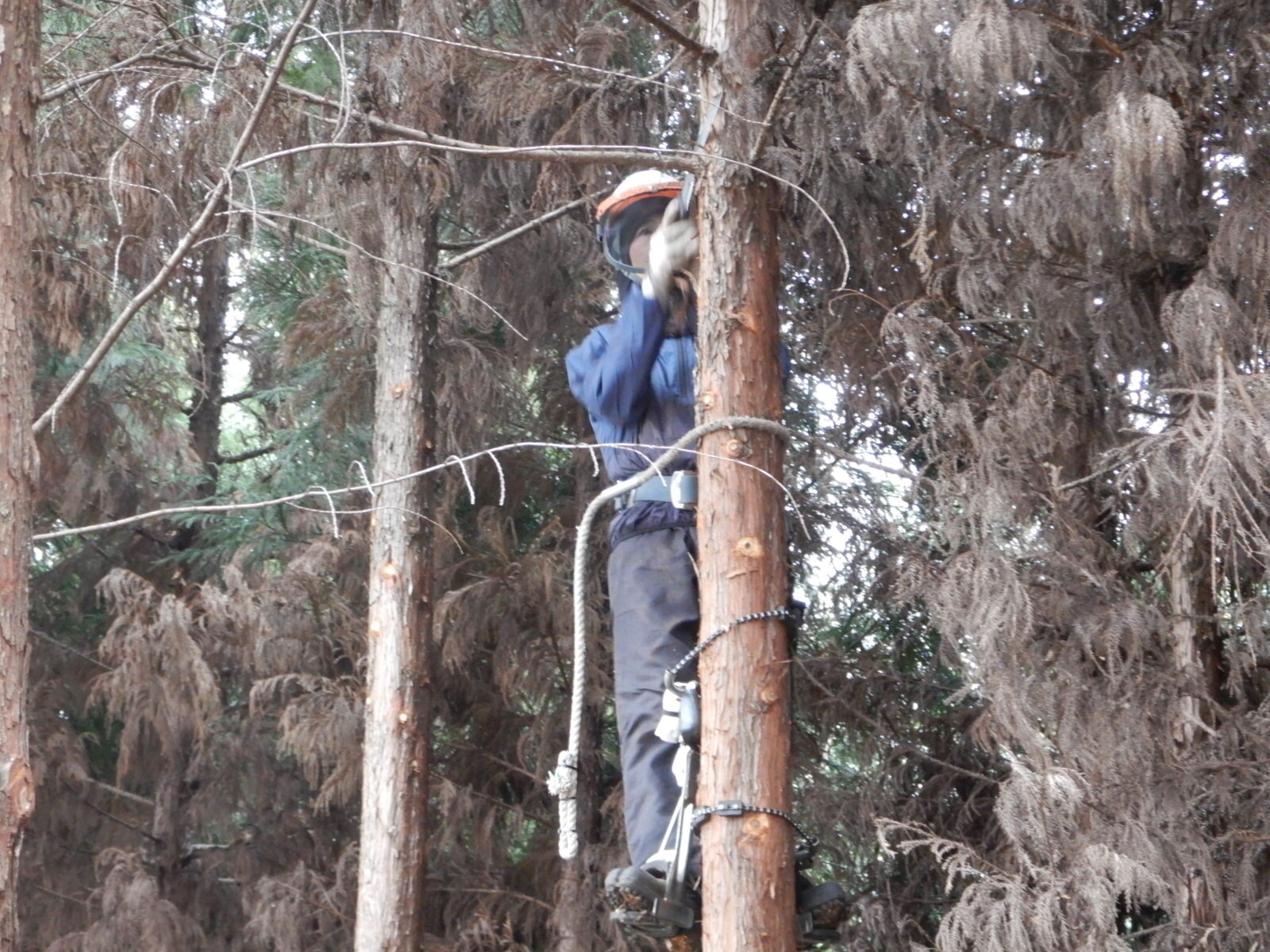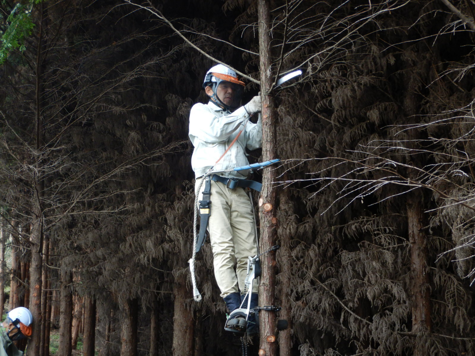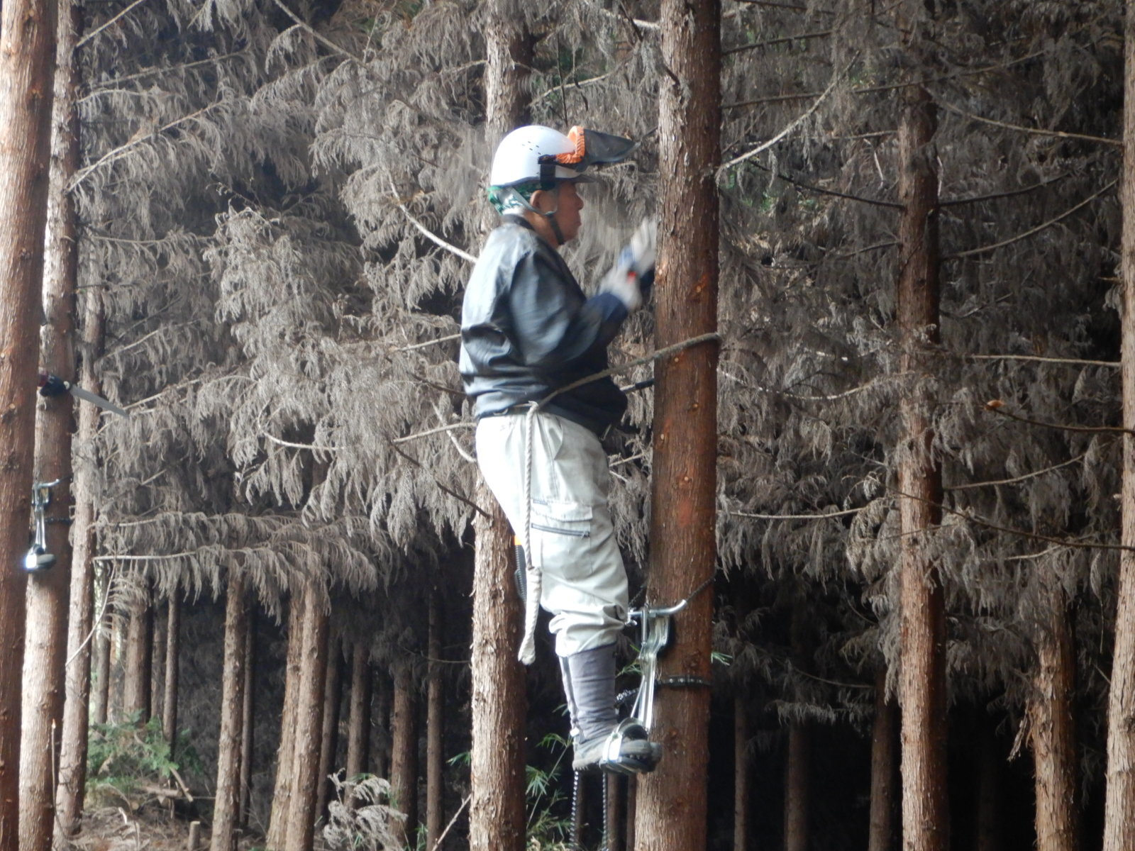 次に枝打ちする木に登降機を設置しているところです。