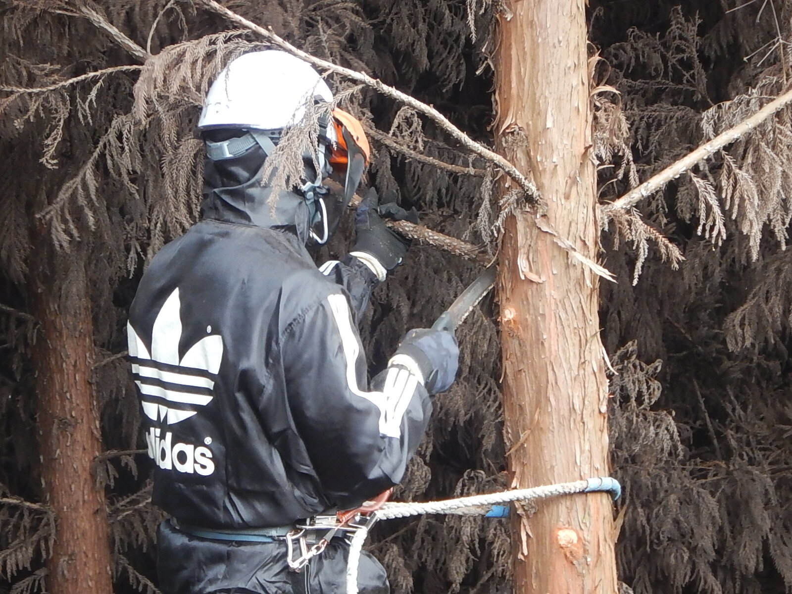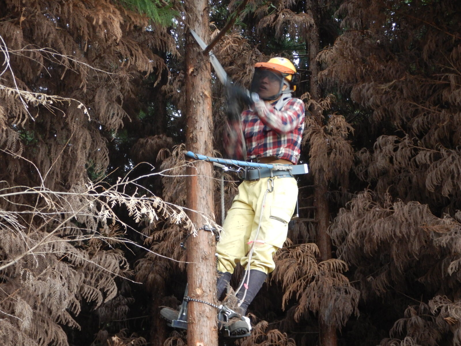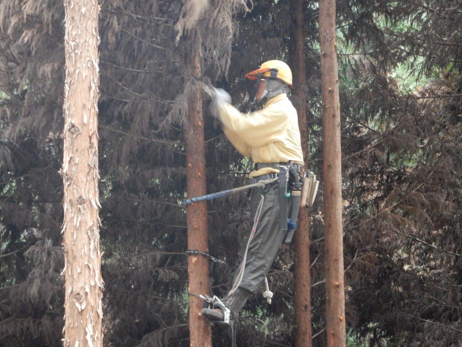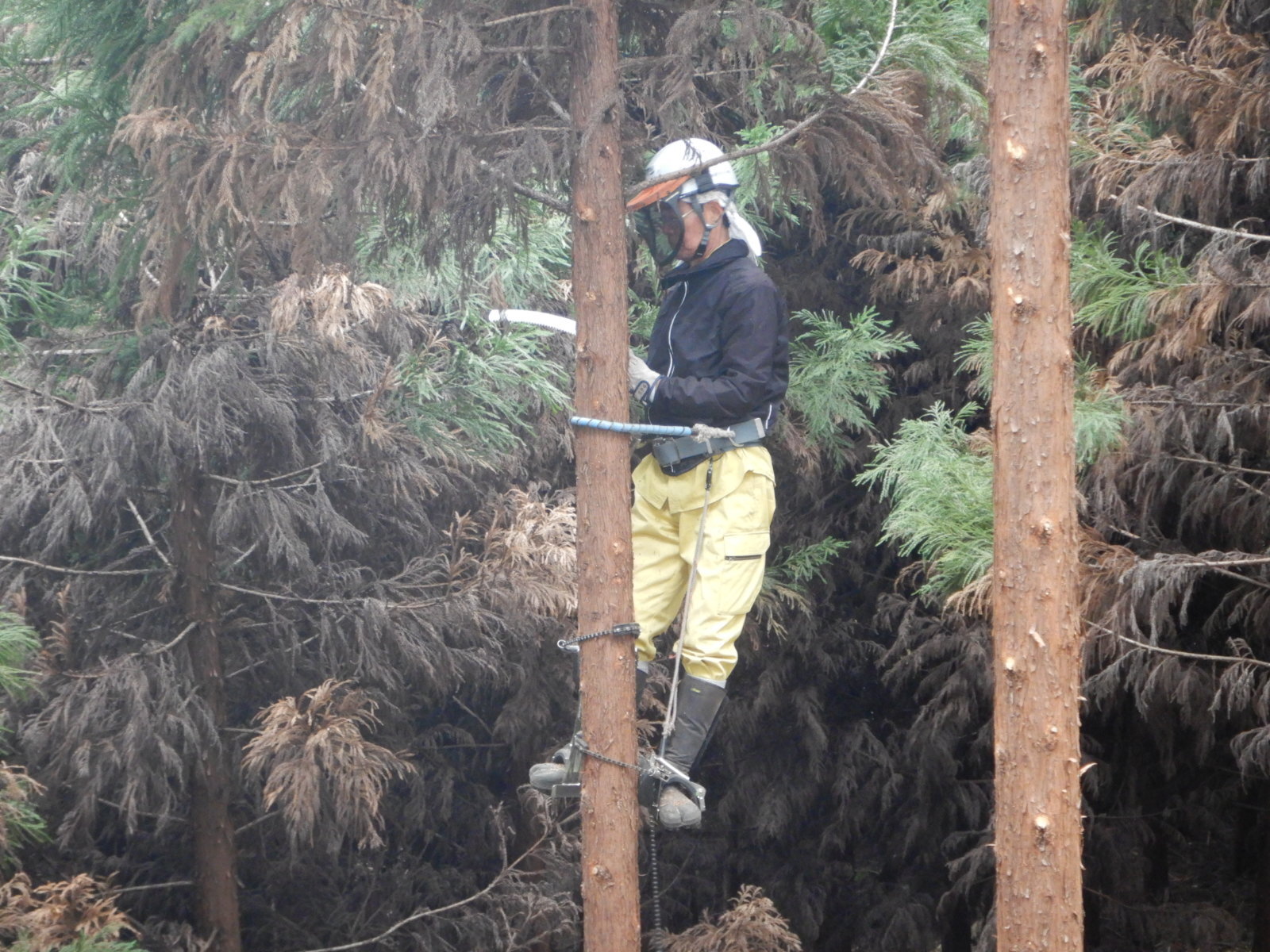 次に枝打ちする木に登降機を設置しているところです。