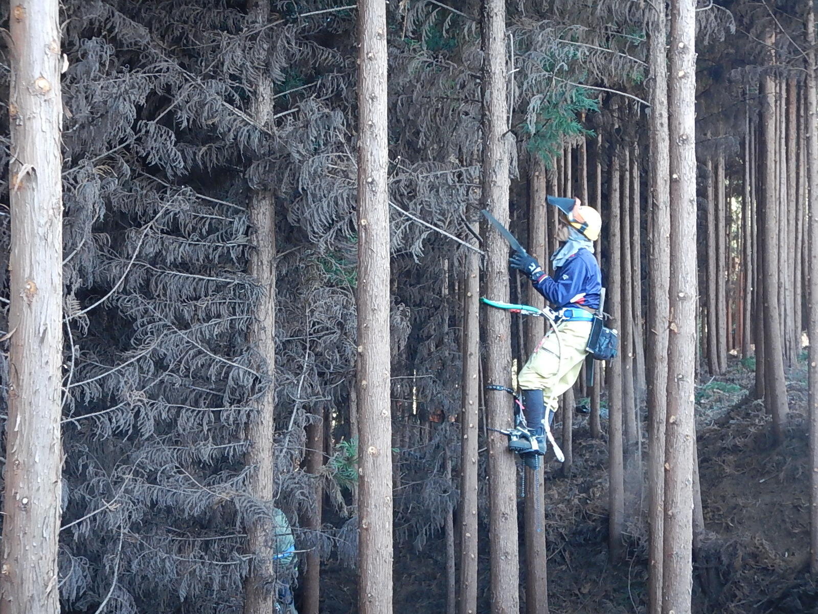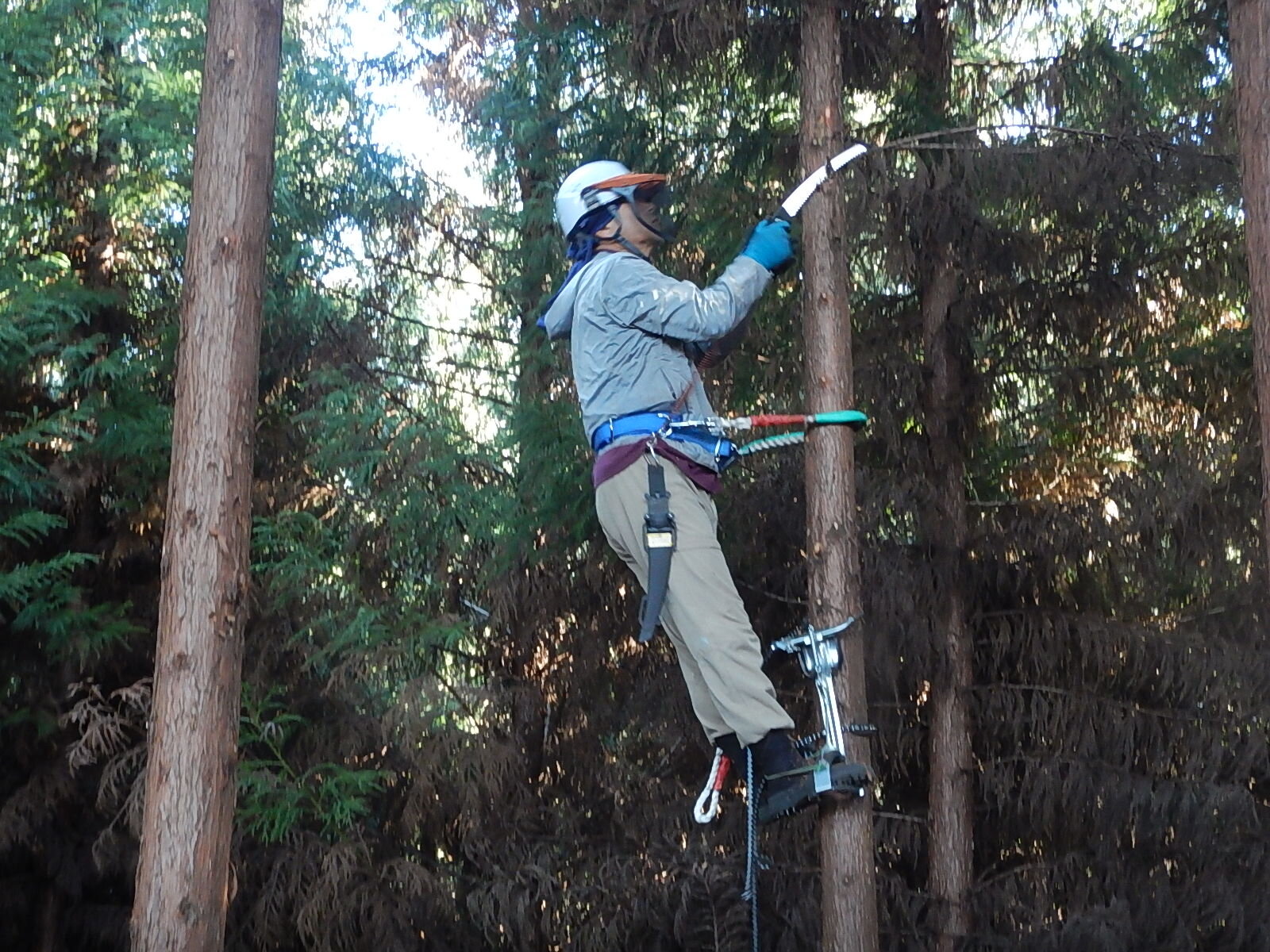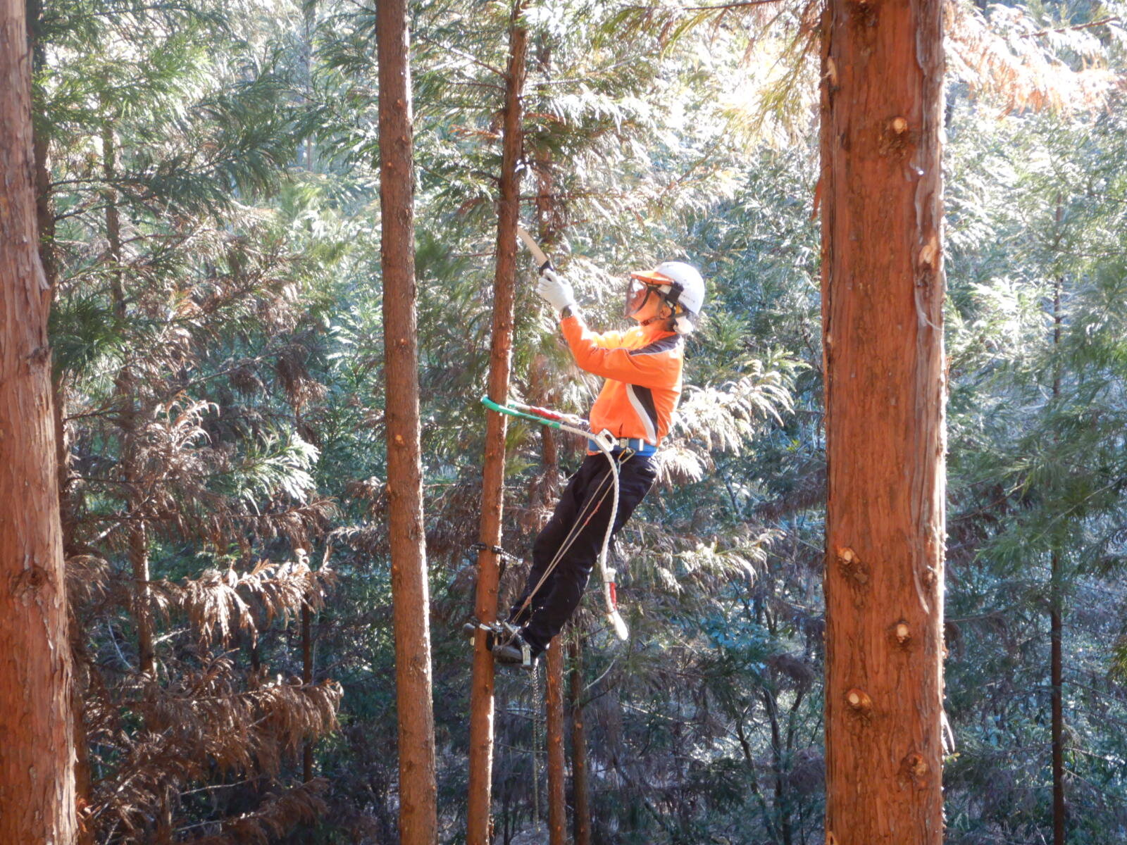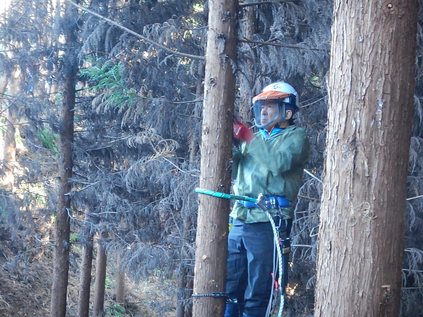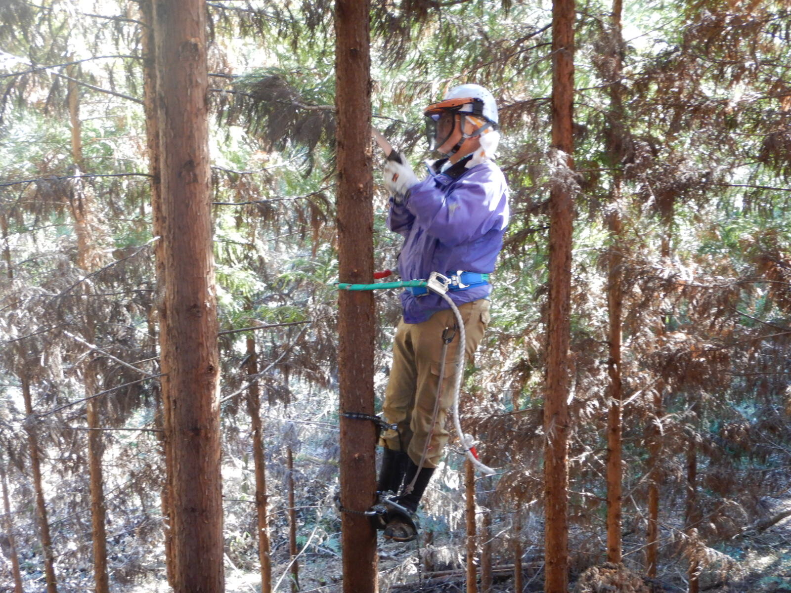 枝打ち初めてのメンバーは登降機の使用方法から学びます。ベテランメンバーは指導員指示のもと、各自のペースで木に登ります。