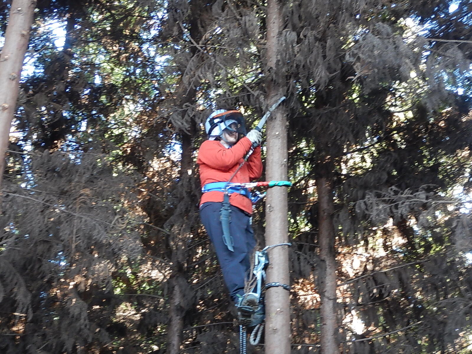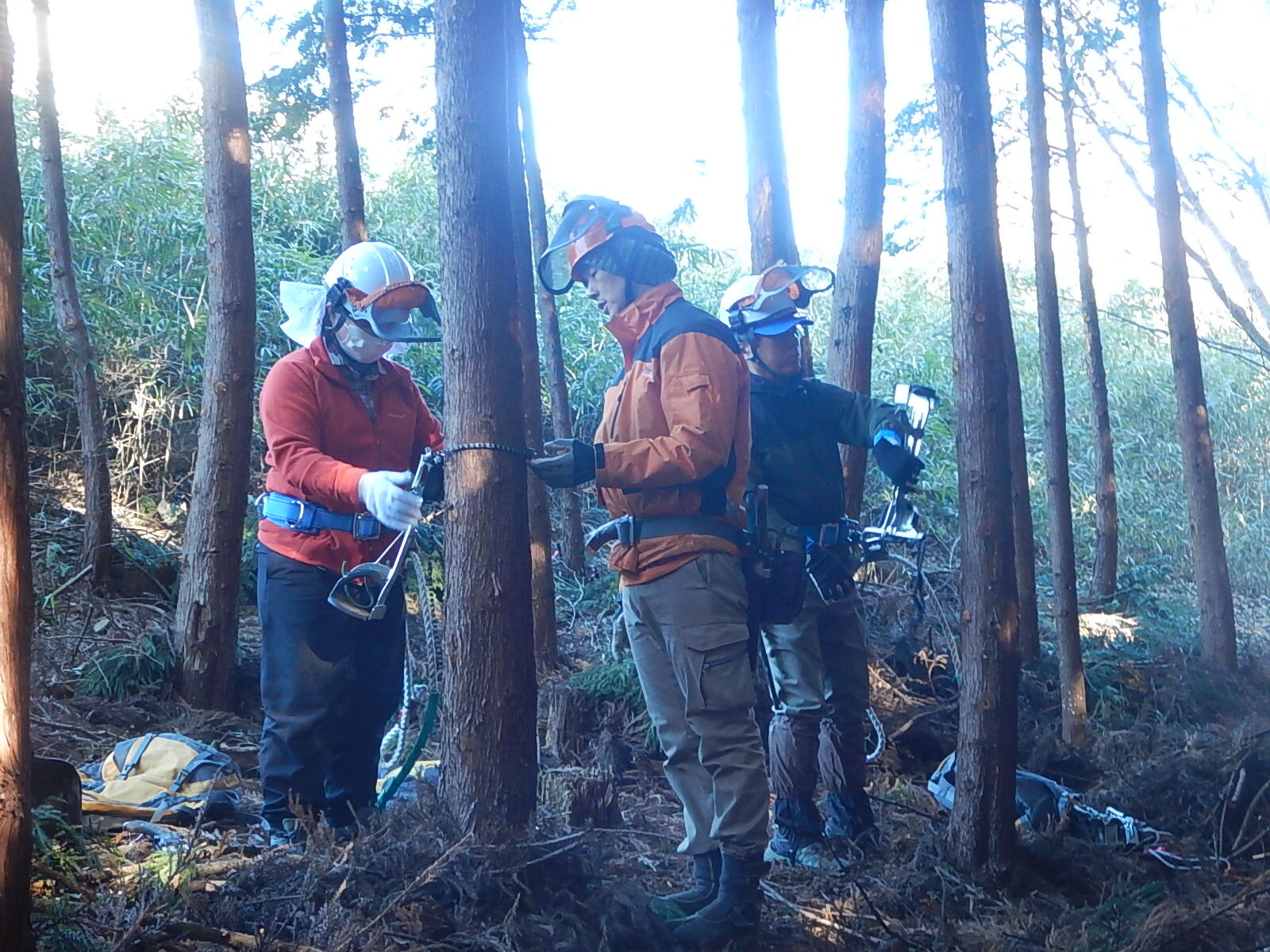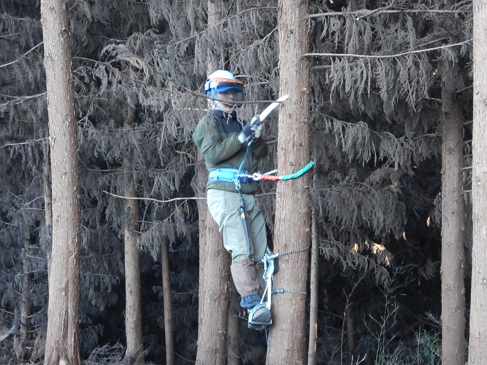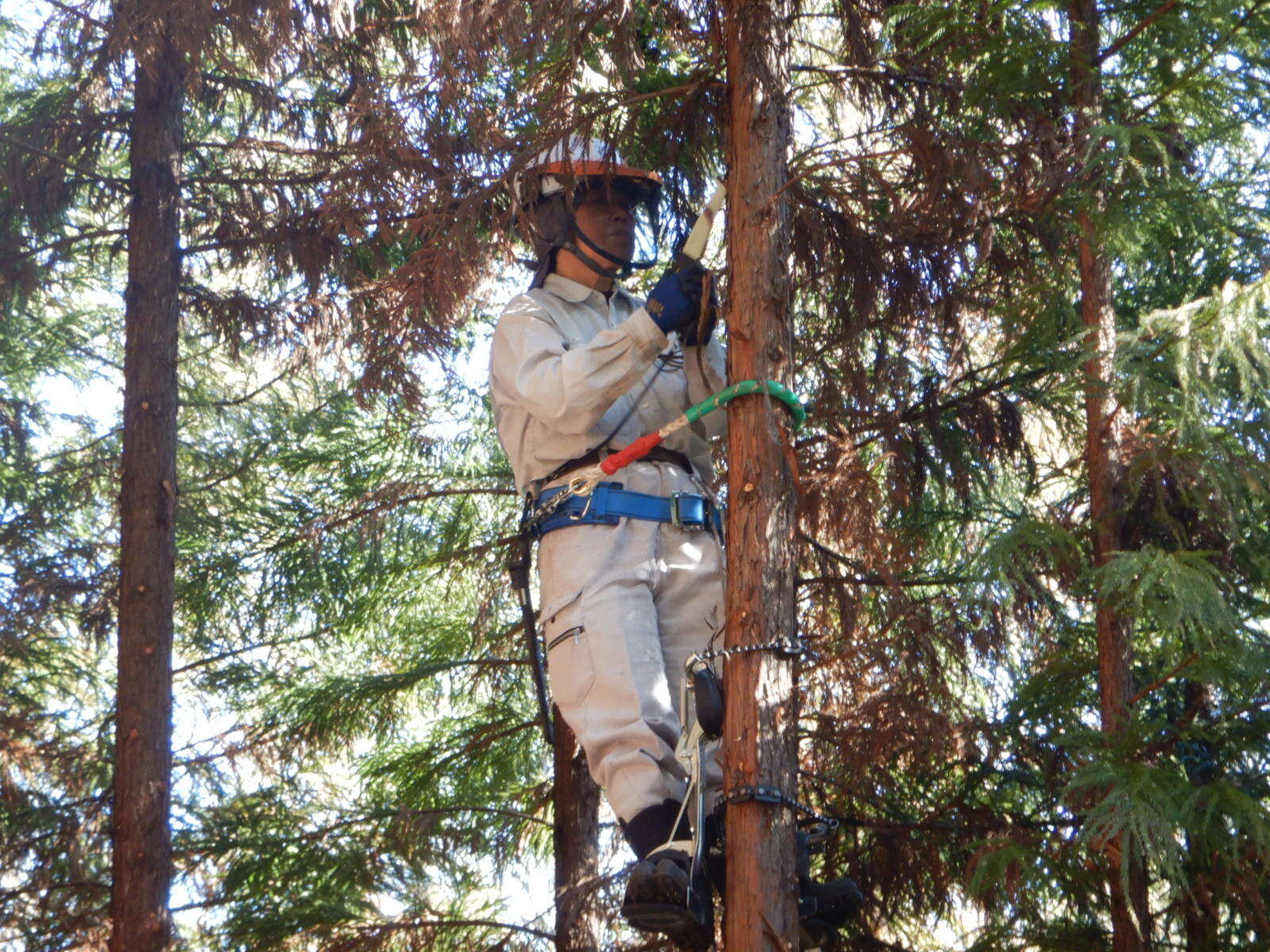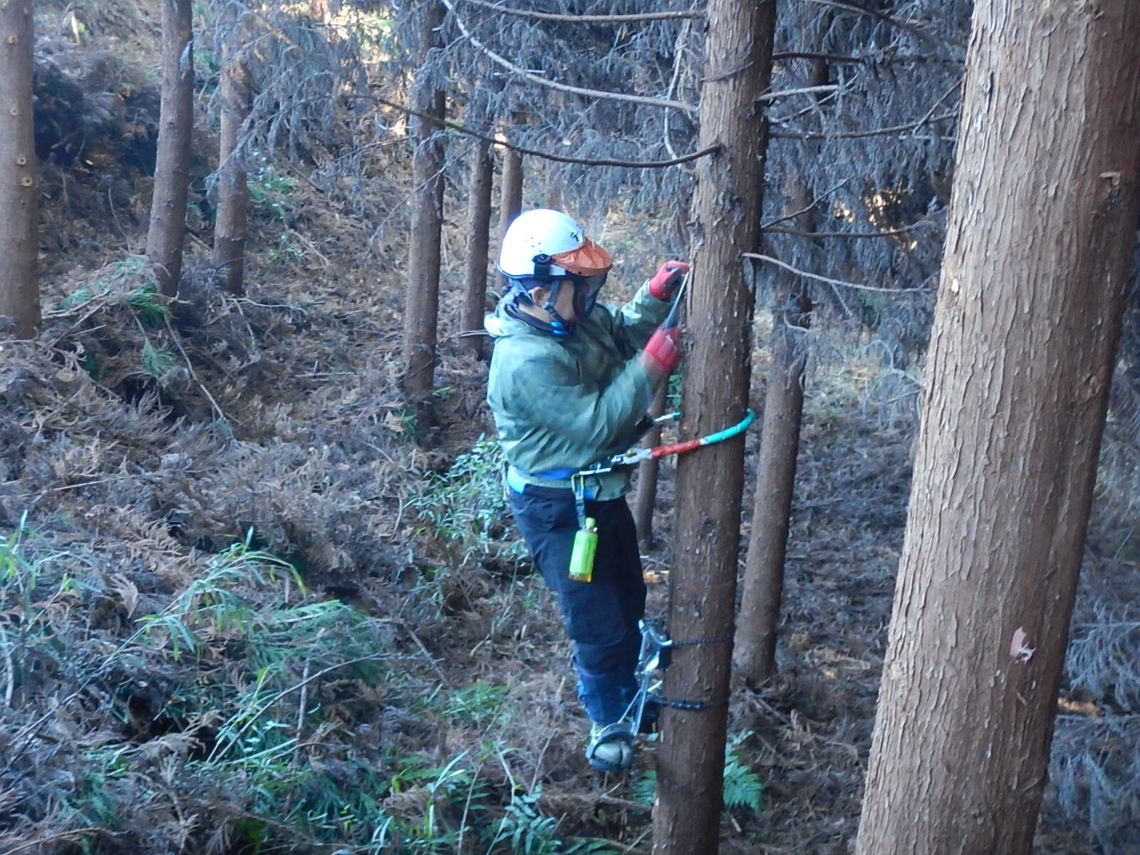 枝打ち初めてのメンバーは登降機の使用方法から学びます。ベテランメンバーは指導員指示のもと、各自のペースで木に登ります。