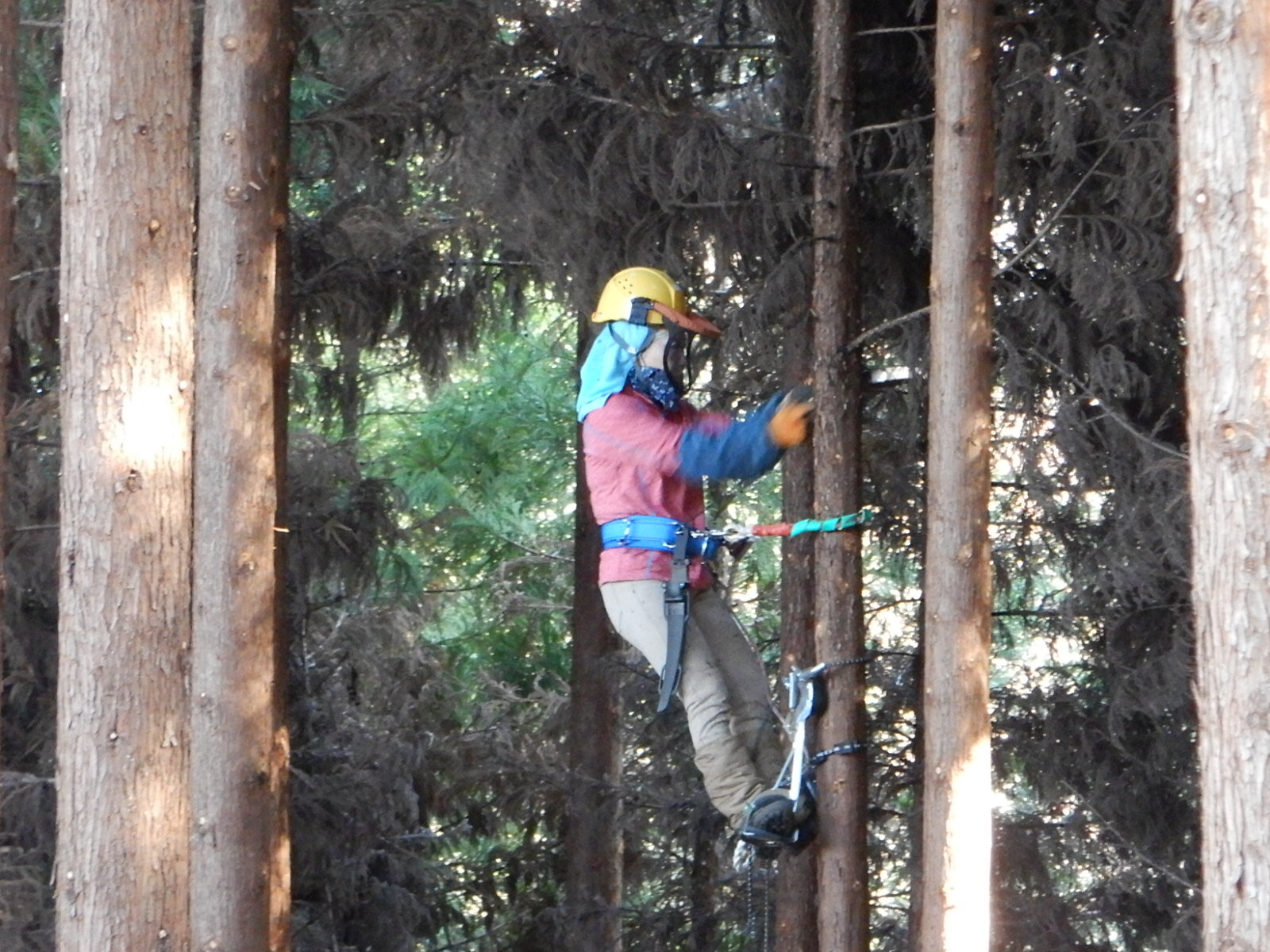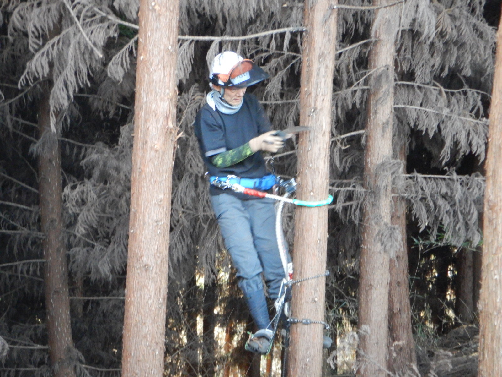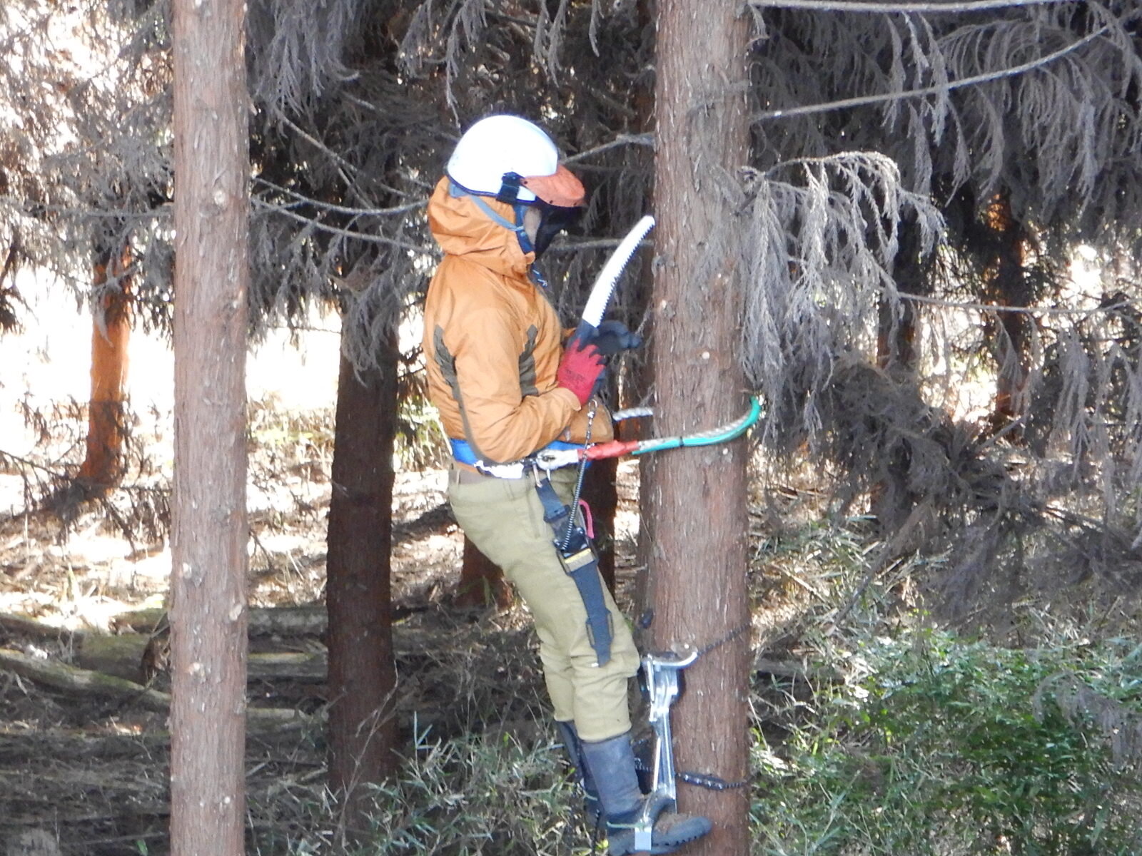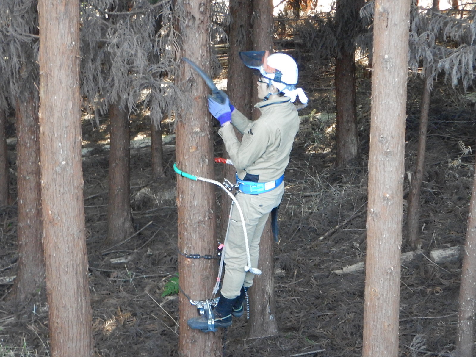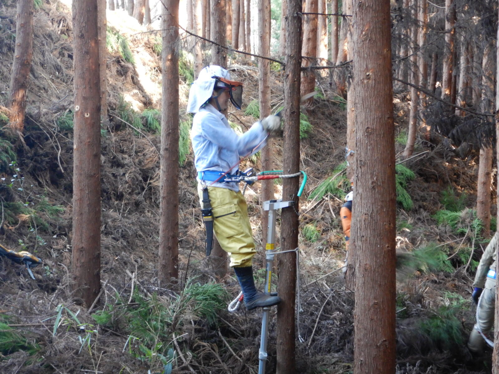 初参加の方には登降機などの基本から指導しますが、最初はどうしても木にしがみつくような形になりがちです。