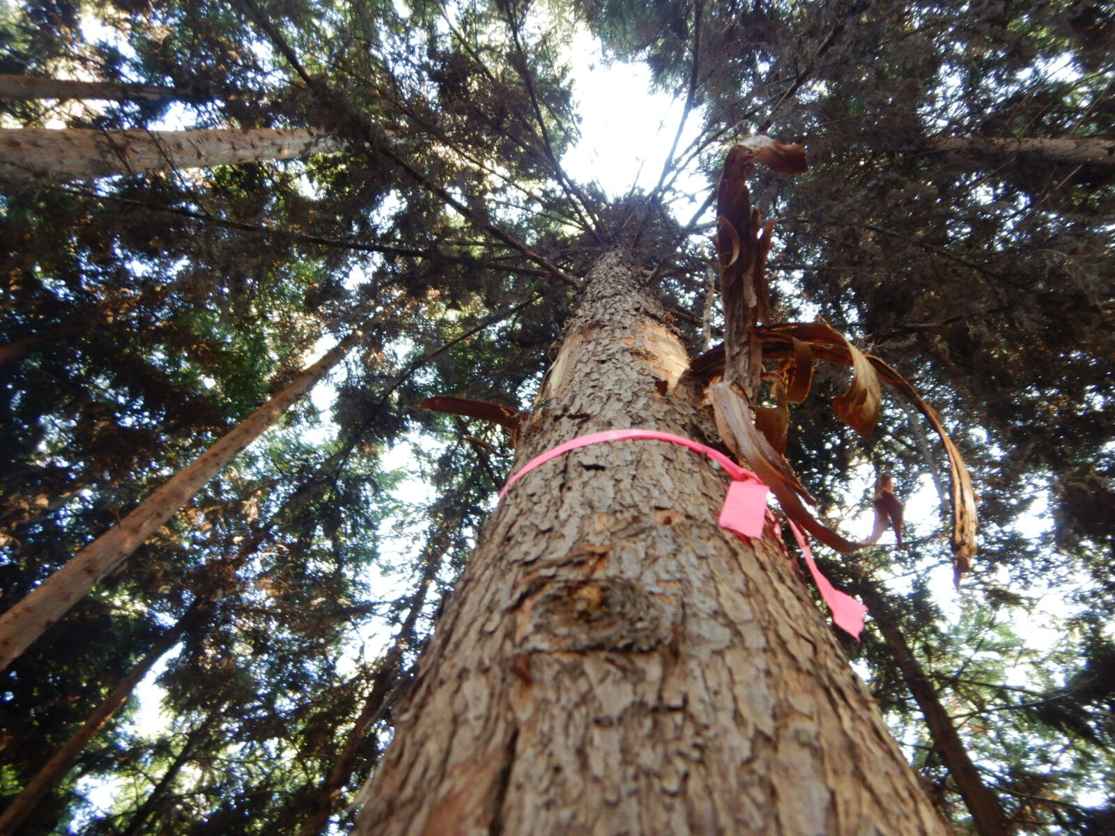 この木は普通のスギの木に見えますが実は枯れている木です。間違って枝打ちしないようにピンクテープを付けて後日除伐します。