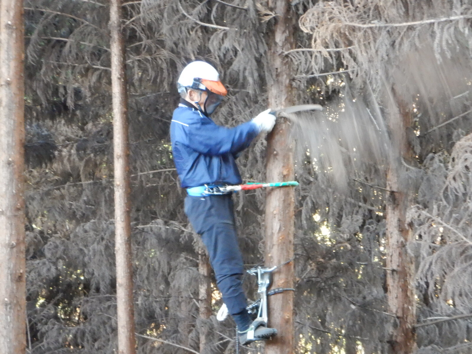 午後も黙々と枝打ちを進めていきます。枝を切った後は下に落ちた枝を木の根元に引っ掛けて横伏せして整理します。