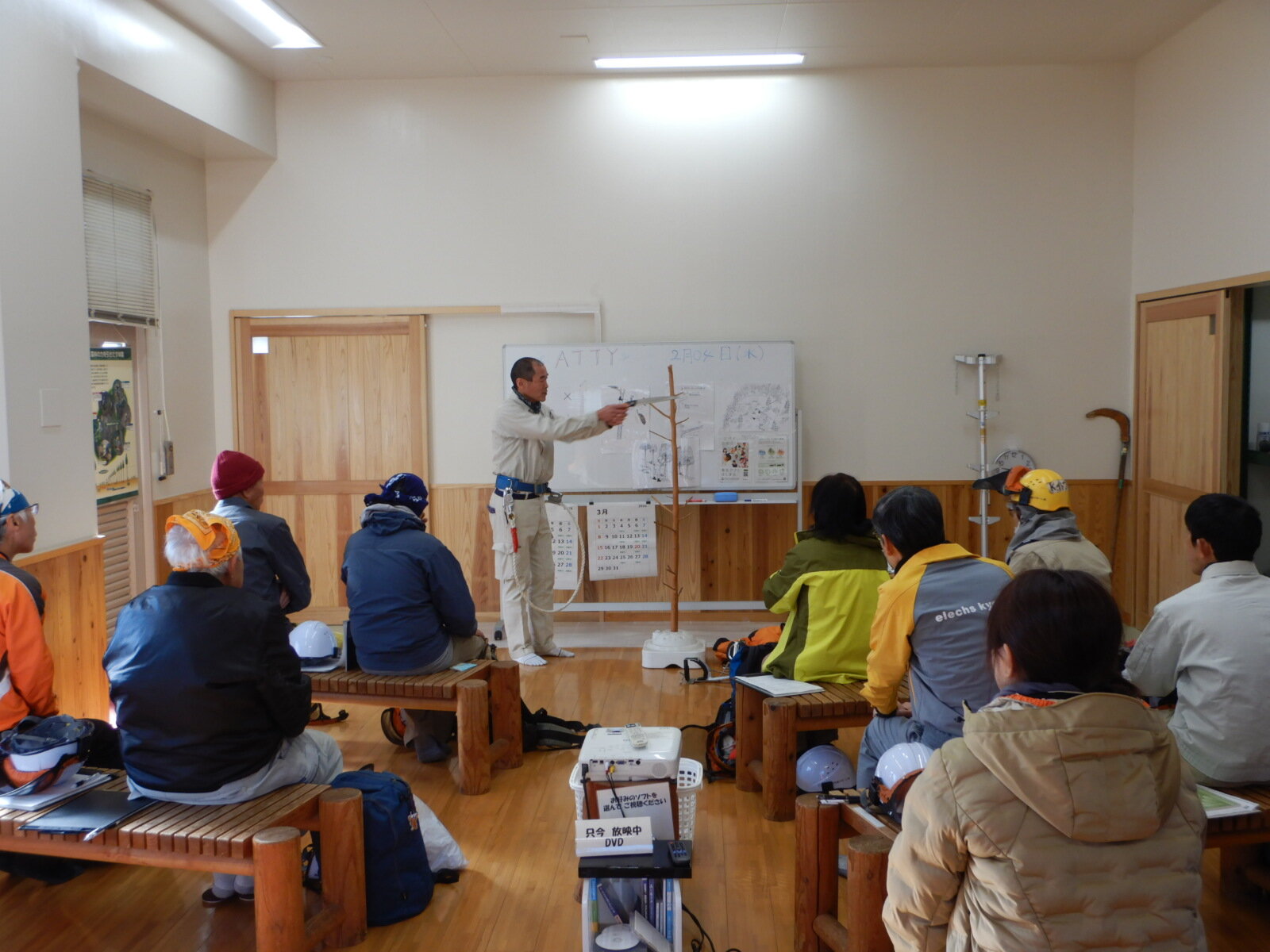 安全講習では登降機や鋸などの基本的な使い方を説明しますが、さらに詳しい説明は現地で作業を行いながら教えています。