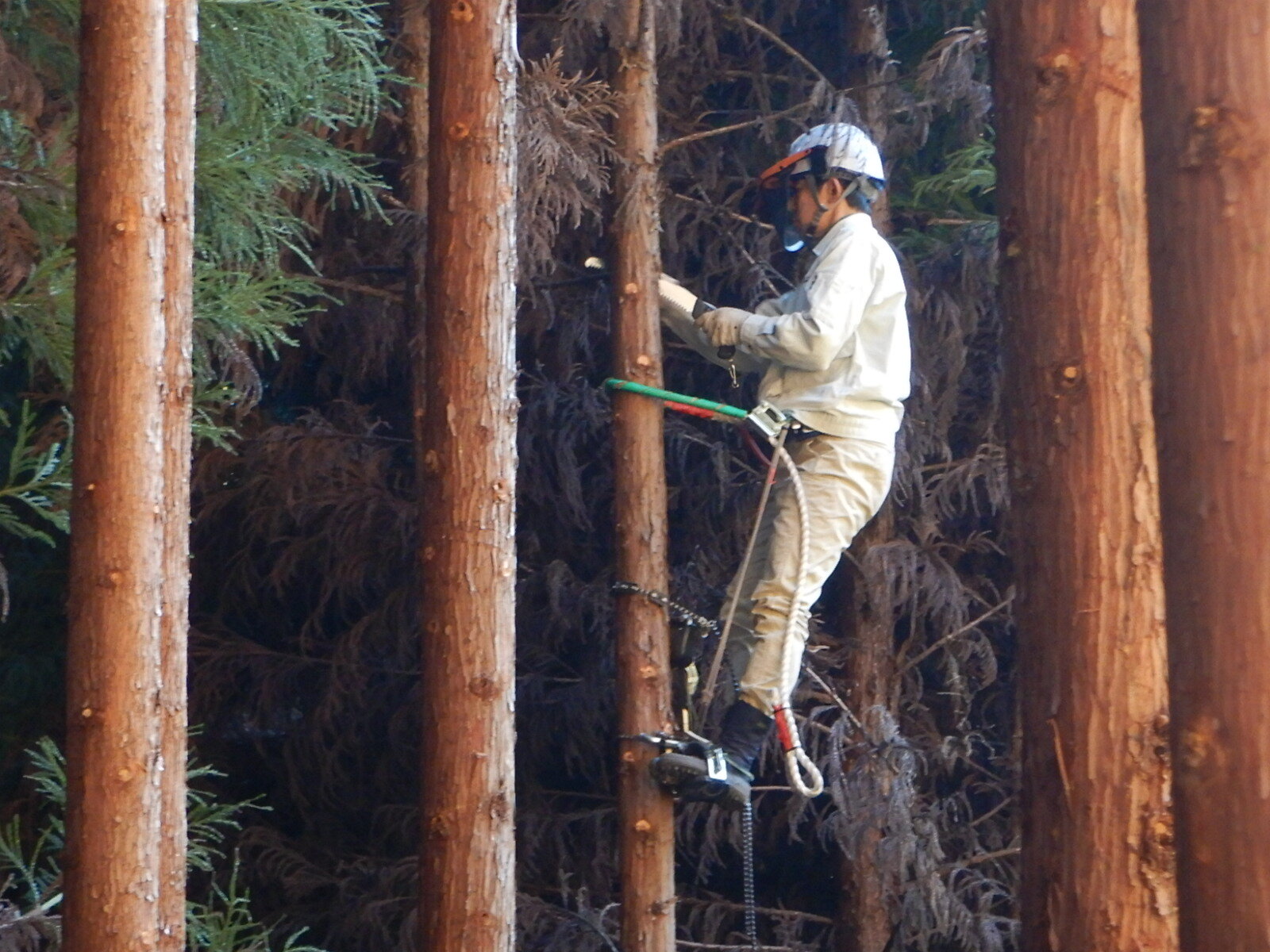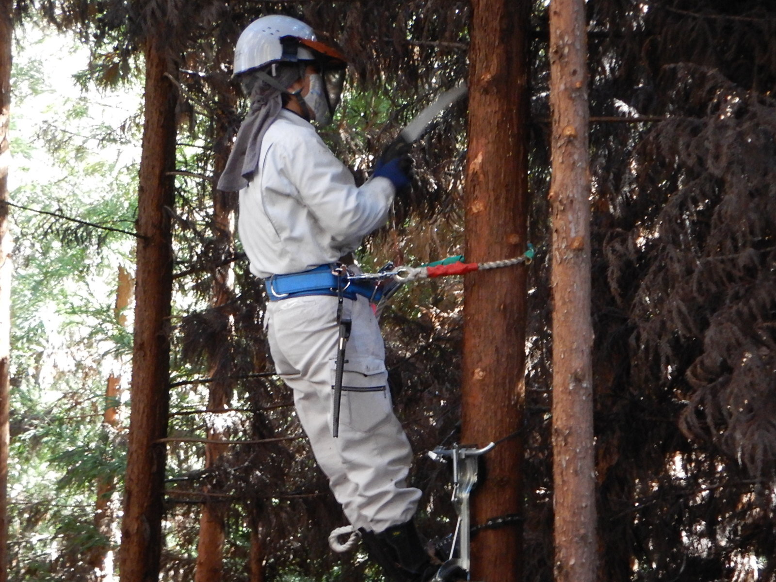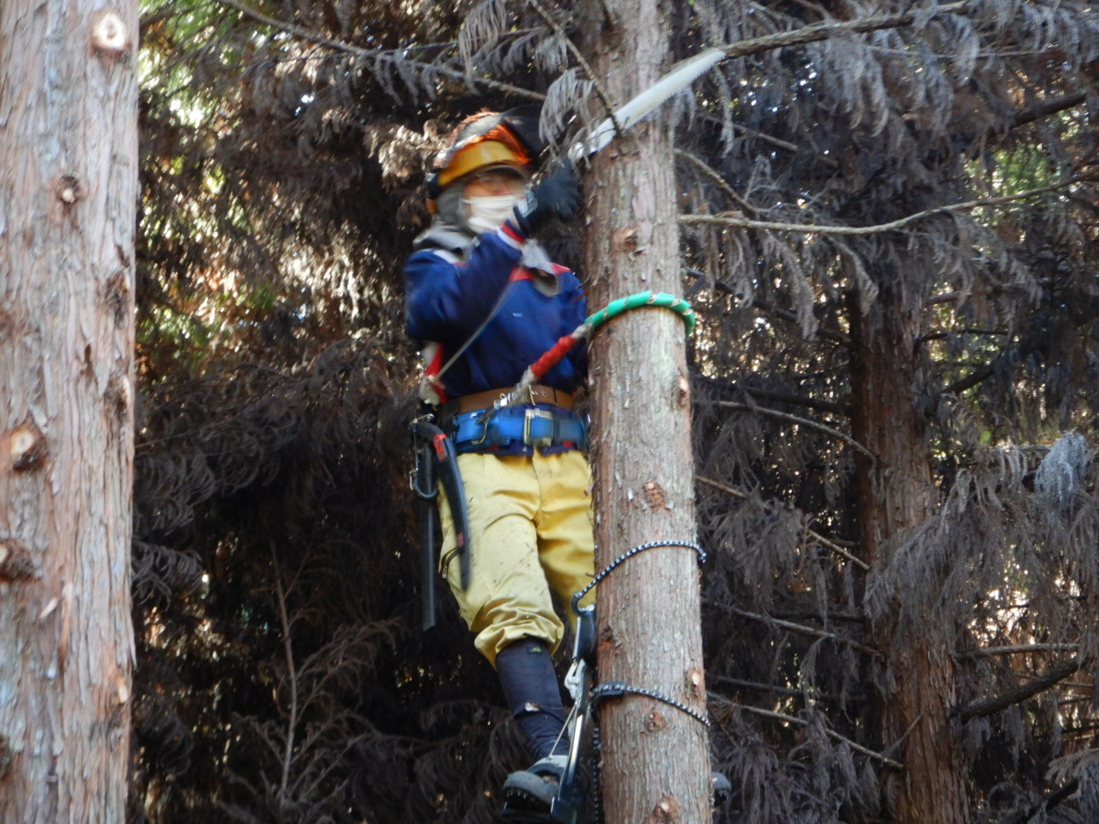ここの活動地では枝打ちする枝はほとんどが枯れ枝です。フェイスガードをしっかりとおろして作業を行わないと枯れ枝の葉っぱが粉になって飛び散ってきます。
