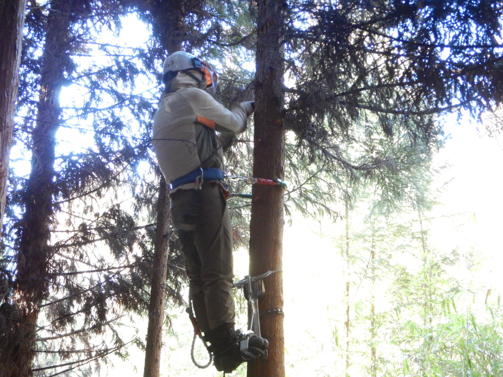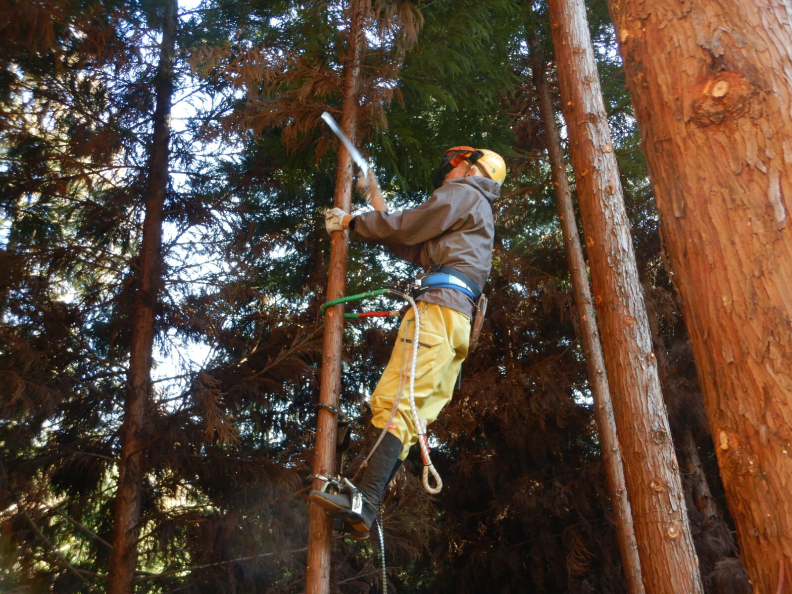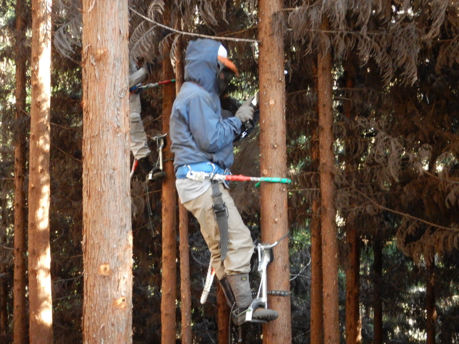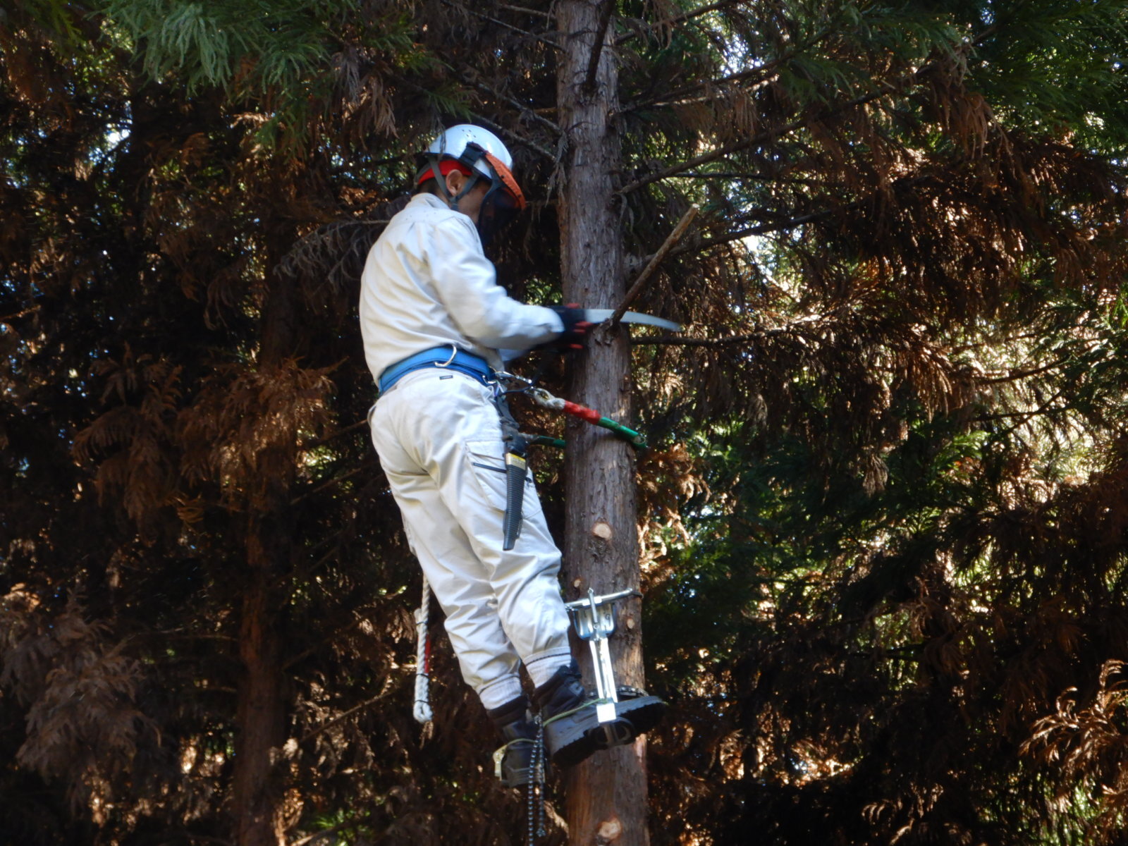 ここの活動地では枝打ちする枝はほとんどが枯れ枝です。フェイスガードをしっかりとおろして作業を行わないと枯れ枝の葉っぱが粉になって飛び散ってきます。