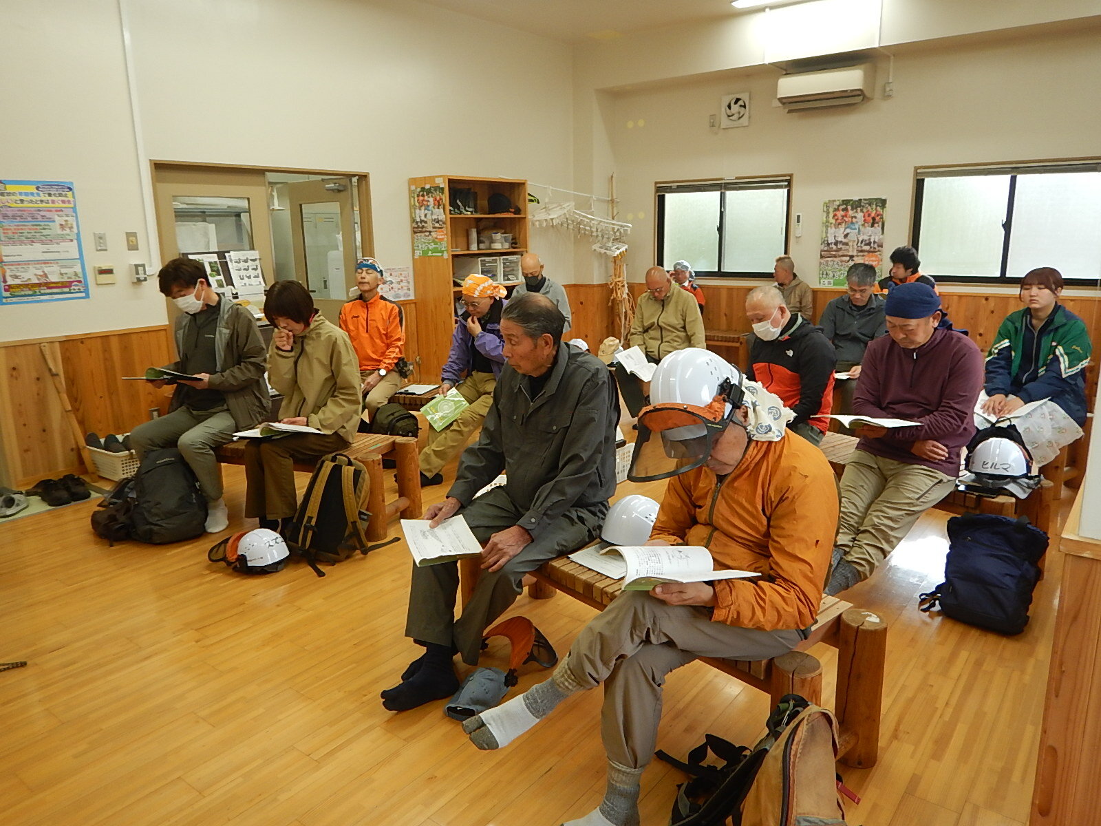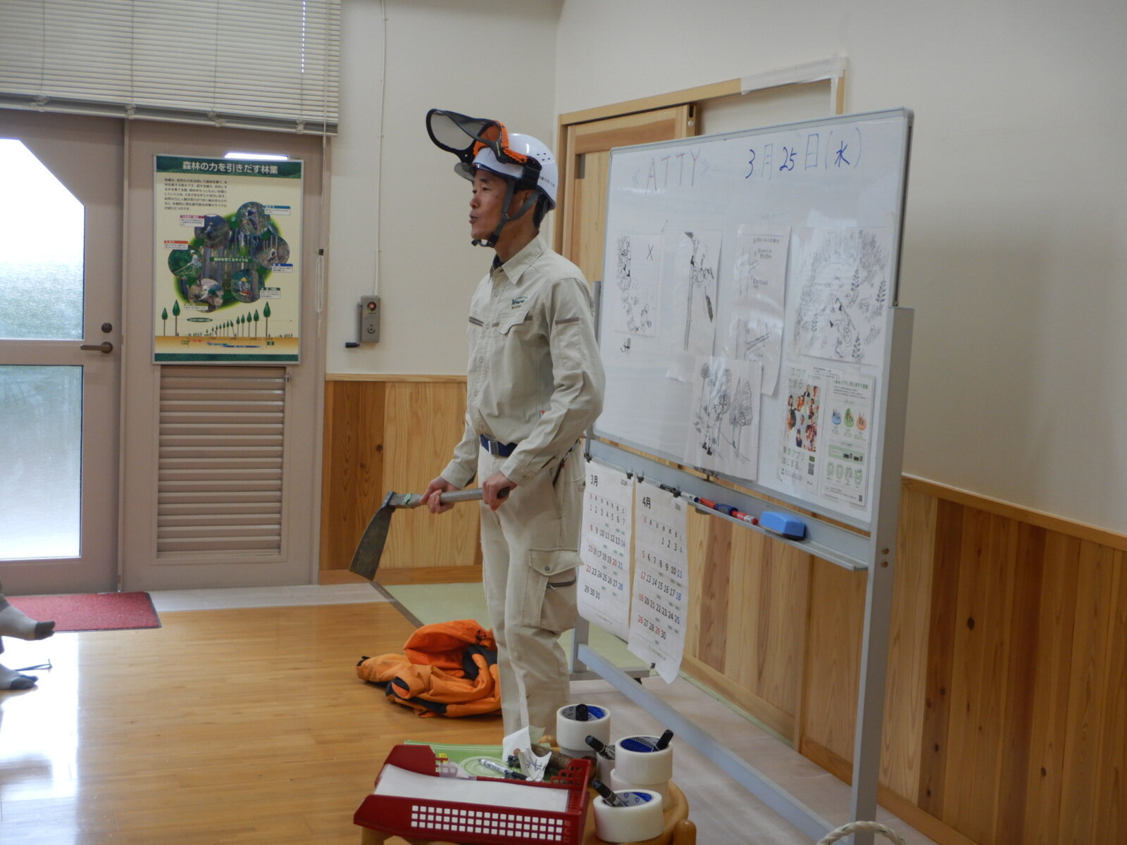 朝礼では全員、簡単な自己紹介を行い、その後、安全講習を実施しました。本日の作業内容は植栽です。指導員より鍬の正しい使い方について説明があり、「手工具による安全な造林作業」のテキストを使用しながら、林内での安全に配慮した作業を学びました。