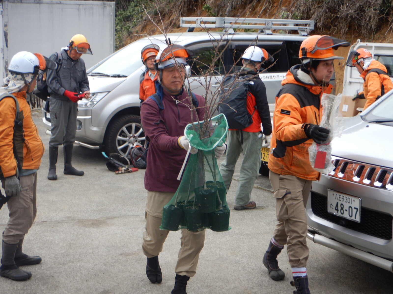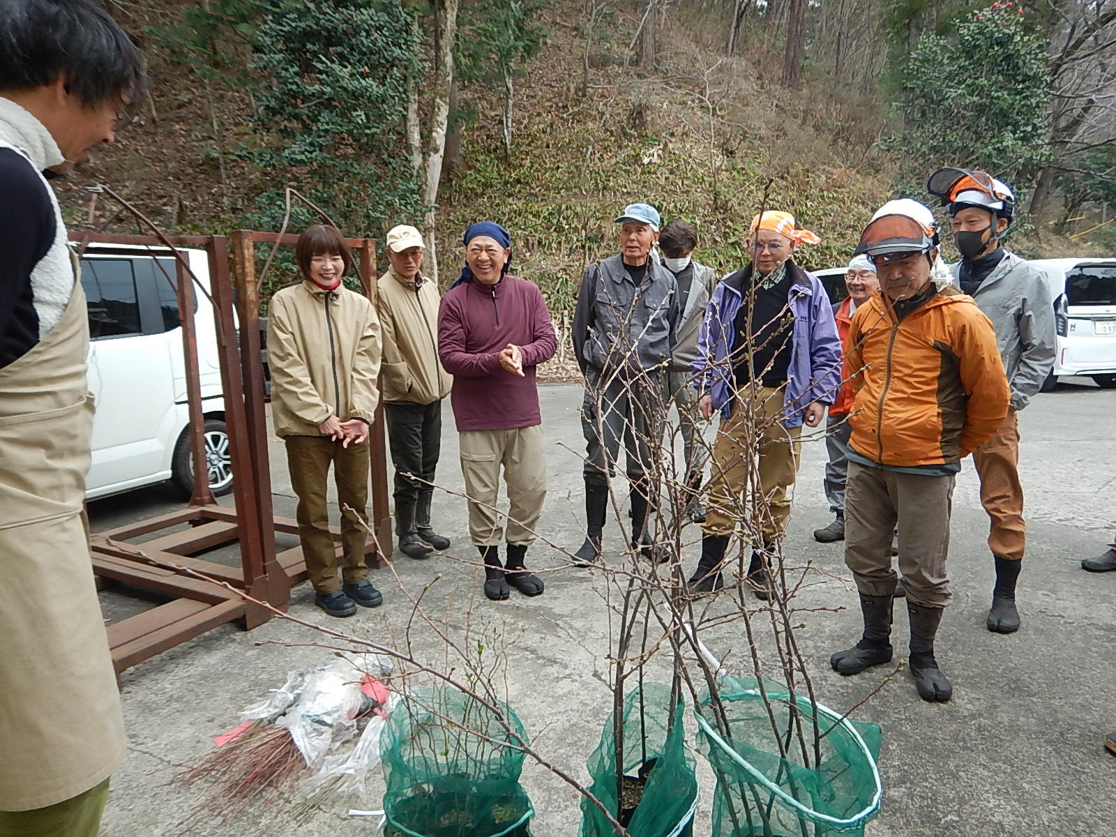 植栽する広葉樹の苗を受取り、作業地に向かいました。