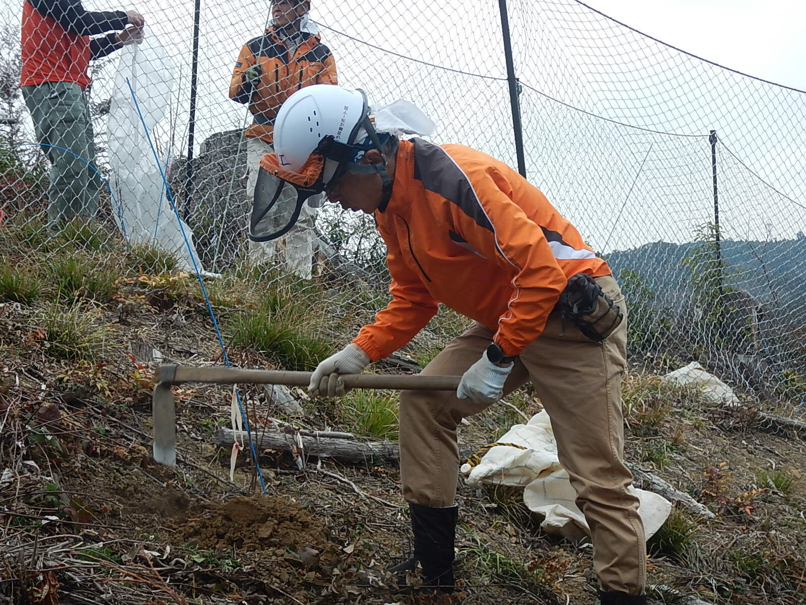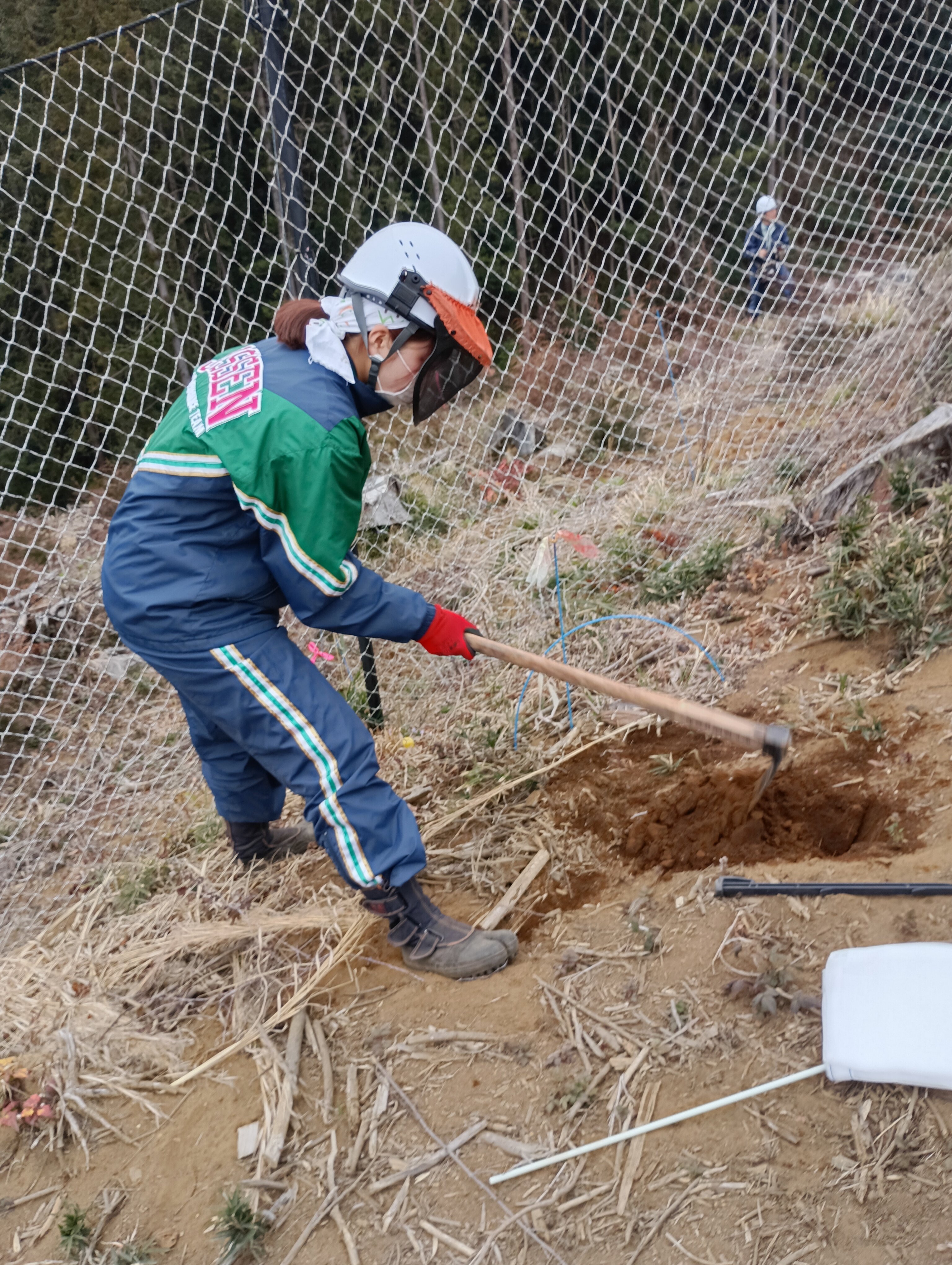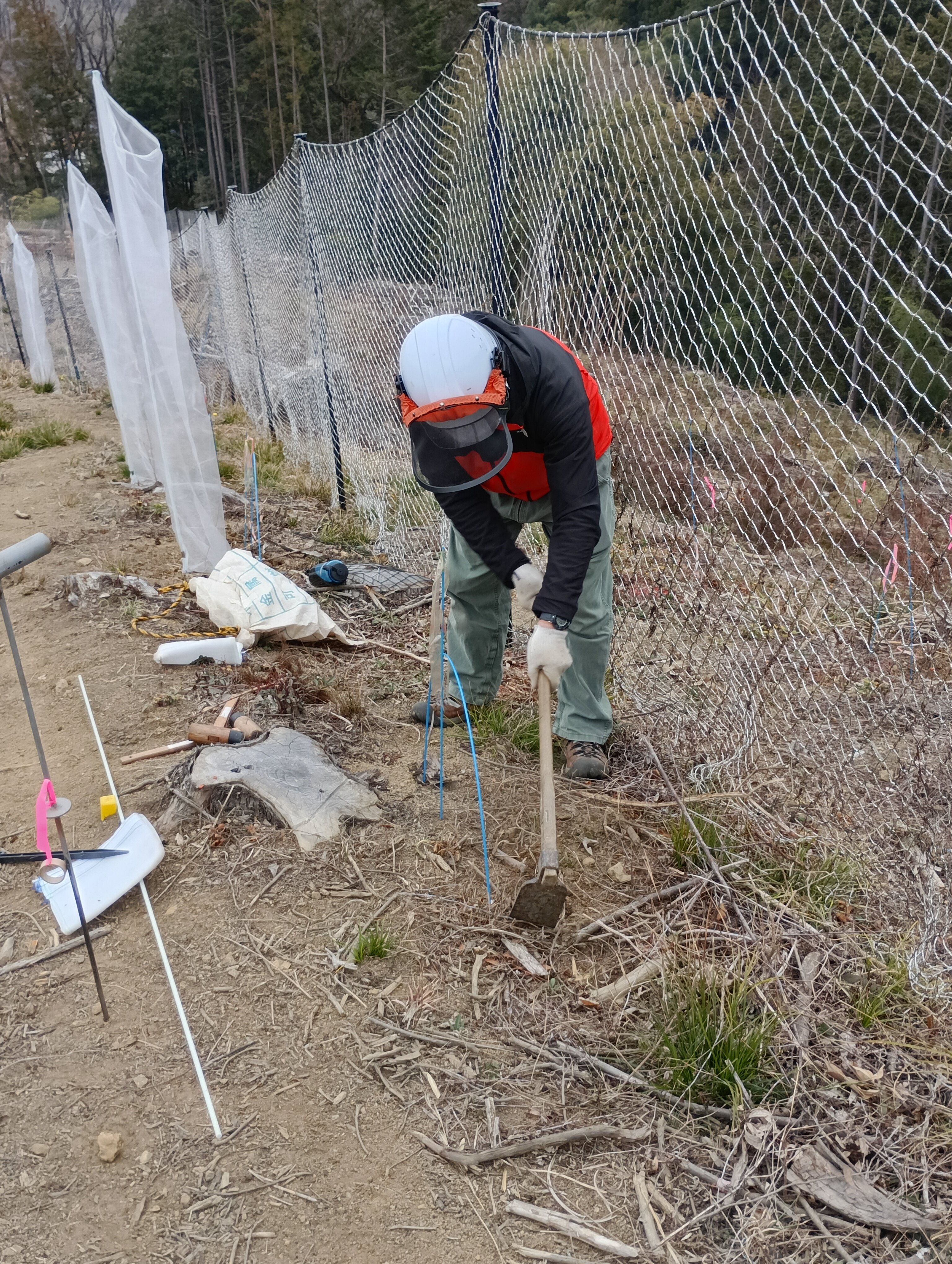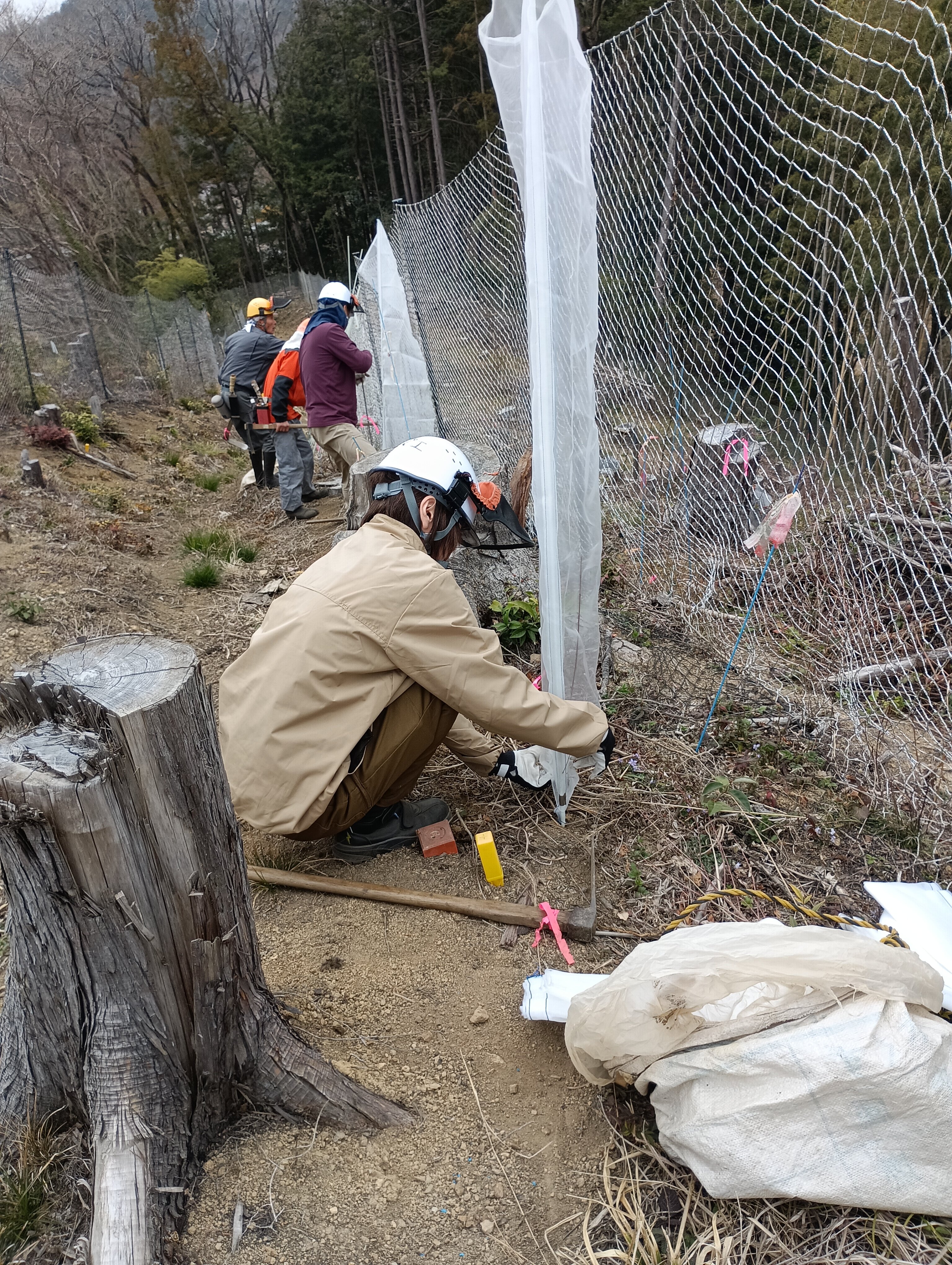 鍬で穴を掘り、苗を植え土をかけ、単木ネットをかけます。鹿に食べられないように苗を守ります。