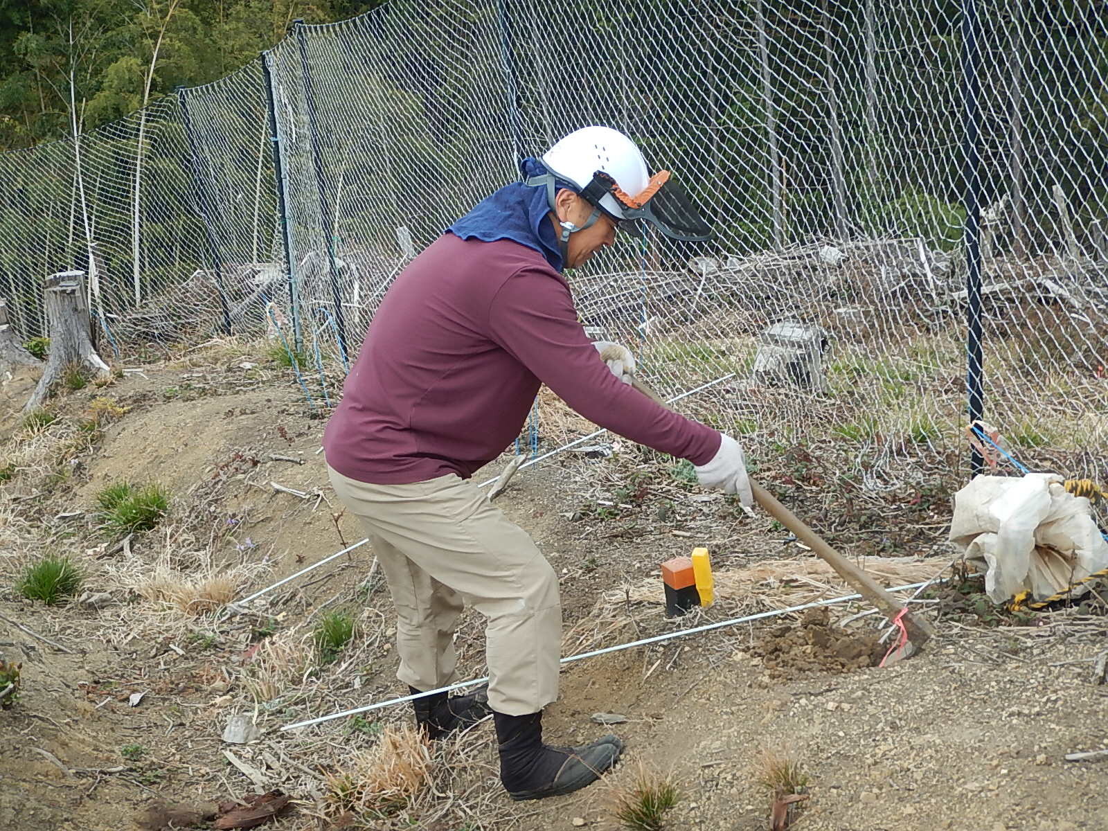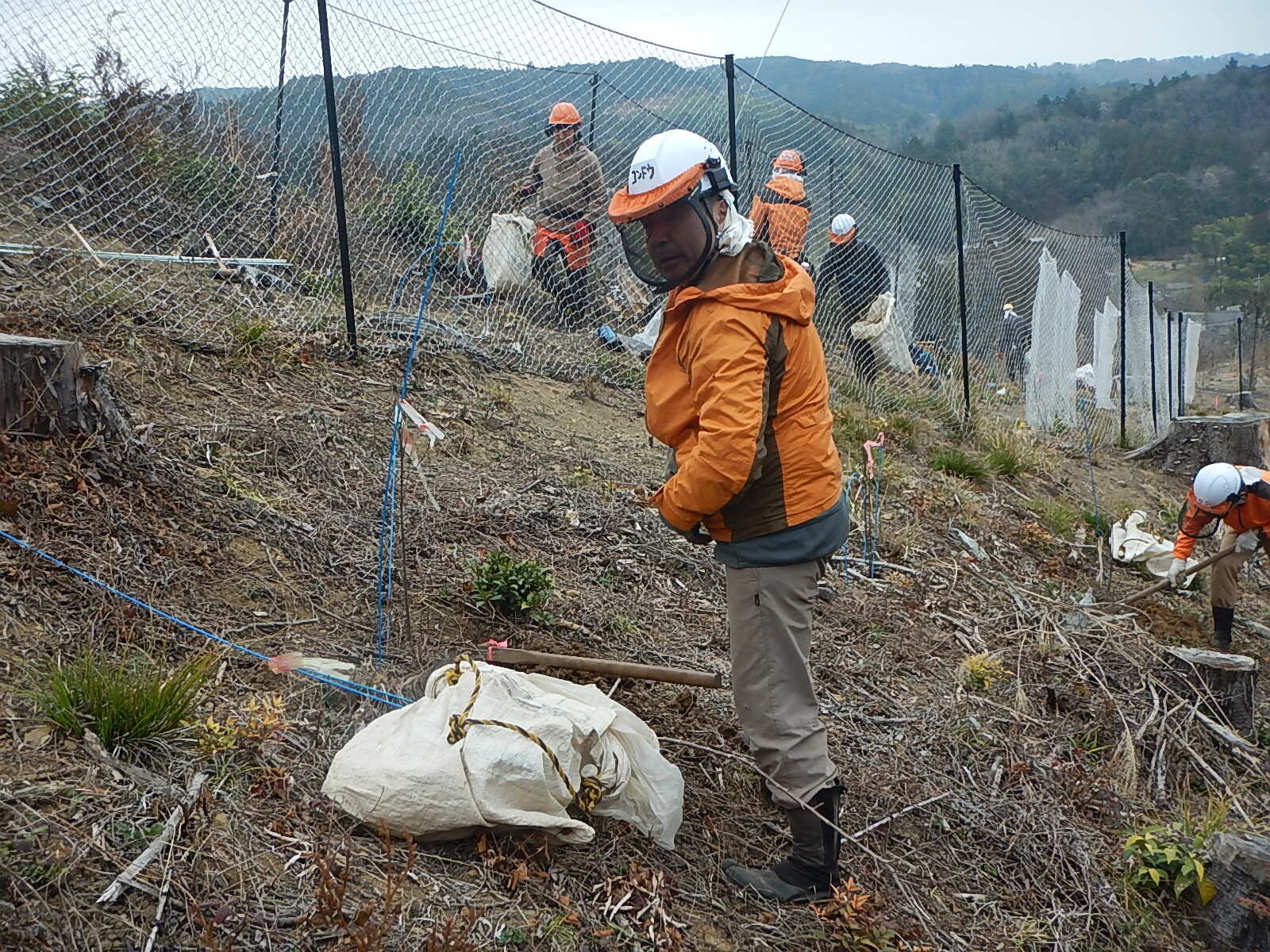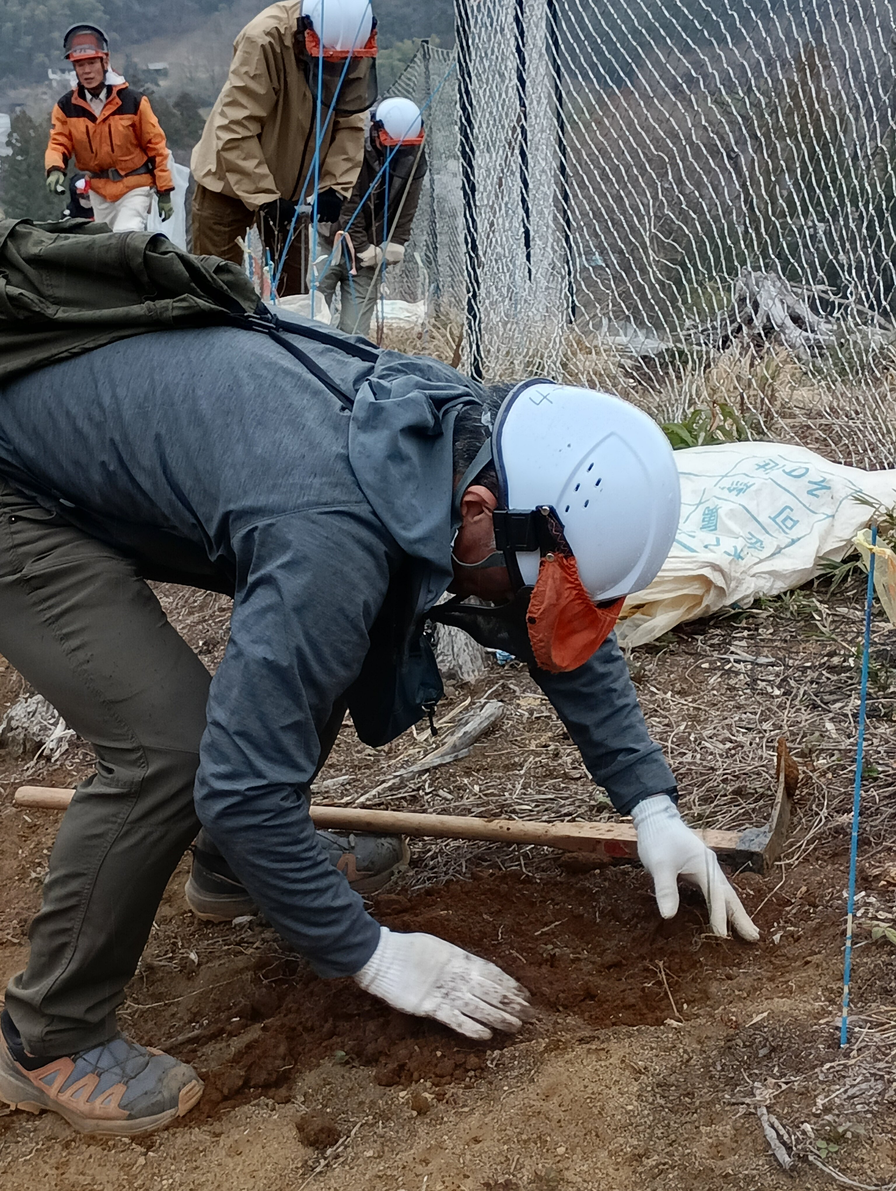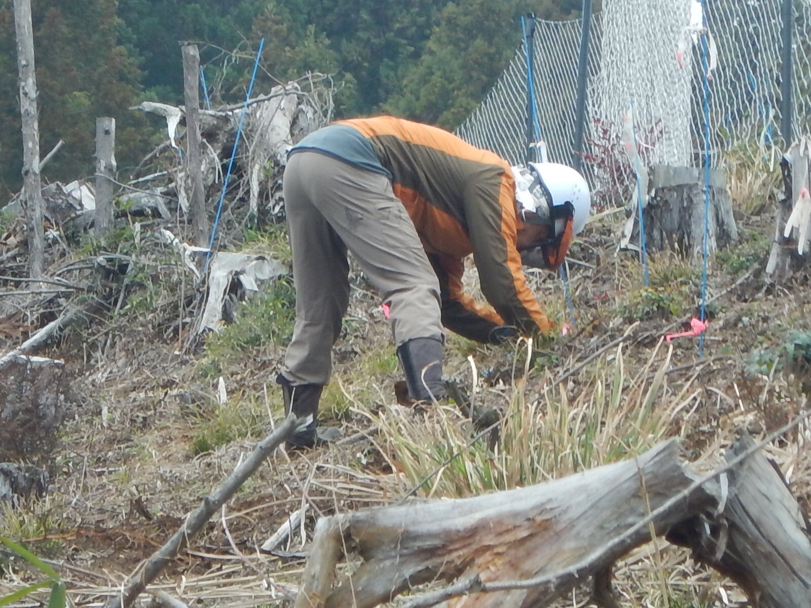鍬で穴を掘り、苗を植え土をかけ、単木ネットをかけます。鹿に食べられないように苗を守ります。