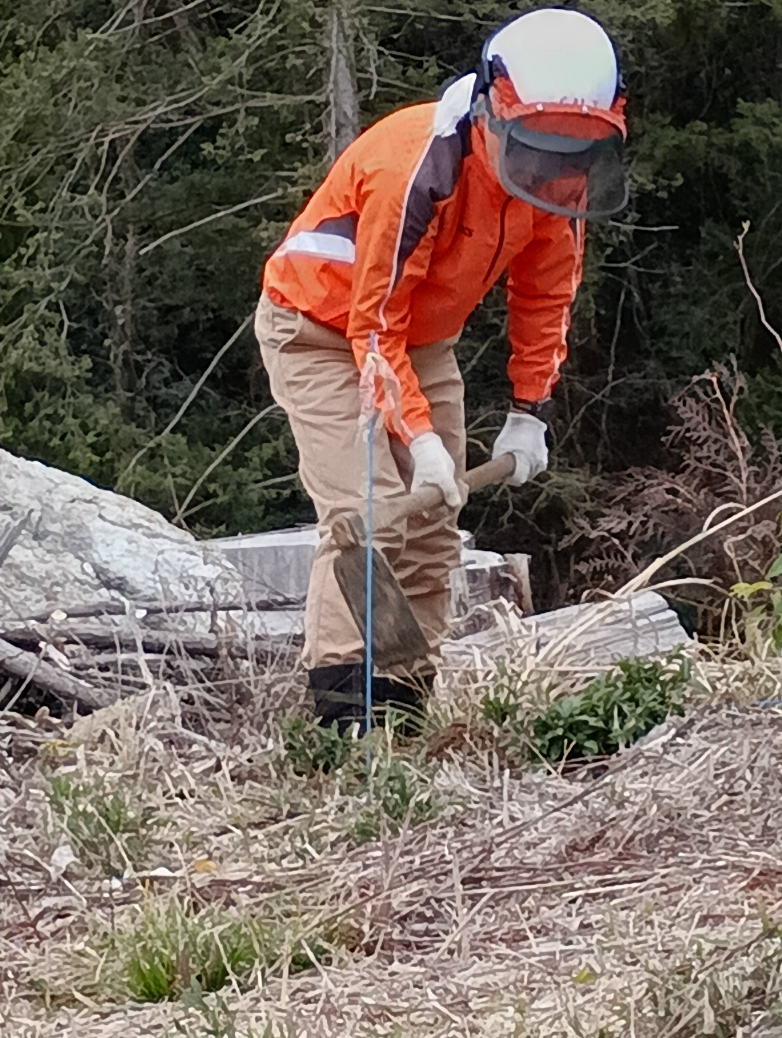 A班は鹿柵の中での作業なので、単木ネットはかけませんでした。アメリカオニアザミの駆除も行いました。まだ小さいので安全ですが、大きくなるととげが鋭くなり危険です。また、生態系を脅かすので今のうちに駆除します。
