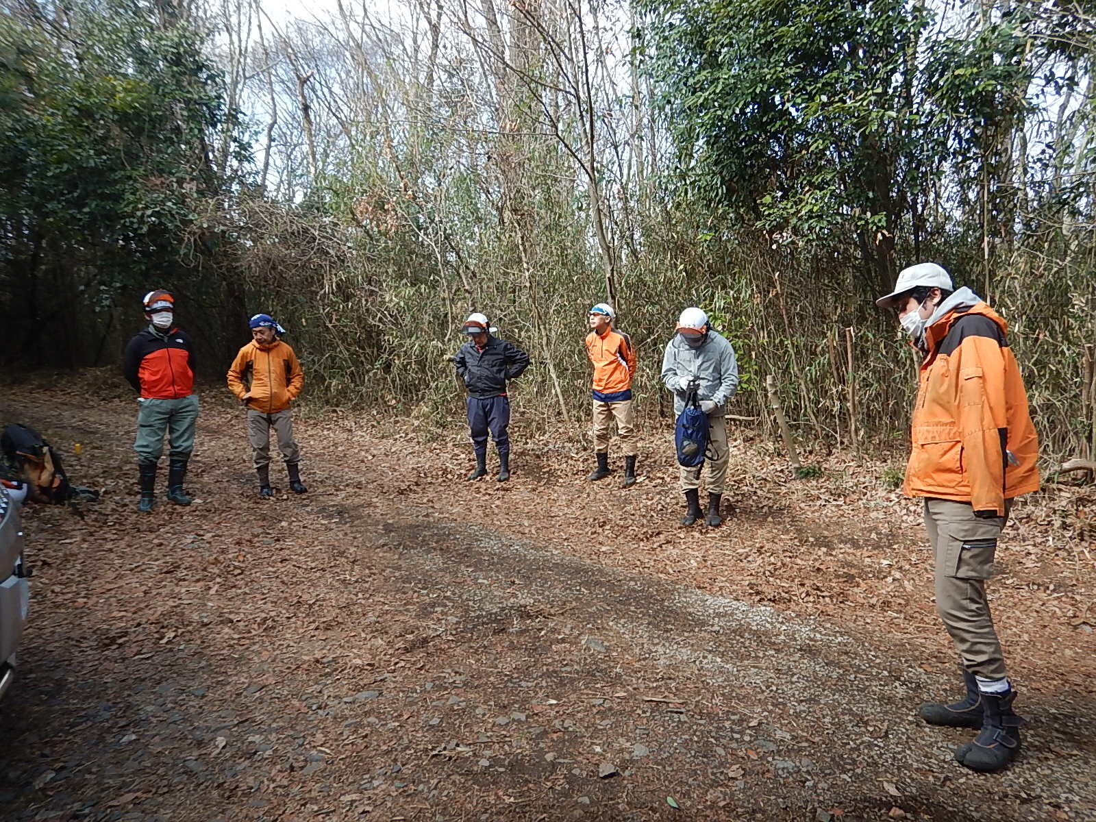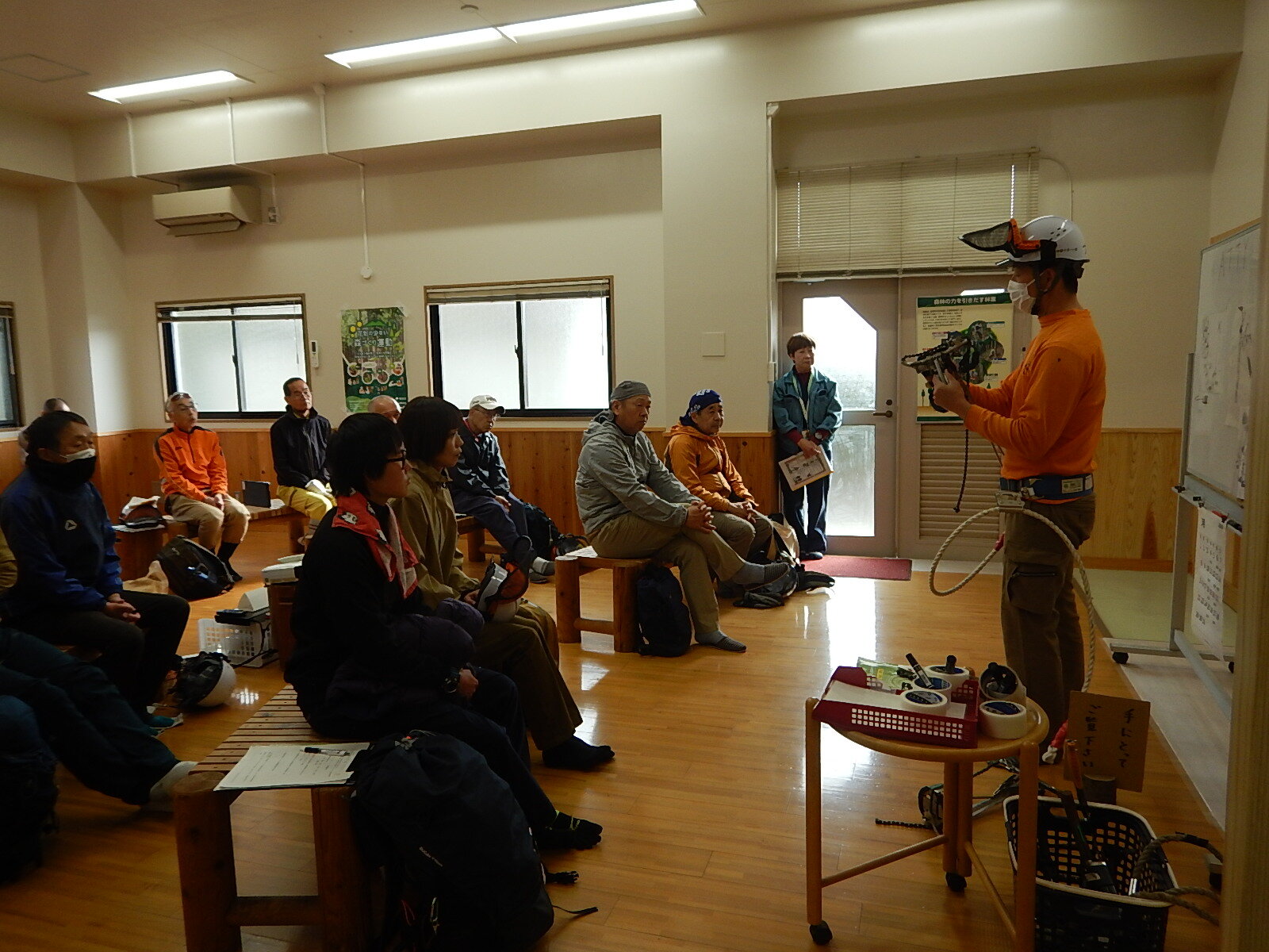事務局員、指導員、メンバーの簡単な自己紹介を行った後に安全講習を行います。ヘルメットの被り方、道具の使用方法をしっかり伝えます。