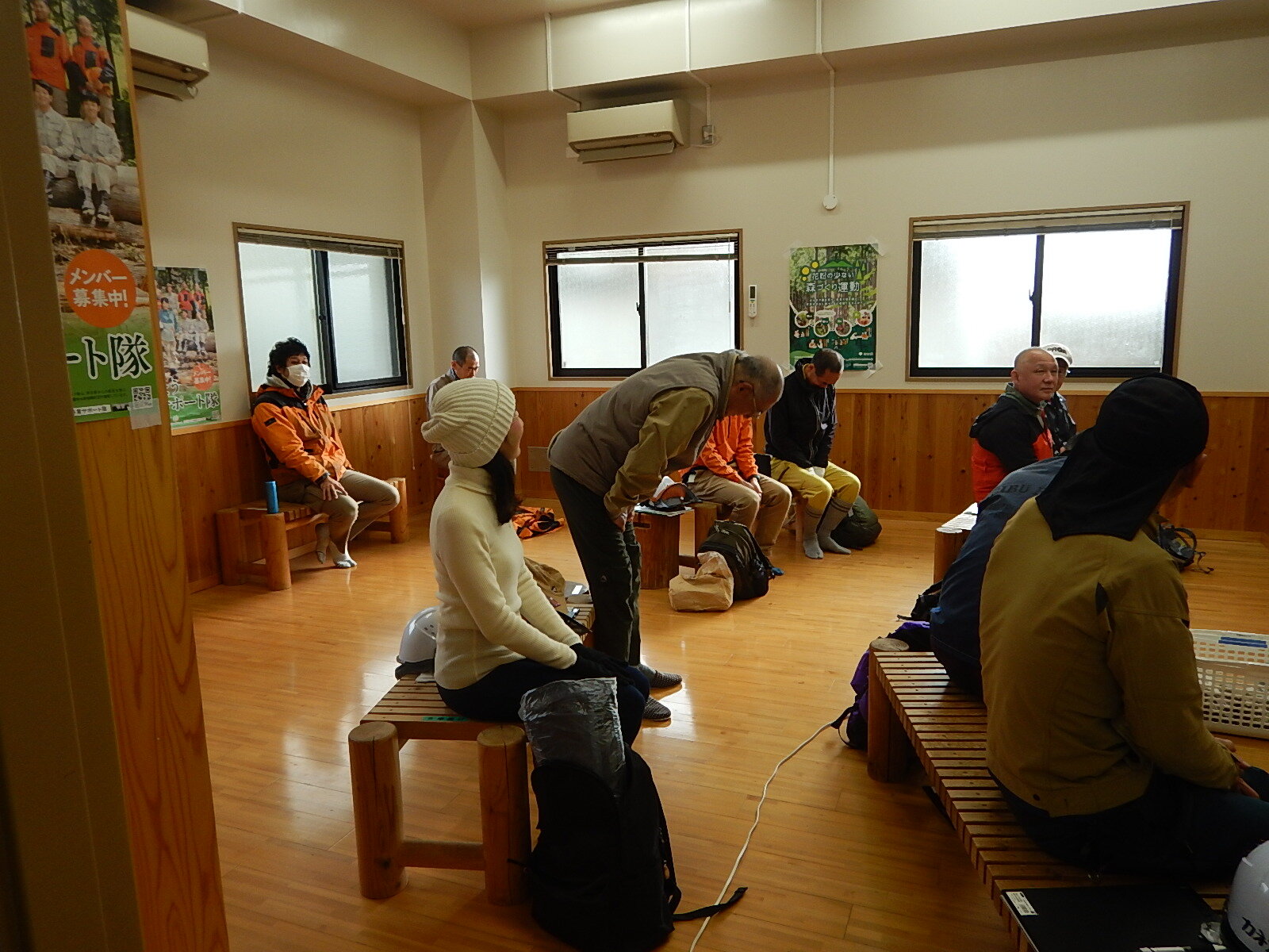 メンバーの皆さんは身支度を整え、講習室に入ります。開始時間までの間、メンバー同士で会話を楽しんだり、テキストを読んだりと思い思いに過ごします。スクリーンでは森に関するDVDの上映を行っており、熱心に見入っているメンバーの姿も見られます。多摩産材で作られたベンチに腰掛け、開始を待ちます。