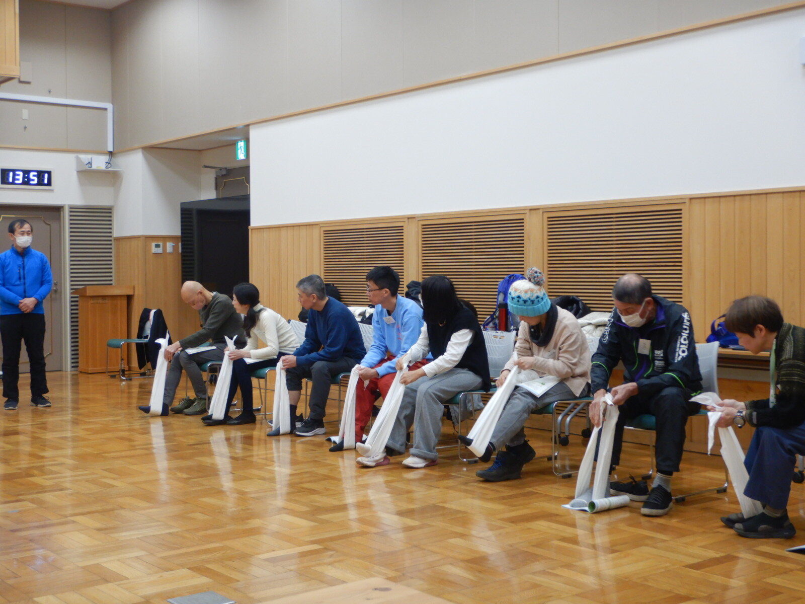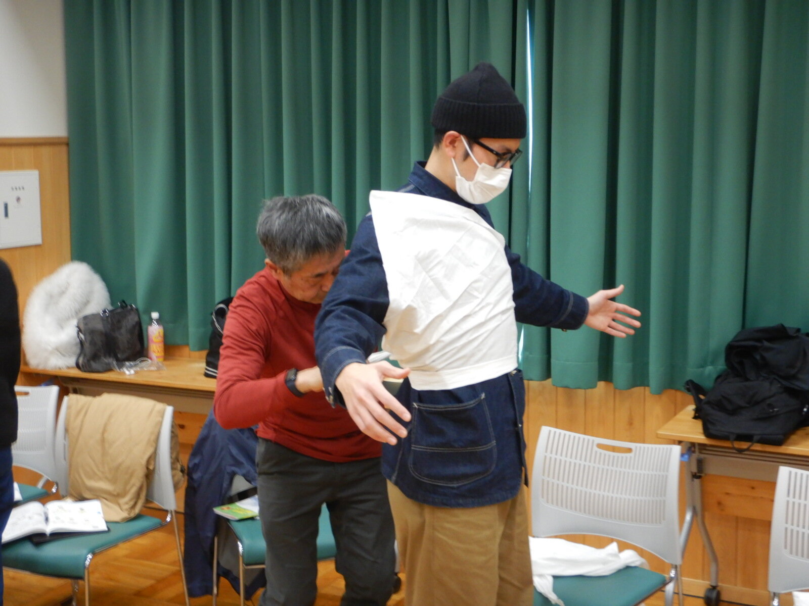 慣れない三角巾の使い方にみなさん苦戦しながらも、頭・腕・胸・膝・足などの各部位ごとに三角巾を使用した固定法を学びました。