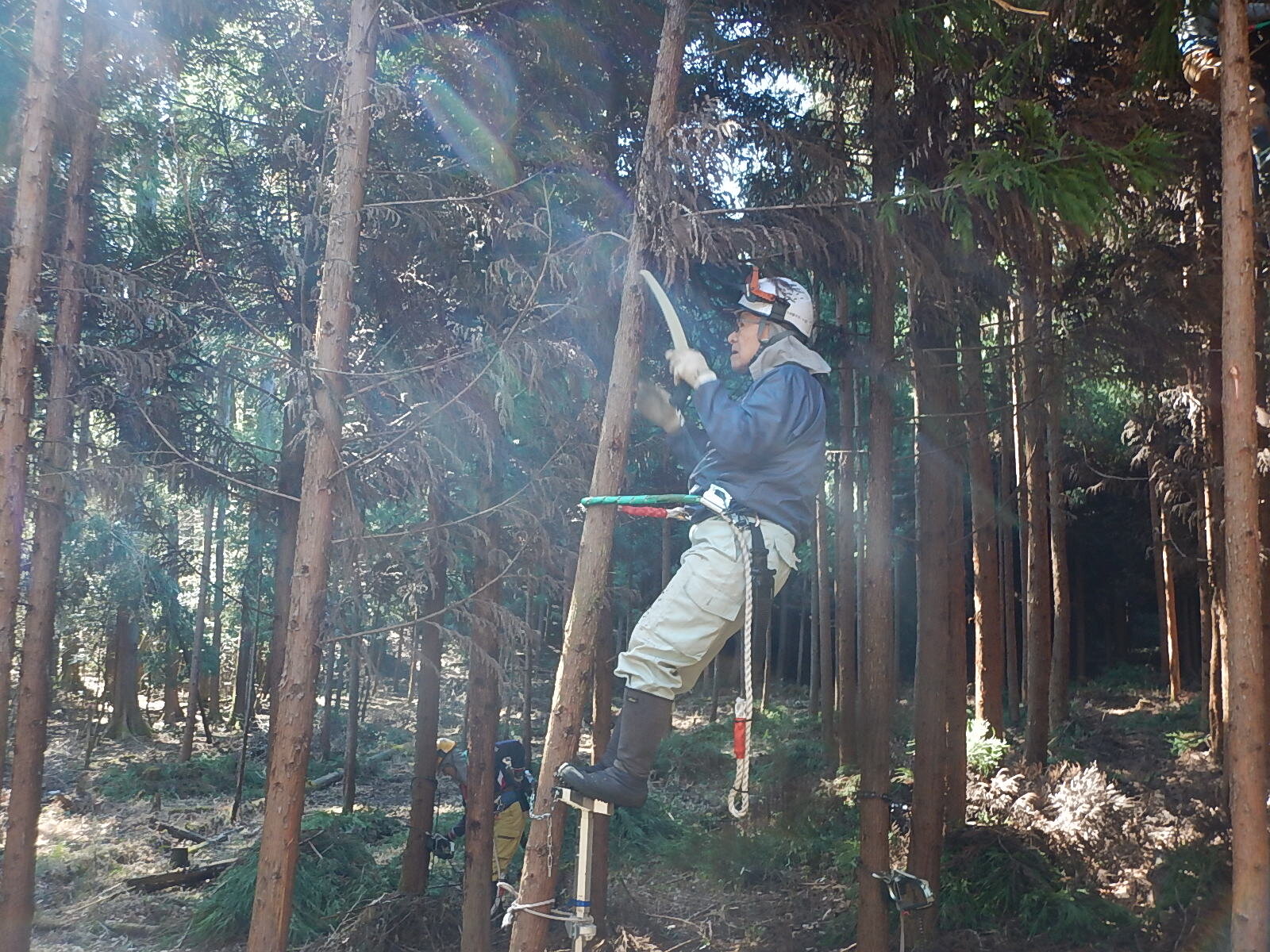 慣れてきて雑にならないよう、丁寧に肩の高さでまっすぐに鋸をひく事。胴縄を切らないよう注意すること。