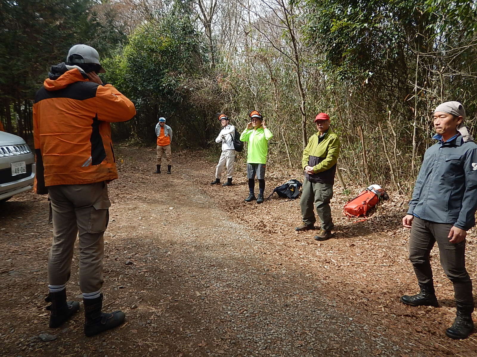 危険予知活動では、今日の活動地での注意点などを説明しました。ベテランメンバーも初心者も真剣に耳を傾けていました。