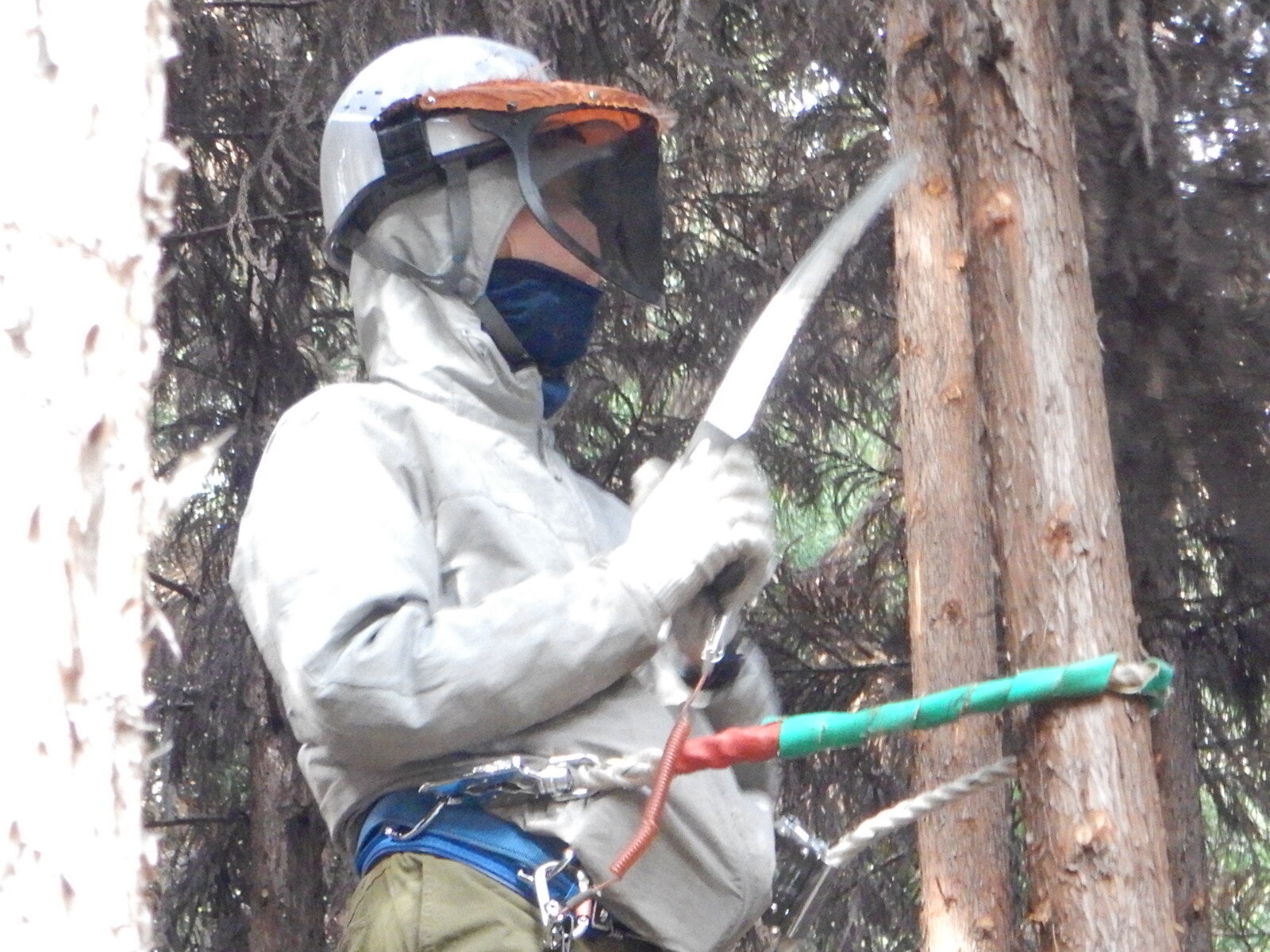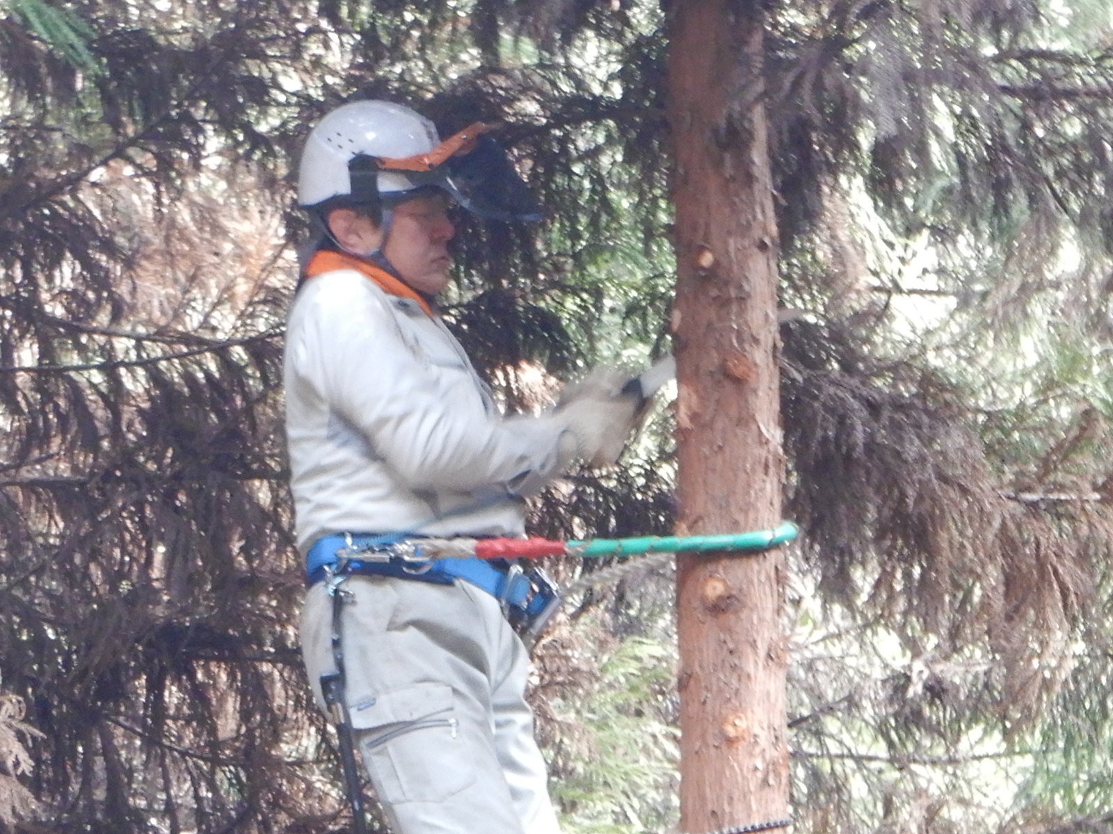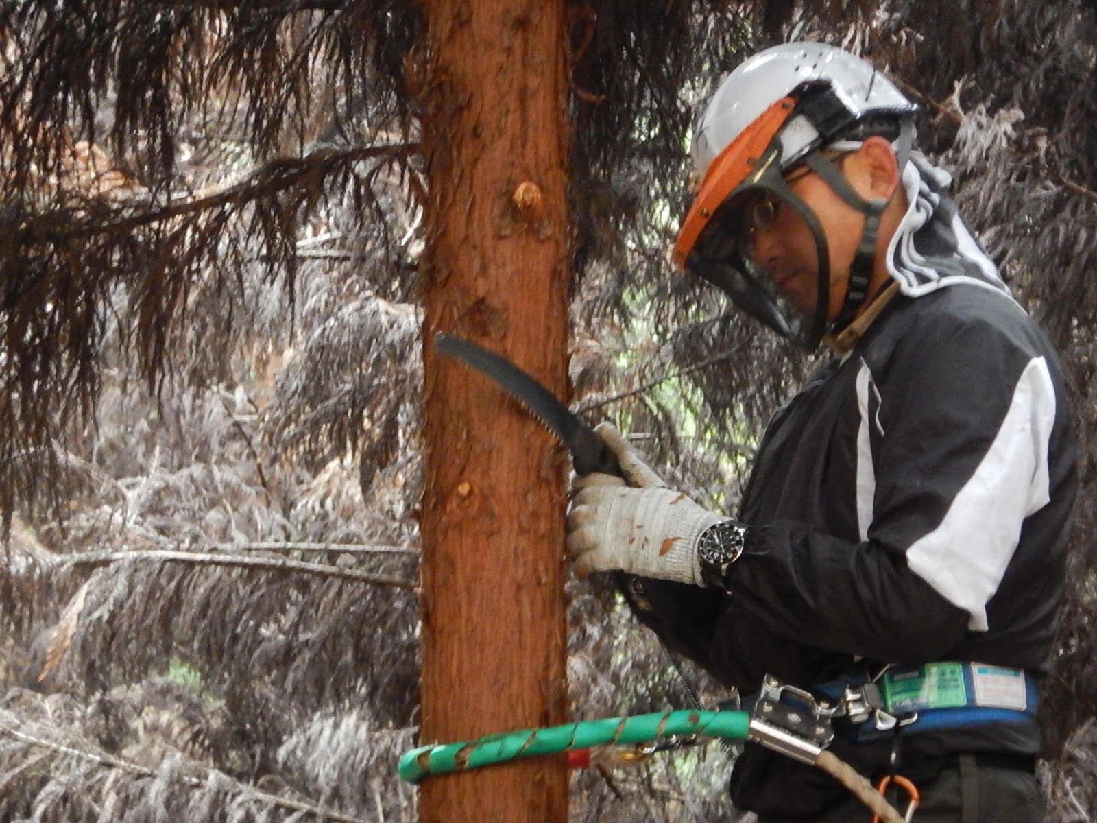 安全講習では、ヘルメットの被り方、使用する胴縄と登降機についての注意点と、鋸についての安全な使い方について説明をしました。